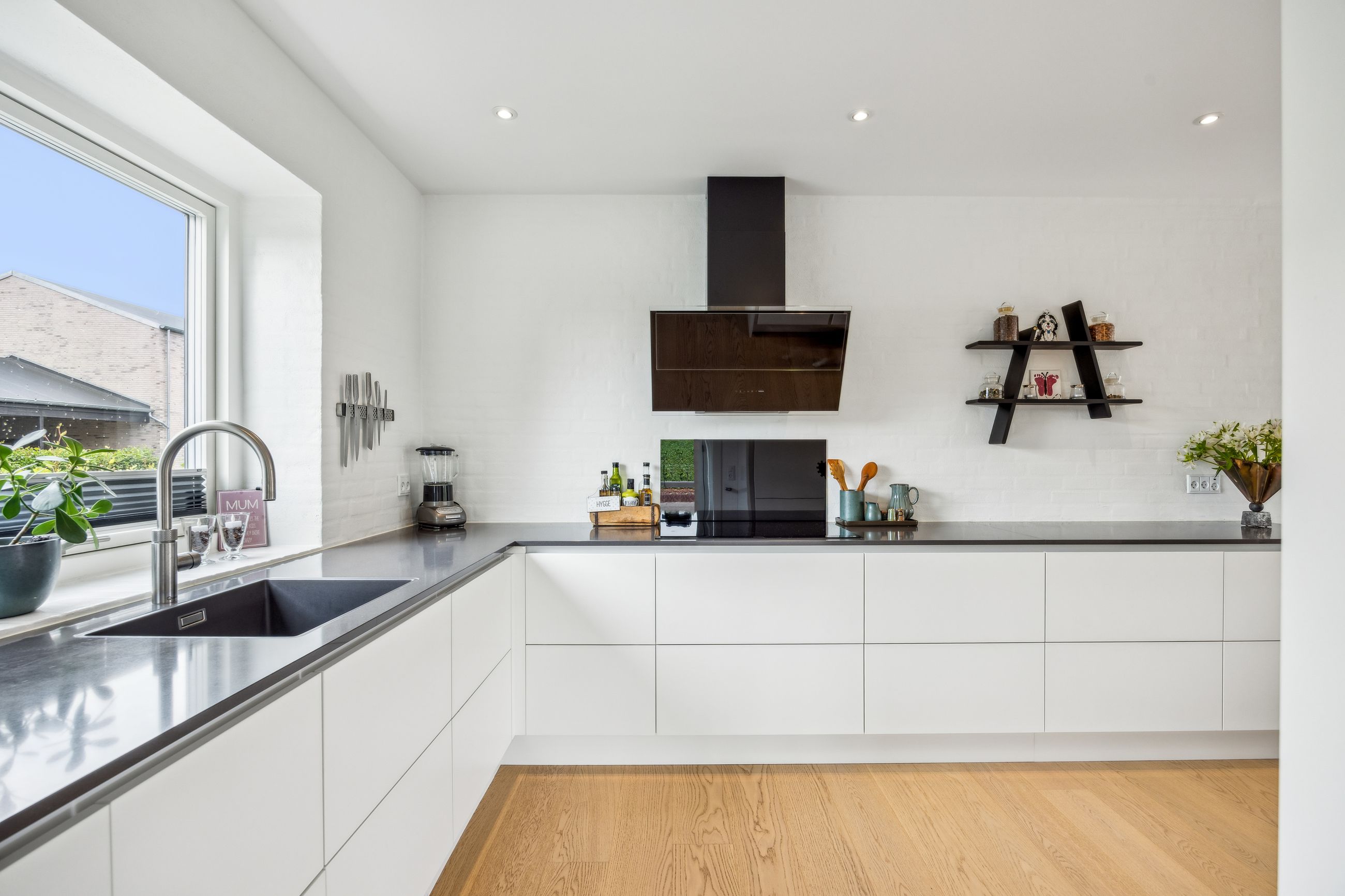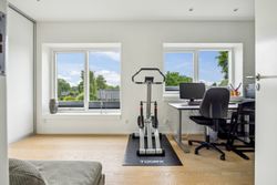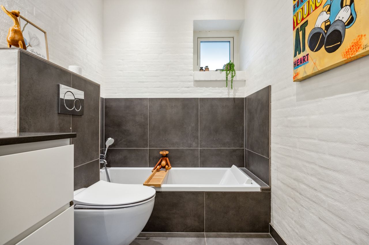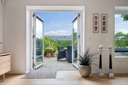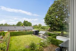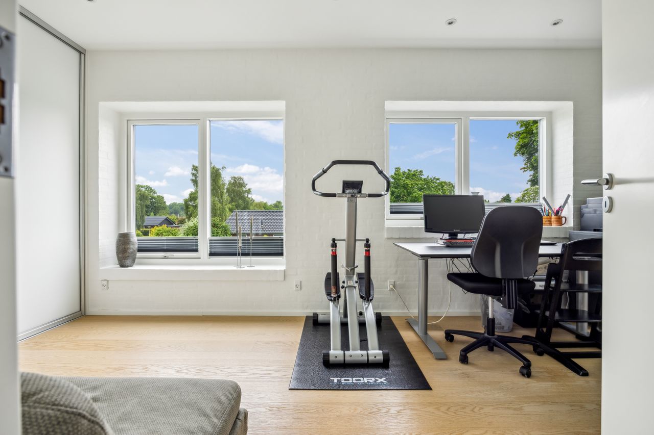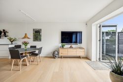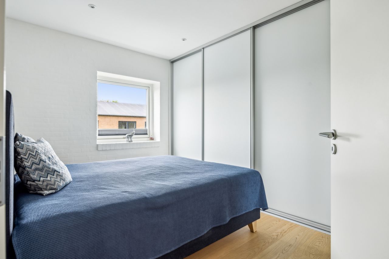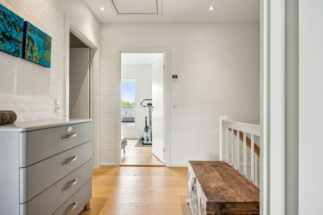 Stuen prydes af en imponerende New Yorker væg, som skaber en stilfuld atmosfære og leder videre til haven gennem en elegant dobbelt terrassedør. Køkkenet er fra Svane og udstyret med alle de moderne bekvemmeligheder, herunder en Quooker med kølerfunktion både med og uden brus samt centralstøvsuger for optimal komfort. Boligen er udstyret med gulvvarme over det hele. Parketgulvene gennem huset sikrer en varm og indbydende stemning.