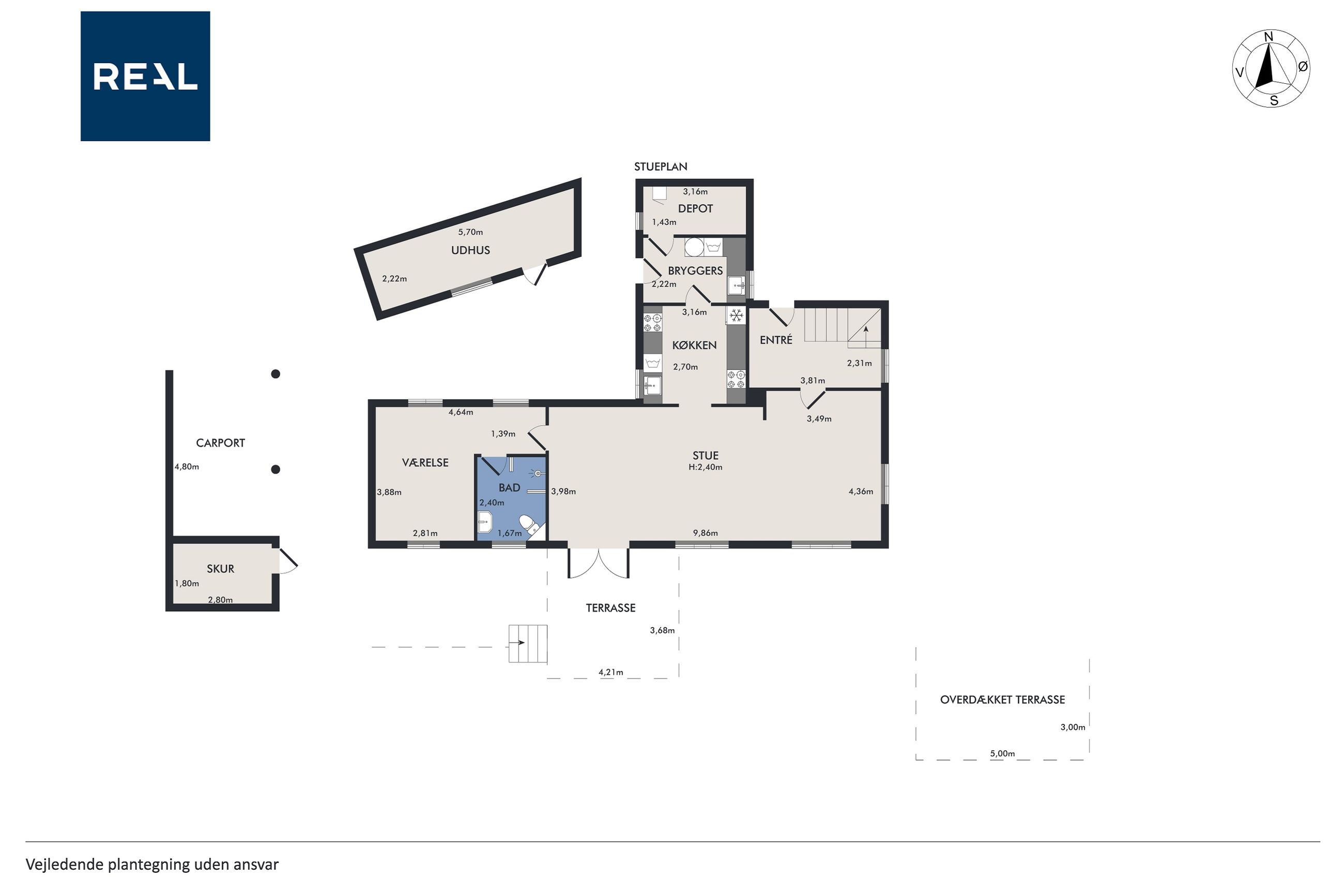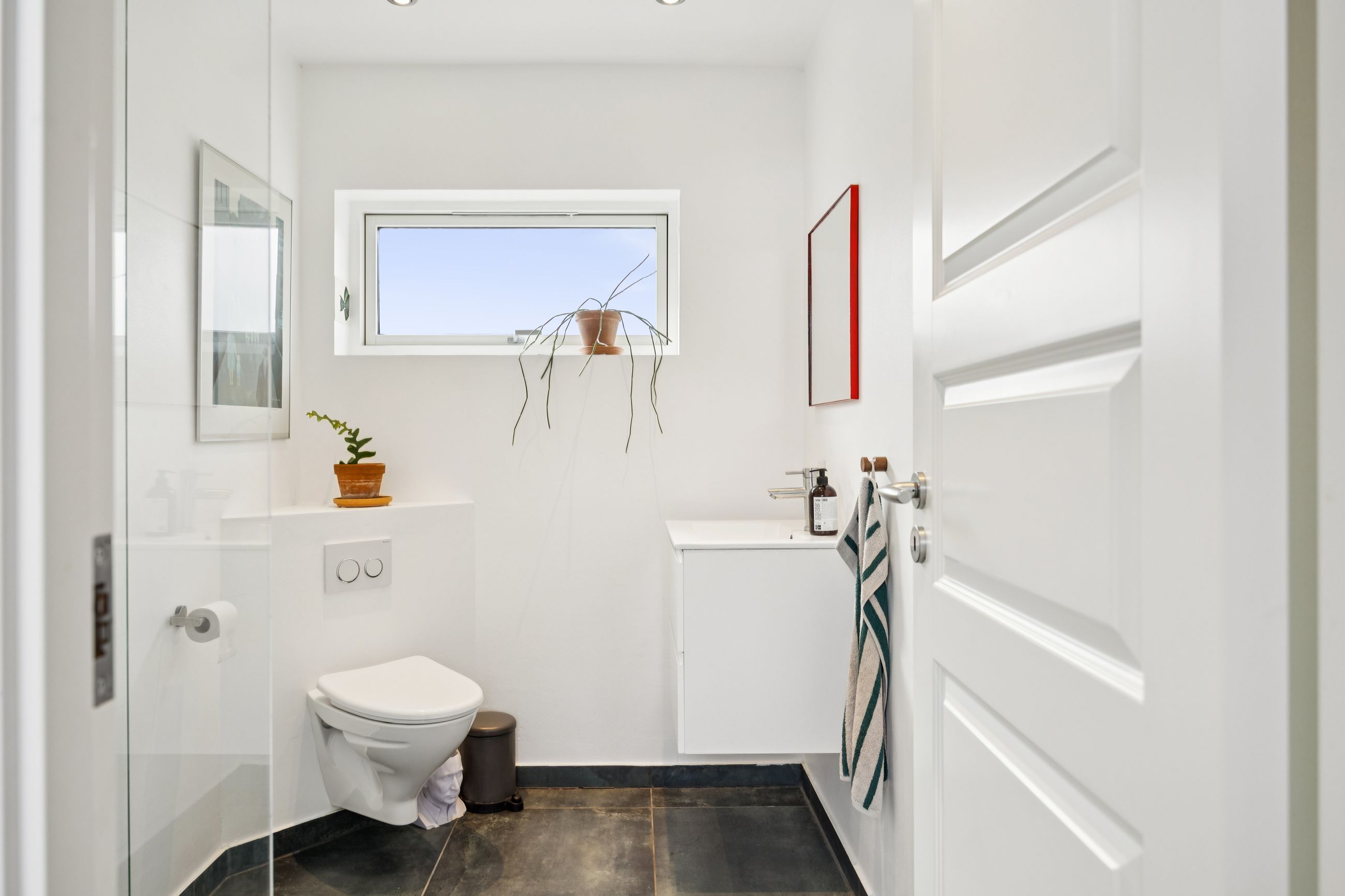 Husets hjerte er det store alrum, der smelter sammen med stuen. Her kan du samle familie og venner omkring et langbord, mens du nyder den åbne forbindelse til det moderne køkken. Køkkenet er praktisk forbundet med bryggerset samt et opbevaringsrum/viktualierum, hvilket gør hverdagen både nemmere og mere organiseret. I stueplan finder du også forældresoveværelset med eget badeværelse – en luksus som enhver vil sætte pris på.