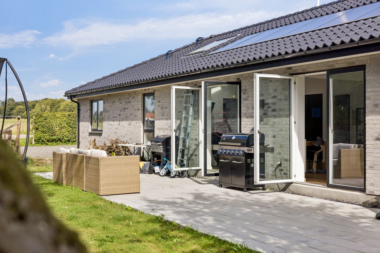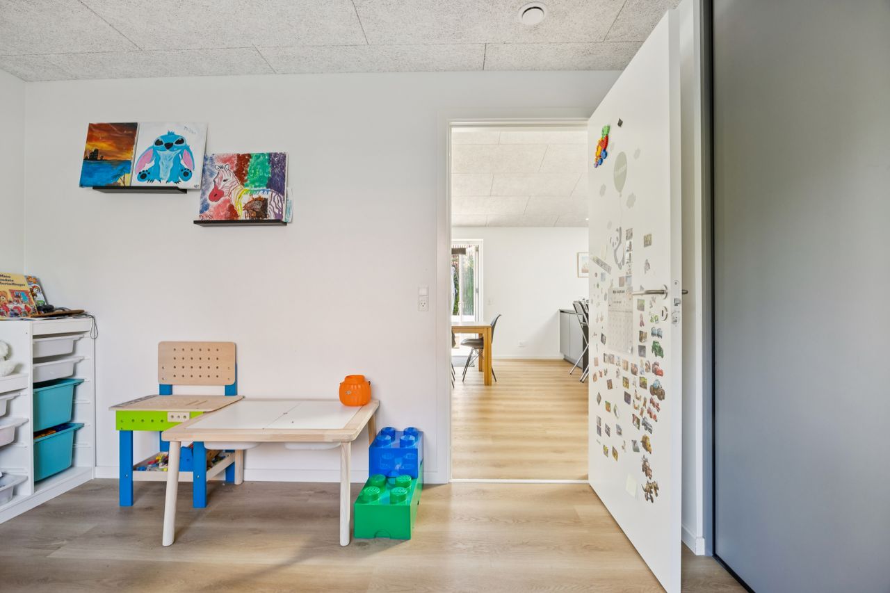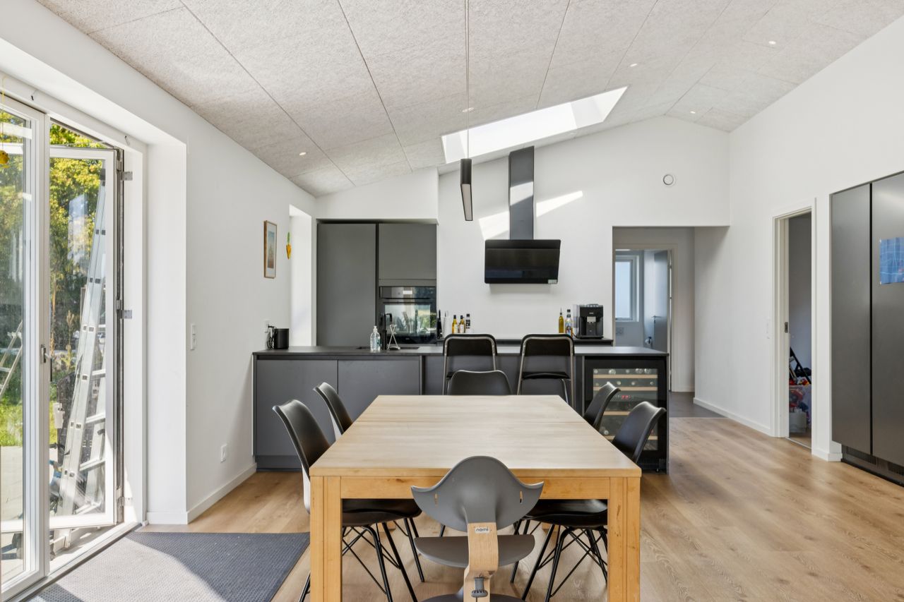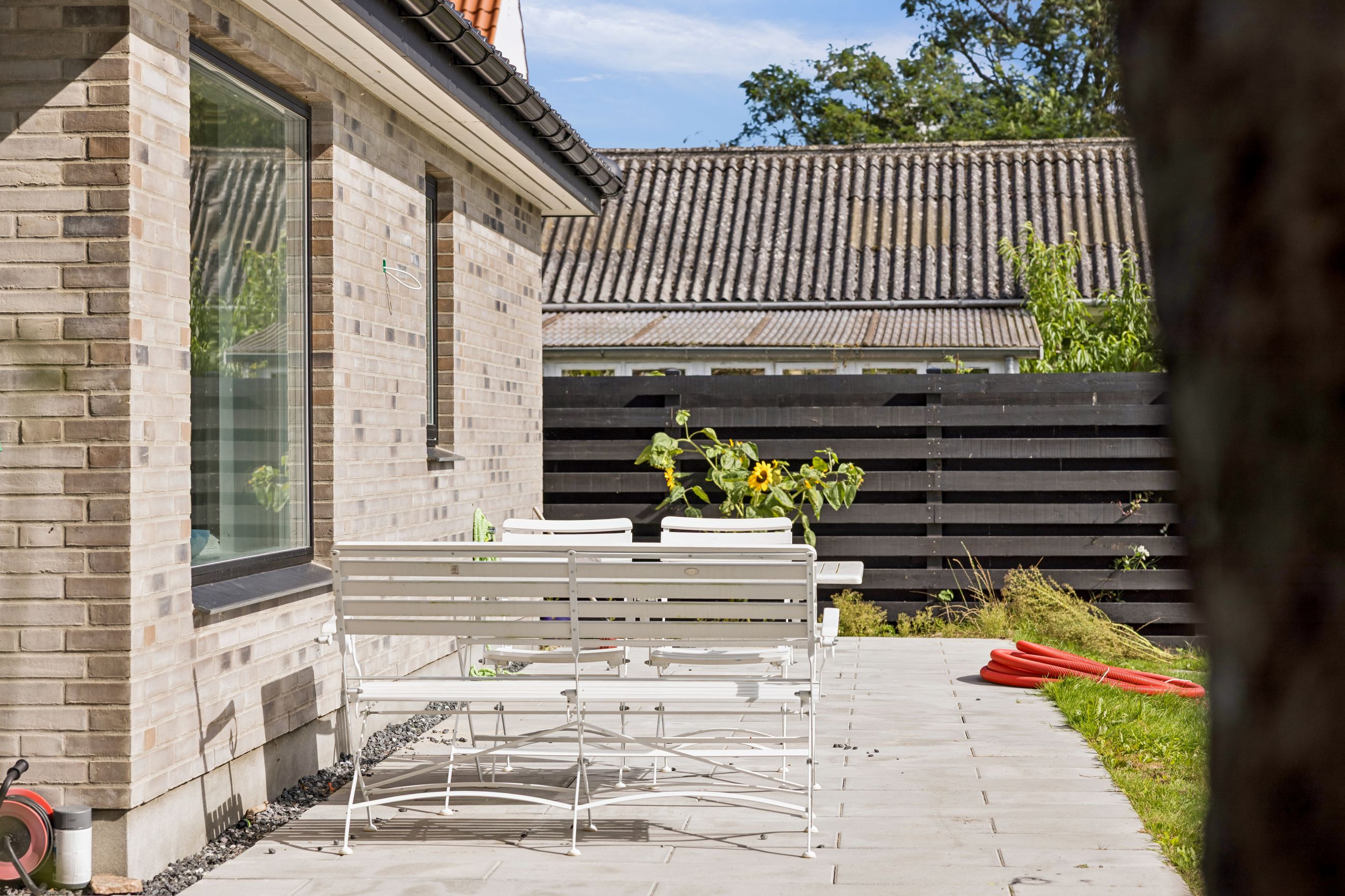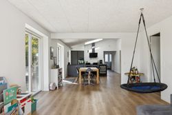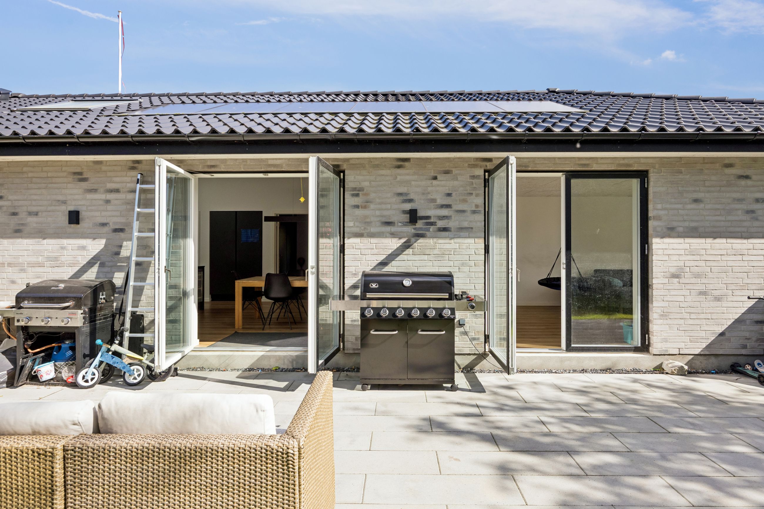 Inde i villaen finder du fire store værelser, der giver masser af plads til både børn og voksne. Det åbne køkken-alrum fungerer som husets hjerte, hvor familien kan samles om måltiderne eller hygge sig i stuen med direkte adgang til en solrig terrasse. Terrassen er flisebelagt og omgivet af en gangsti, der fører rundt om huset - perfekt til udendørs afslapning eller sociale sammenkomster.