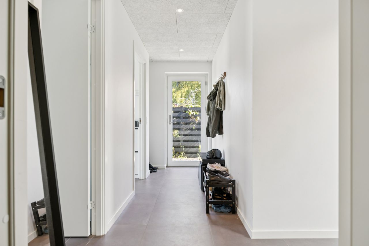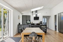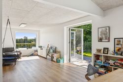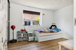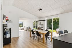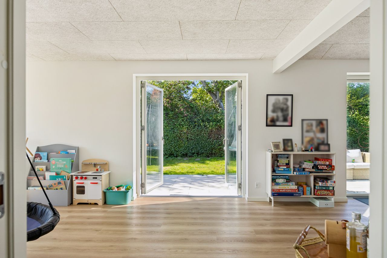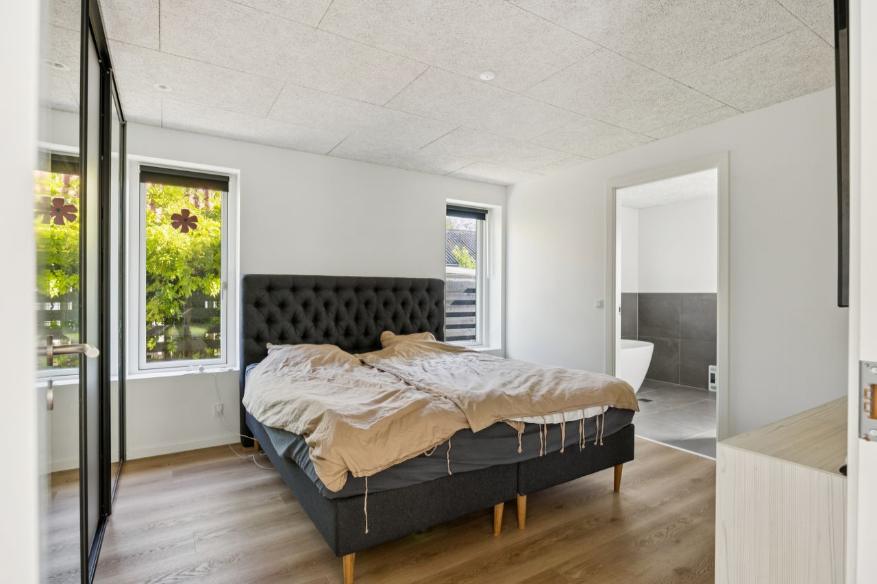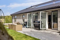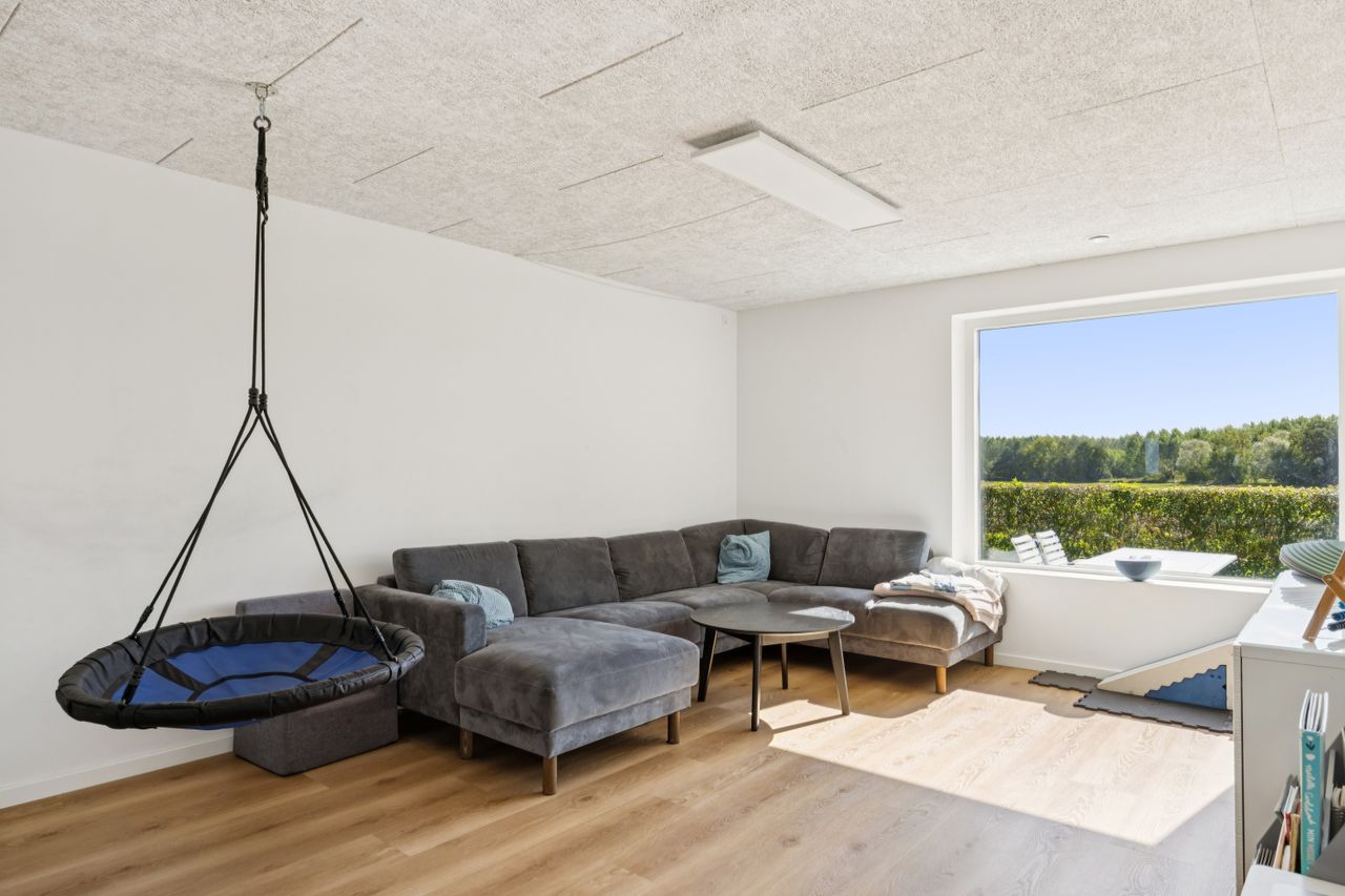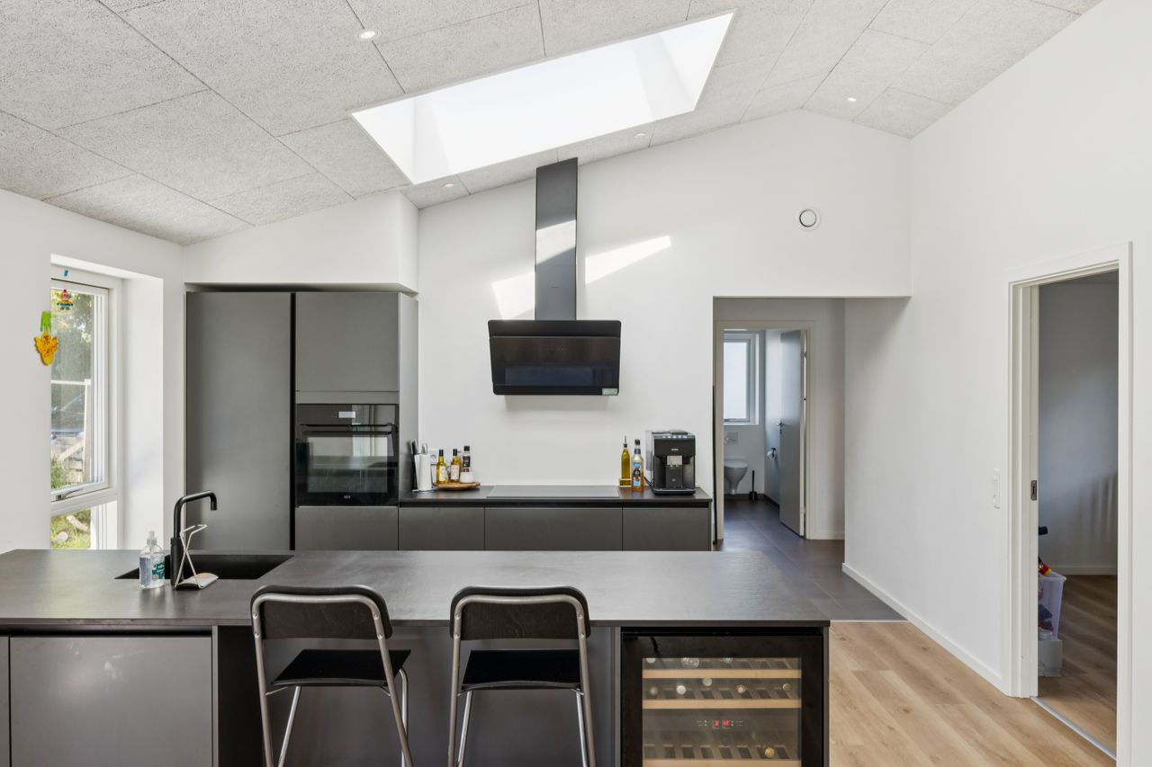 Inde i villaen finder du fire store værelser, der giver masser af plads til både børn og voksne. Det åbne køkken-alrum fungerer som husets hjerte, hvor familien kan samles om måltiderne eller hygge sig i stuen med direkte adgang til en solrig terrasse. Terrassen er flisebelagt og omgivet af en gangsti, der fører rundt om huset - perfekt til udendørs afslapning eller sociale sammenkomster.