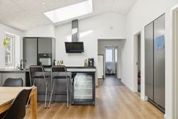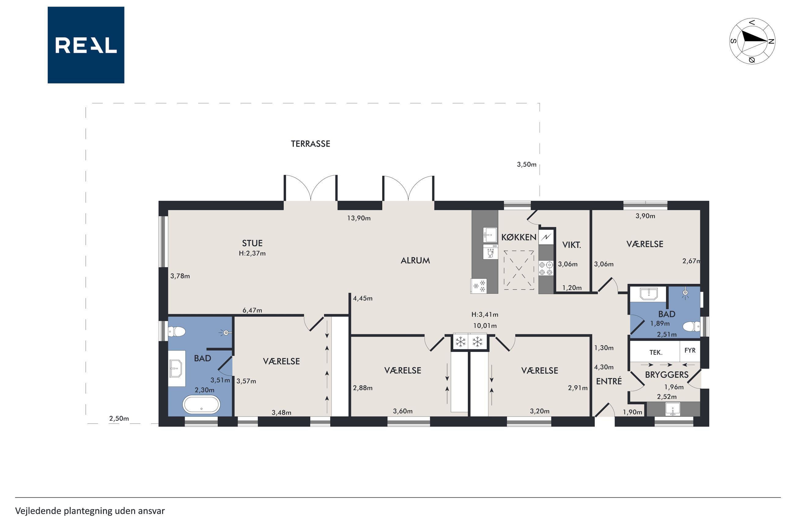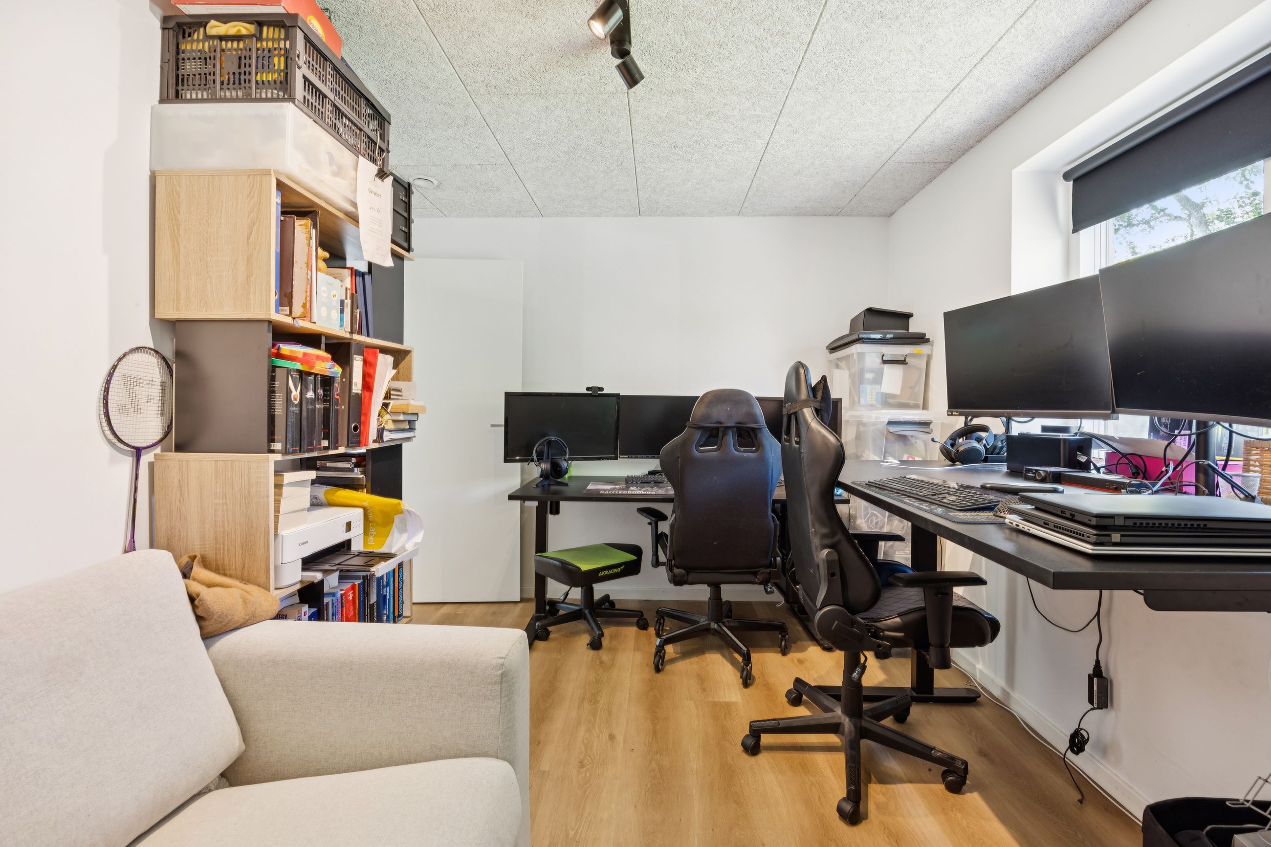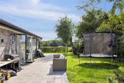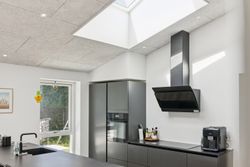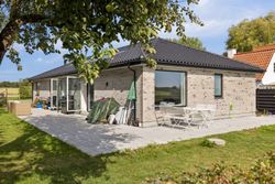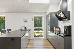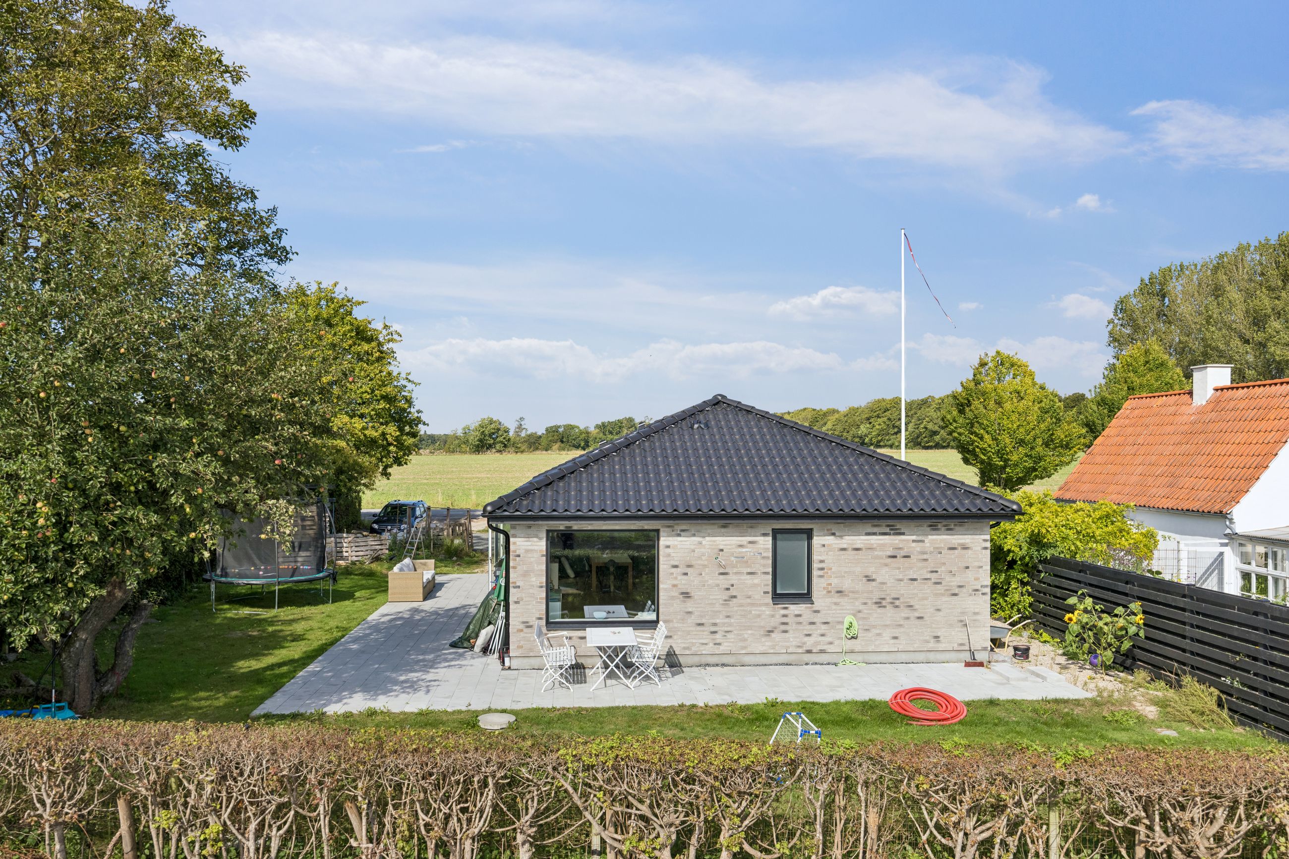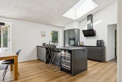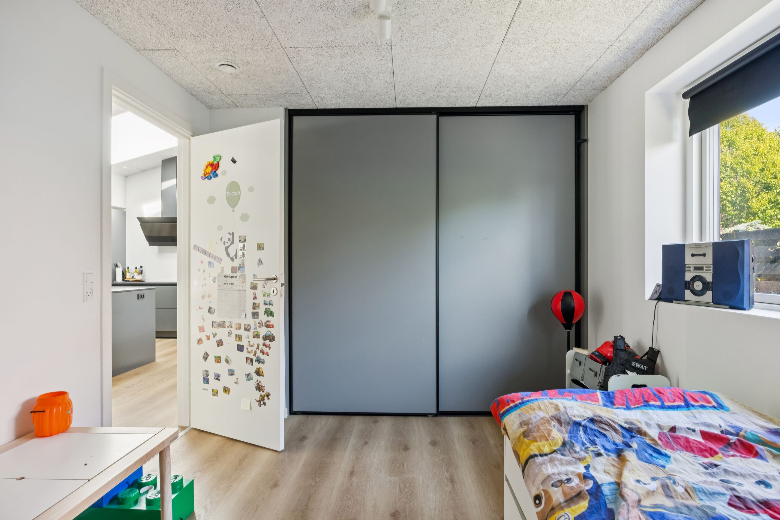 Inde i villaen finder du fire store værelser, der giver masser af plads til både børn og voksne. Det åbne køkken-alrum fungerer som husets hjerte, hvor familien kan samles om måltiderne eller hygge sig i stuen med direkte adgang til en solrig terrasse. Terrassen er flisebelagt og omgivet af en gangsti, der fører rundt om huset - perfekt til udendørs afslapning eller sociale sammenkomster.