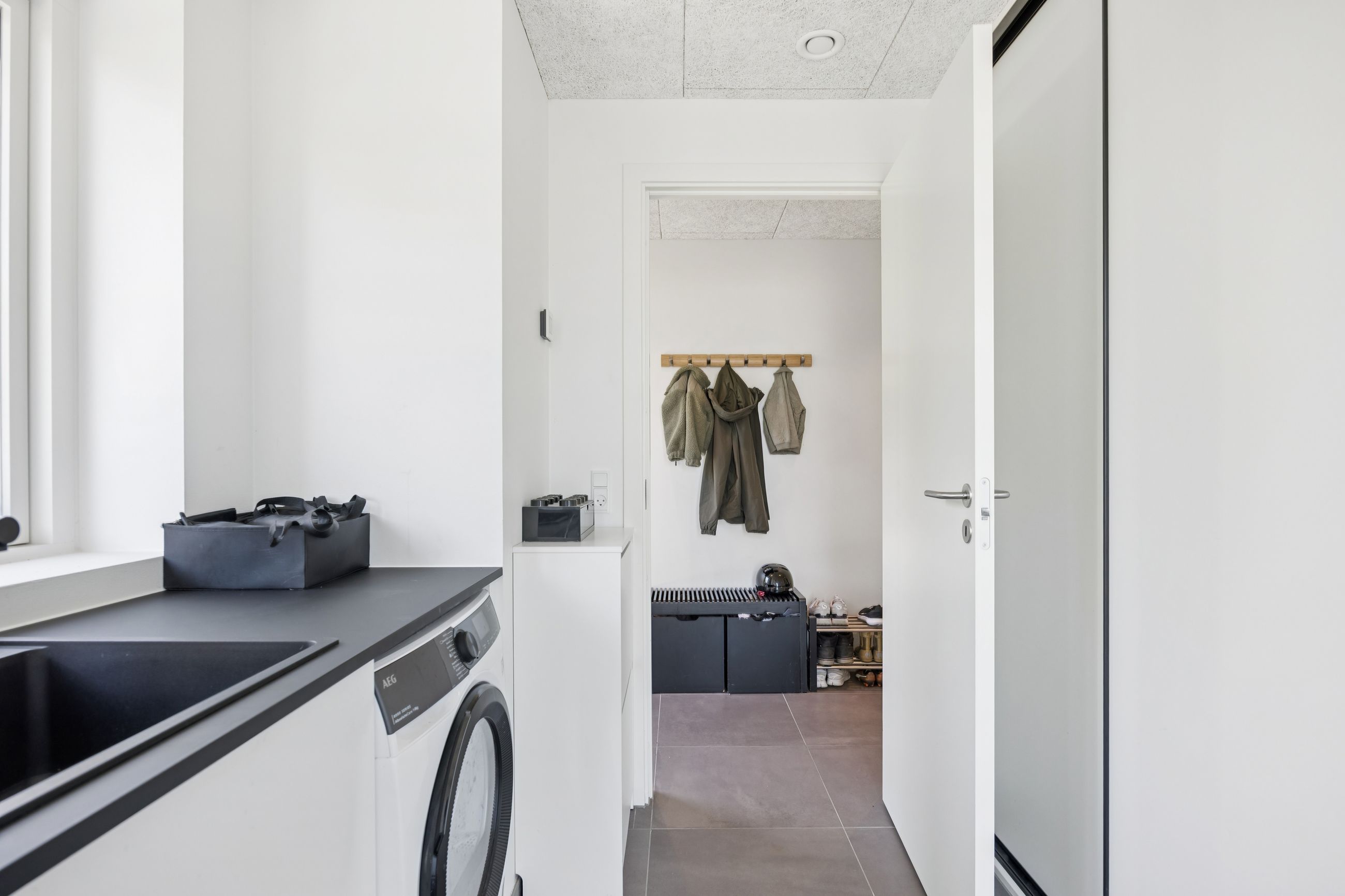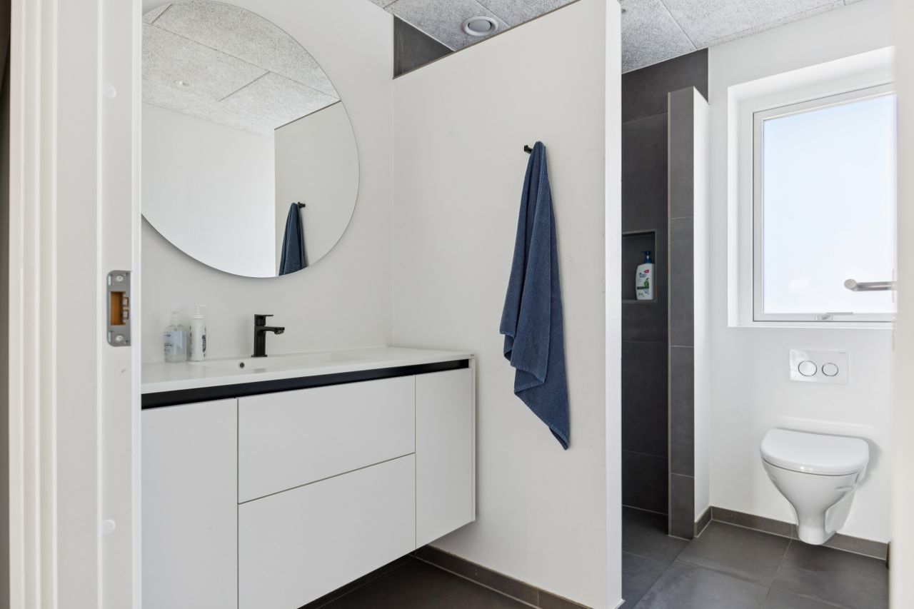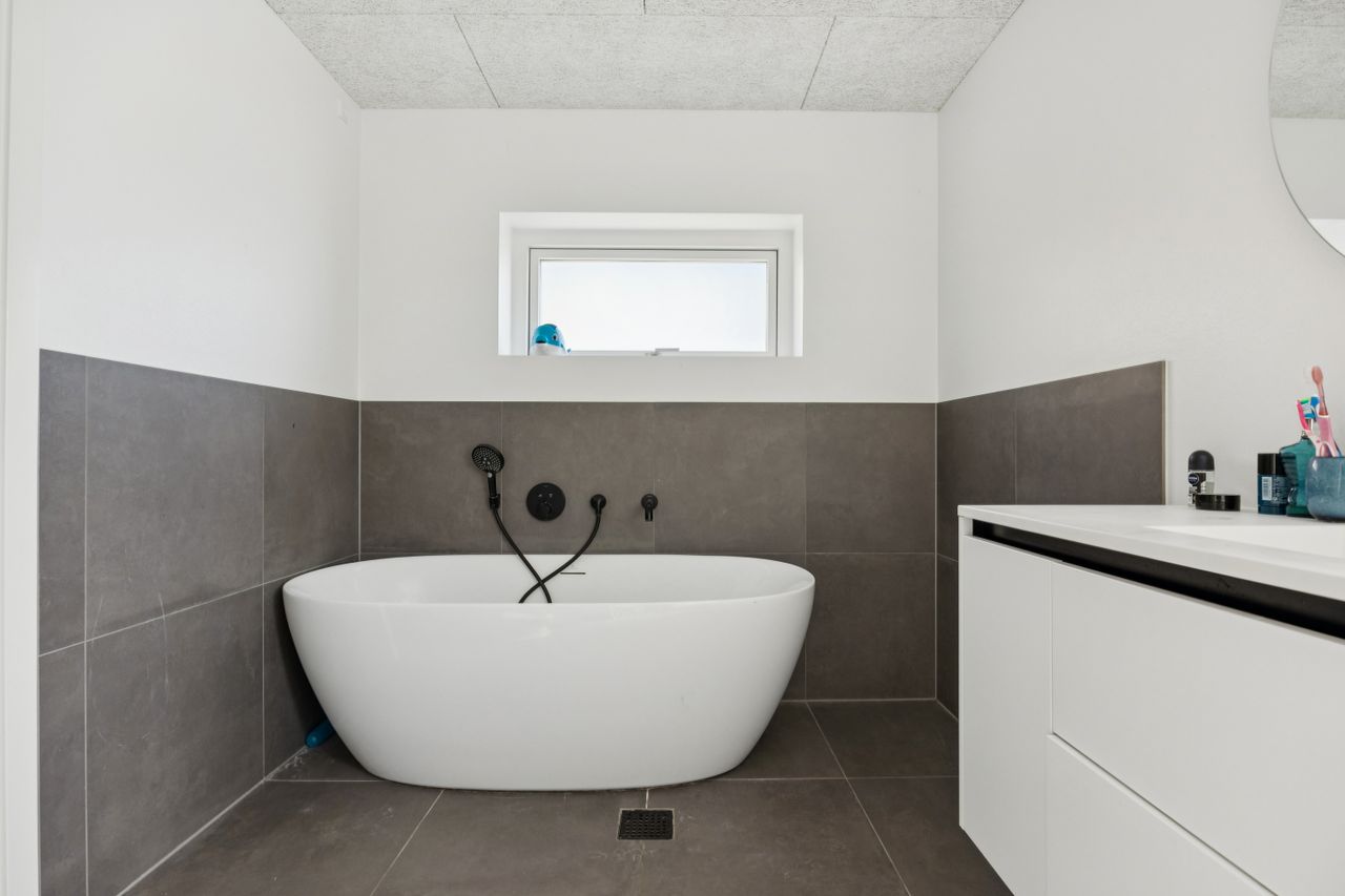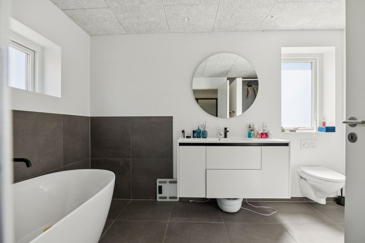 Villaens to badeværelser er praktisk opdelt med separate områder for voksne og børn, hvilket gør morgenrutinerne nemmere for alle familiemedlemmer. Hele boligen har gulvvarme drevet af en effektiv luft-til-vand varmepumpe kombineret med solceller på taget, hvilket sikrer lavere energiforbrug og et A2020 energimærke.