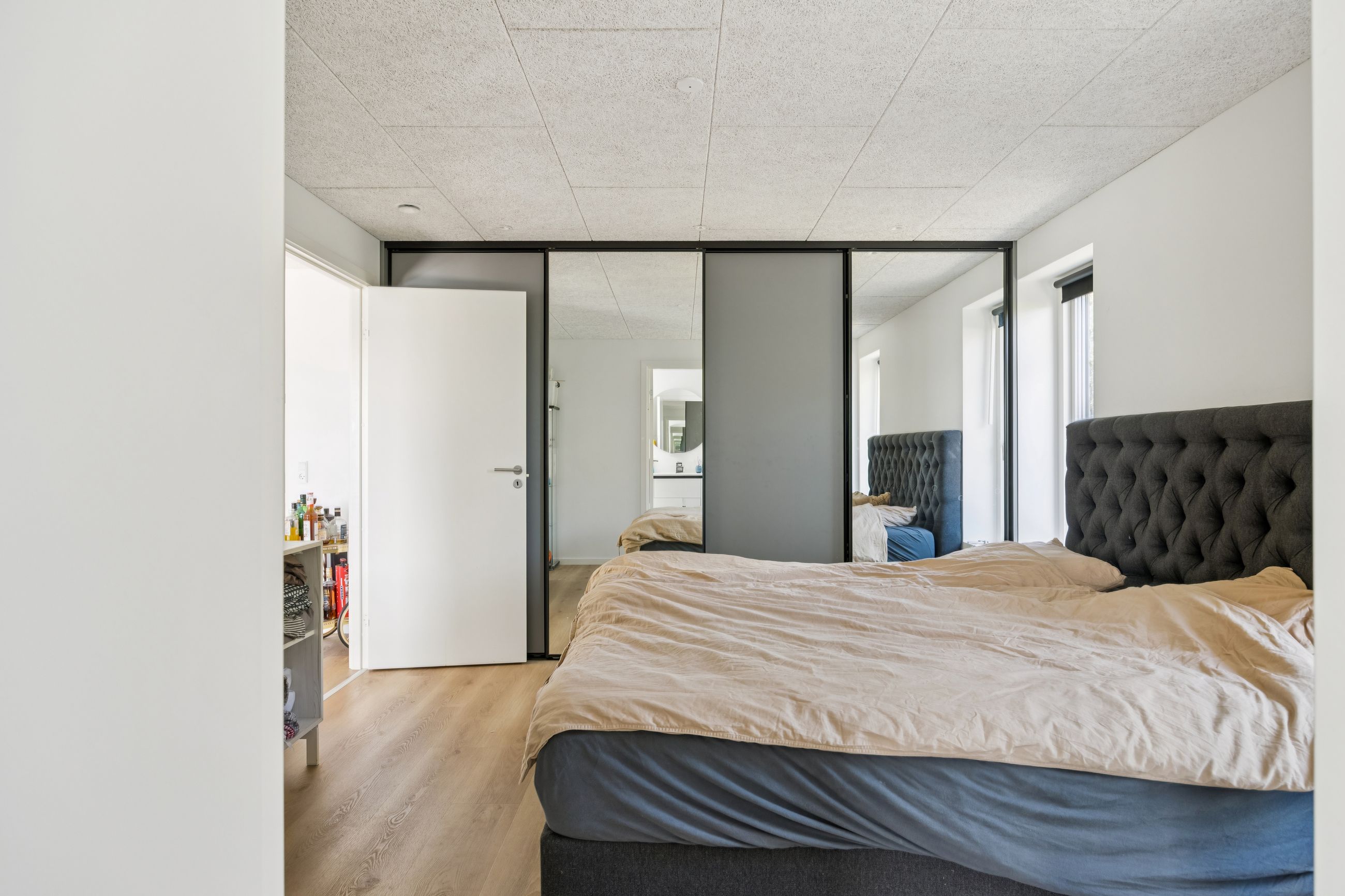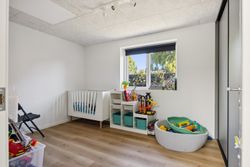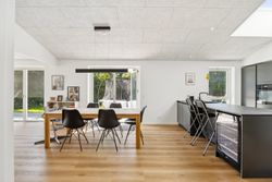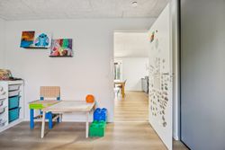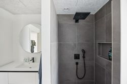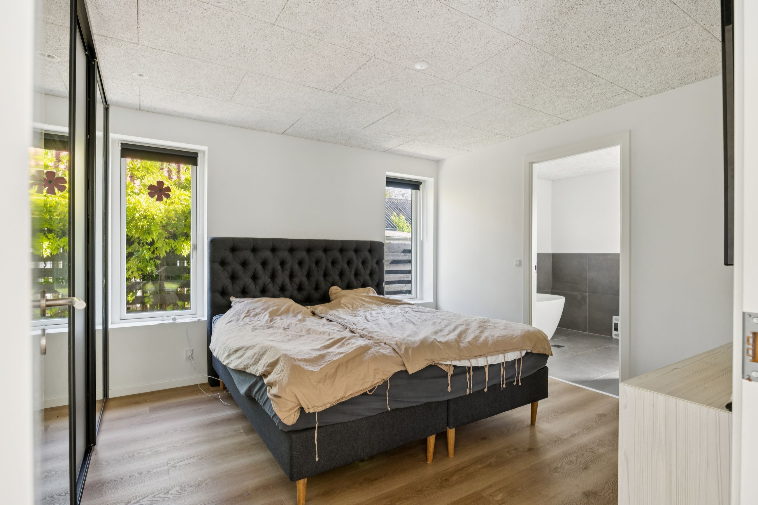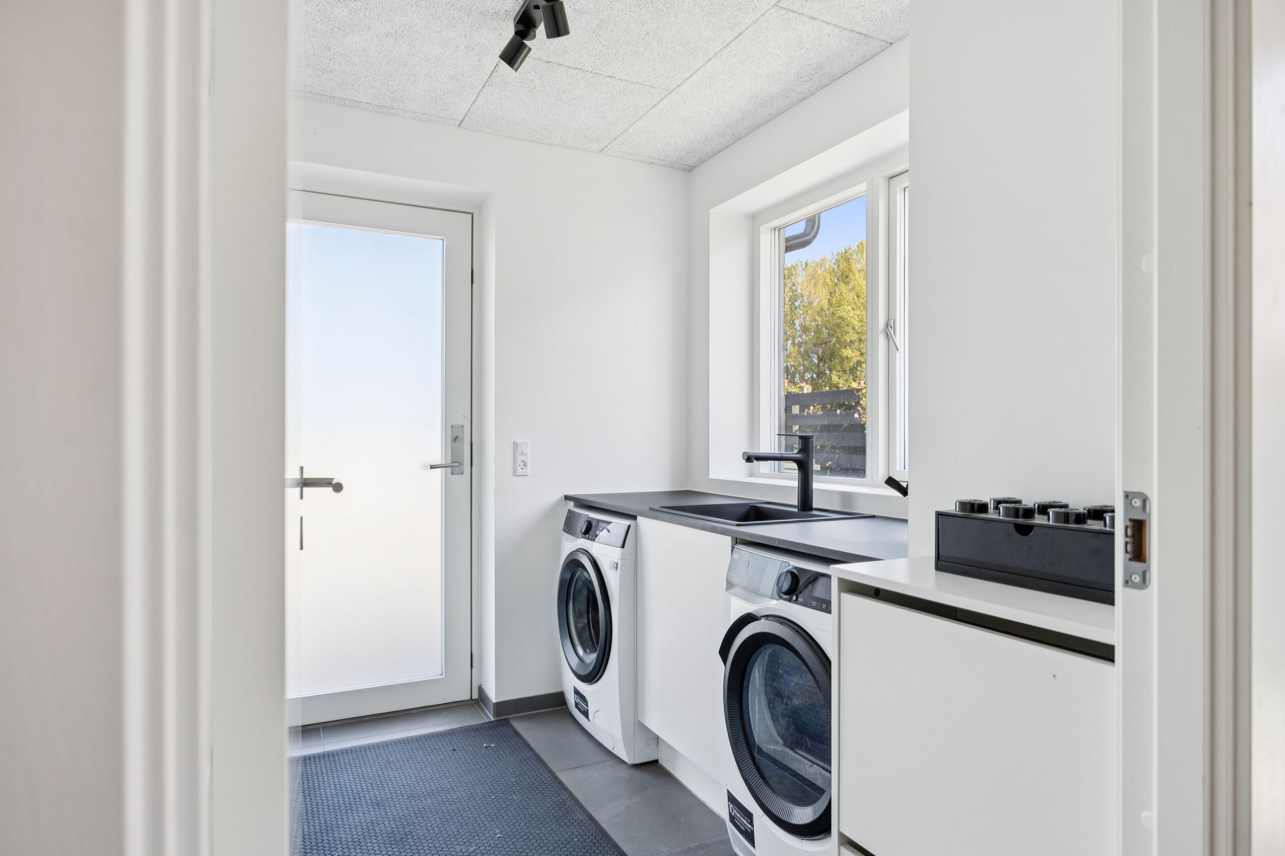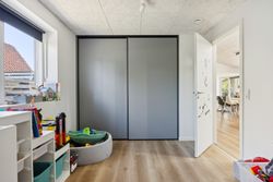 Villaens to badeværelser er praktisk opdelt med separate områder for voksne og børn, hvilket gør morgenrutinerne nemmere for alle familiemedlemmer. Hele boligen har gulvvarme drevet af en effektiv luft-til-vand varmepumpe kombineret med solceller på taget, hvilket sikrer lavere energiforbrug og et A2020 energimærke.