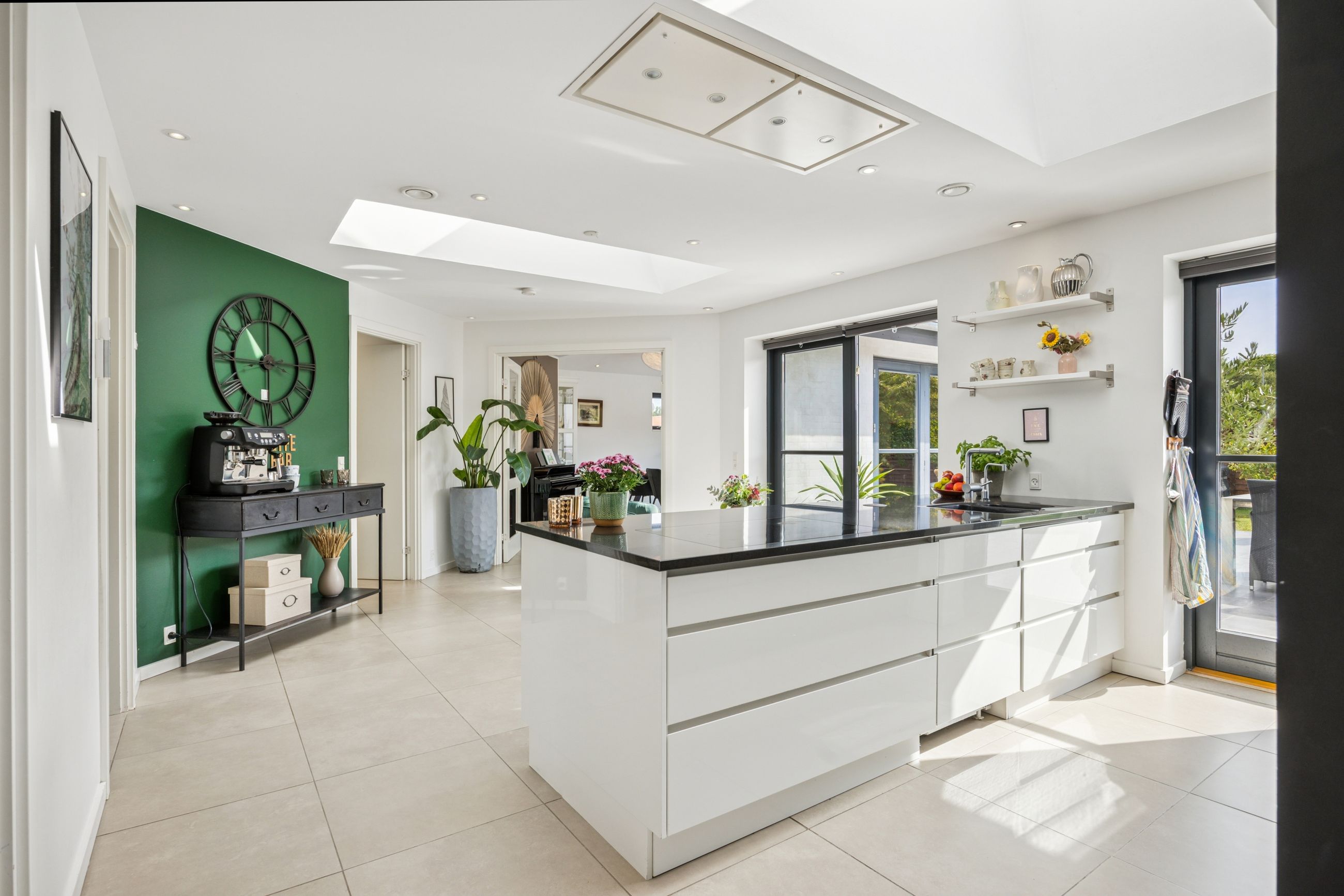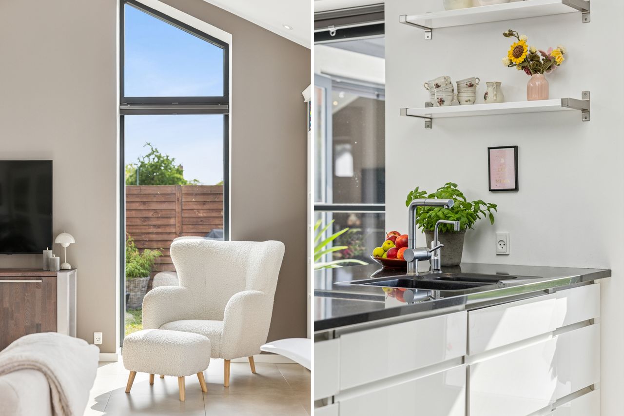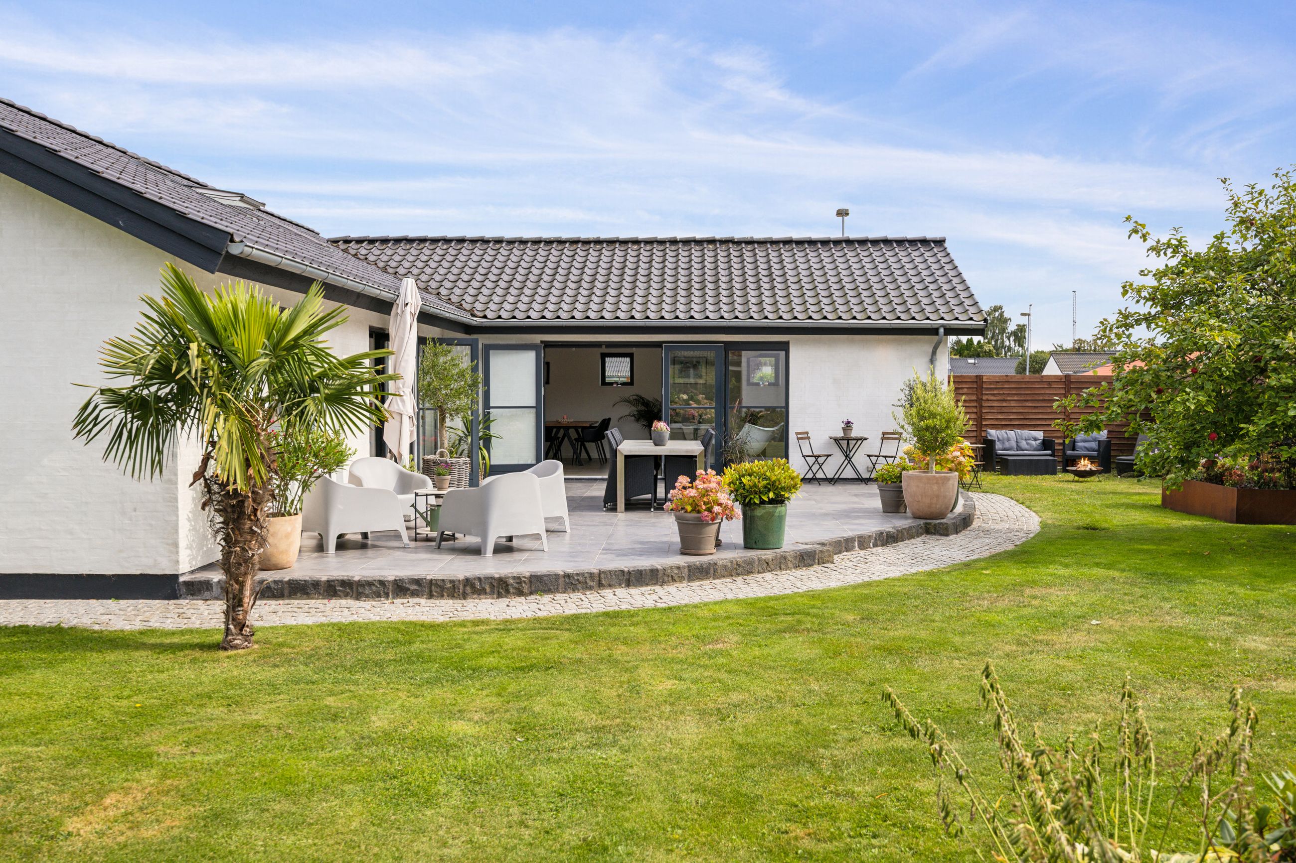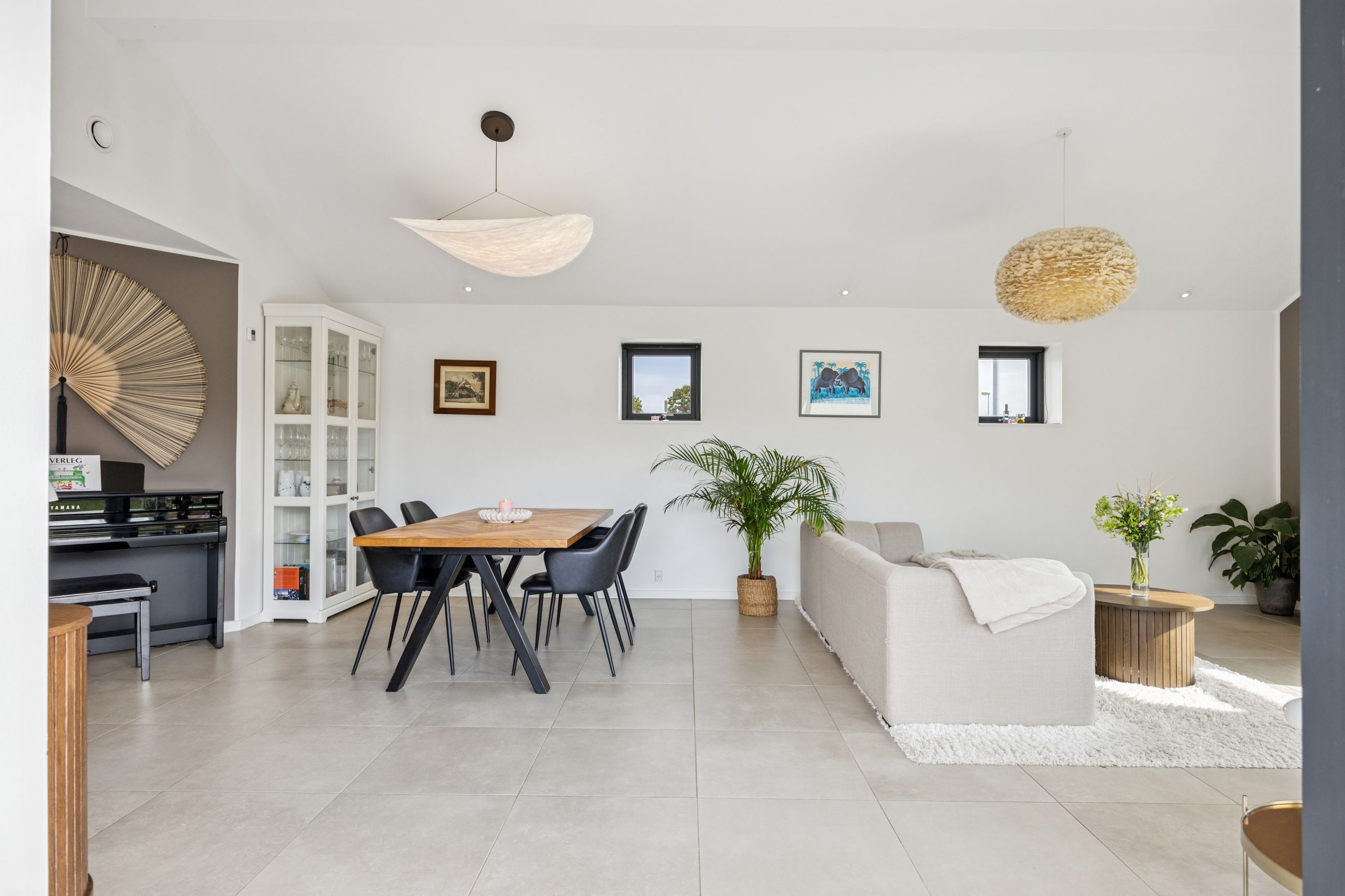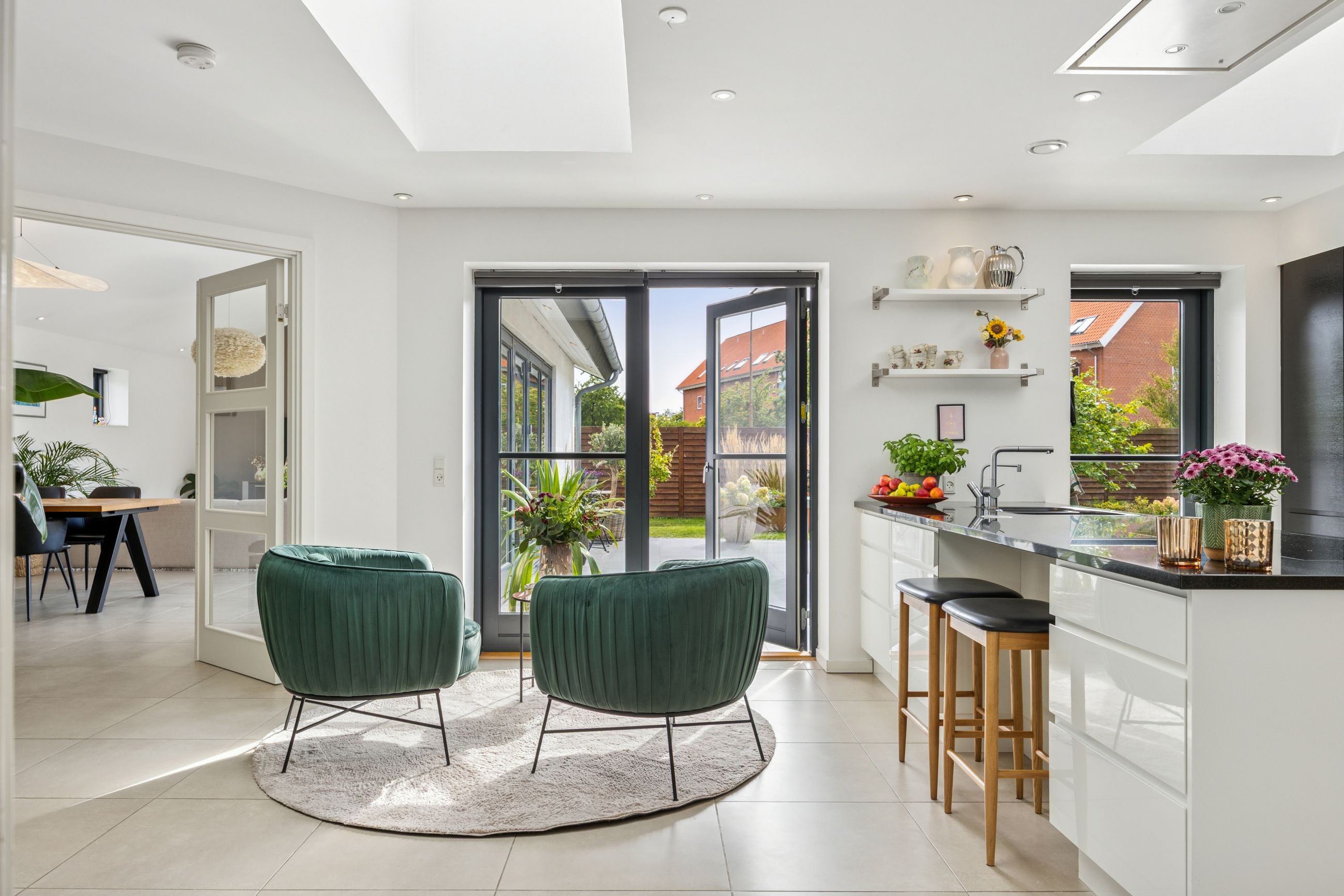 Indenfor byder villaen på en fantastisk indretning med et stort køkken-alrum udstyret med et stilfuldt køkken fra INVITA. Herfra er der direkte adgang til en skøn sydlandsk terrasse, som inviterer til hyggelige stunder under åben himmel. Stuen imponerer med loft til kip og ovenlys, hvilket giver rummet et enormt lyst og luftigt udtryk. Fra stuen er der ligeledes adgang til terrassen, hvor man kan nyde de solrige dage.