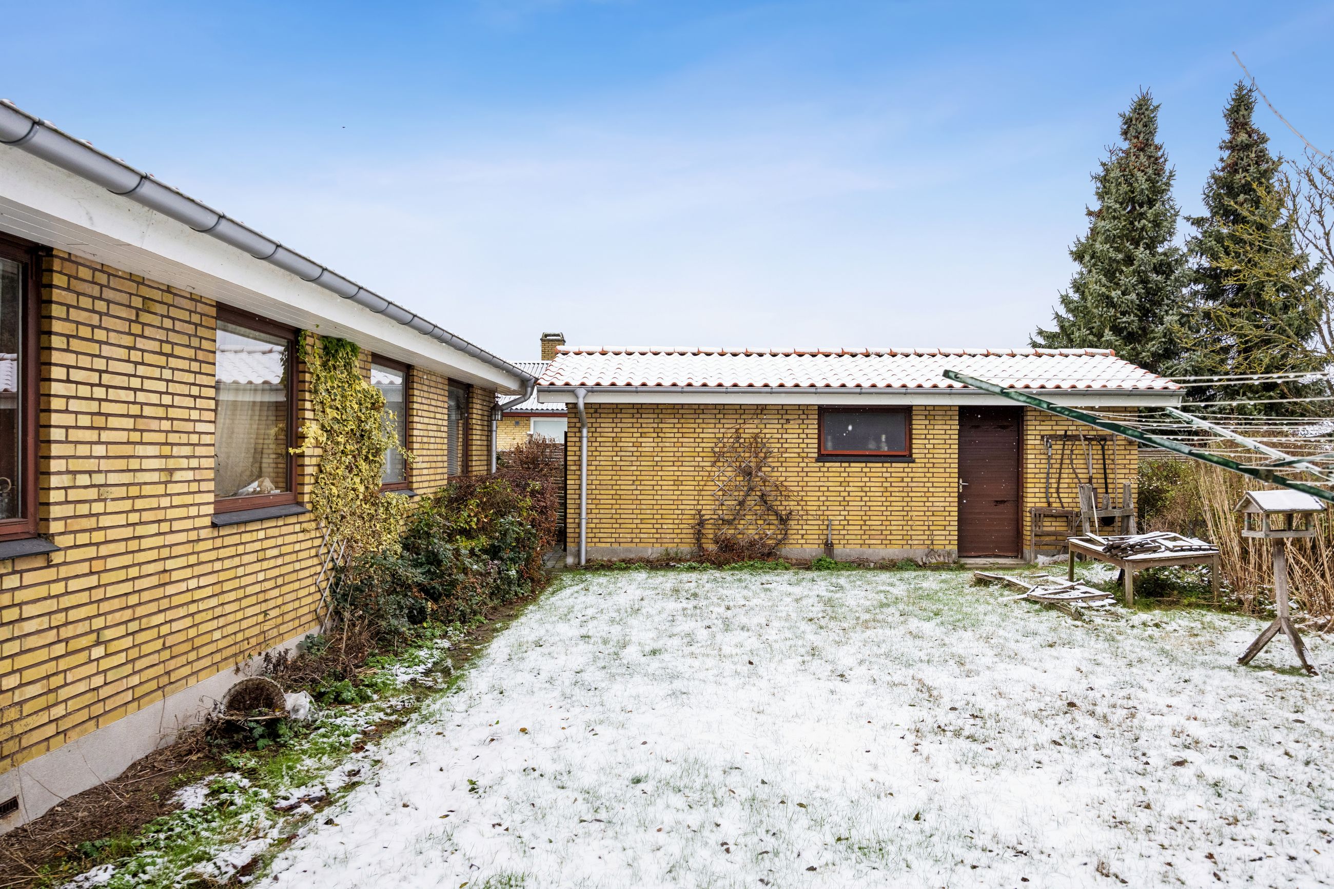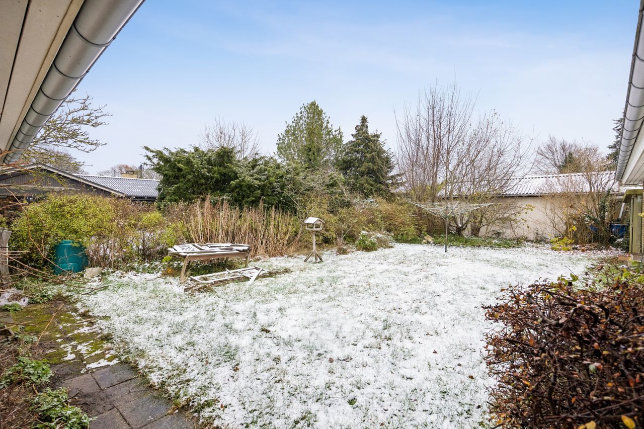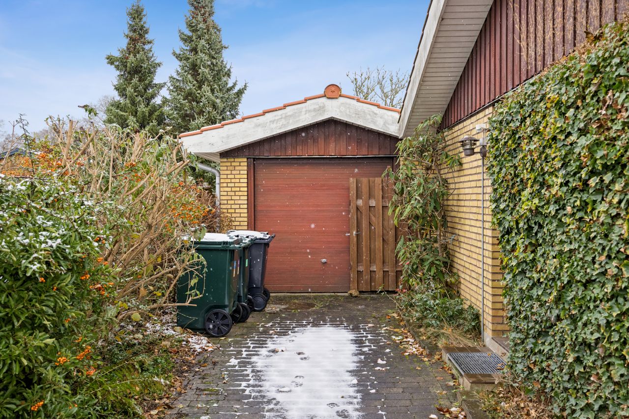 Haven omkring huset er en sand oase med græsplæner på begge sider af huset – perfekt til leg eller afslapning under åben himmel. Den store murede garage har også fået lagt rødt tegltag og tilbyder rigelig plads til opbevaring.