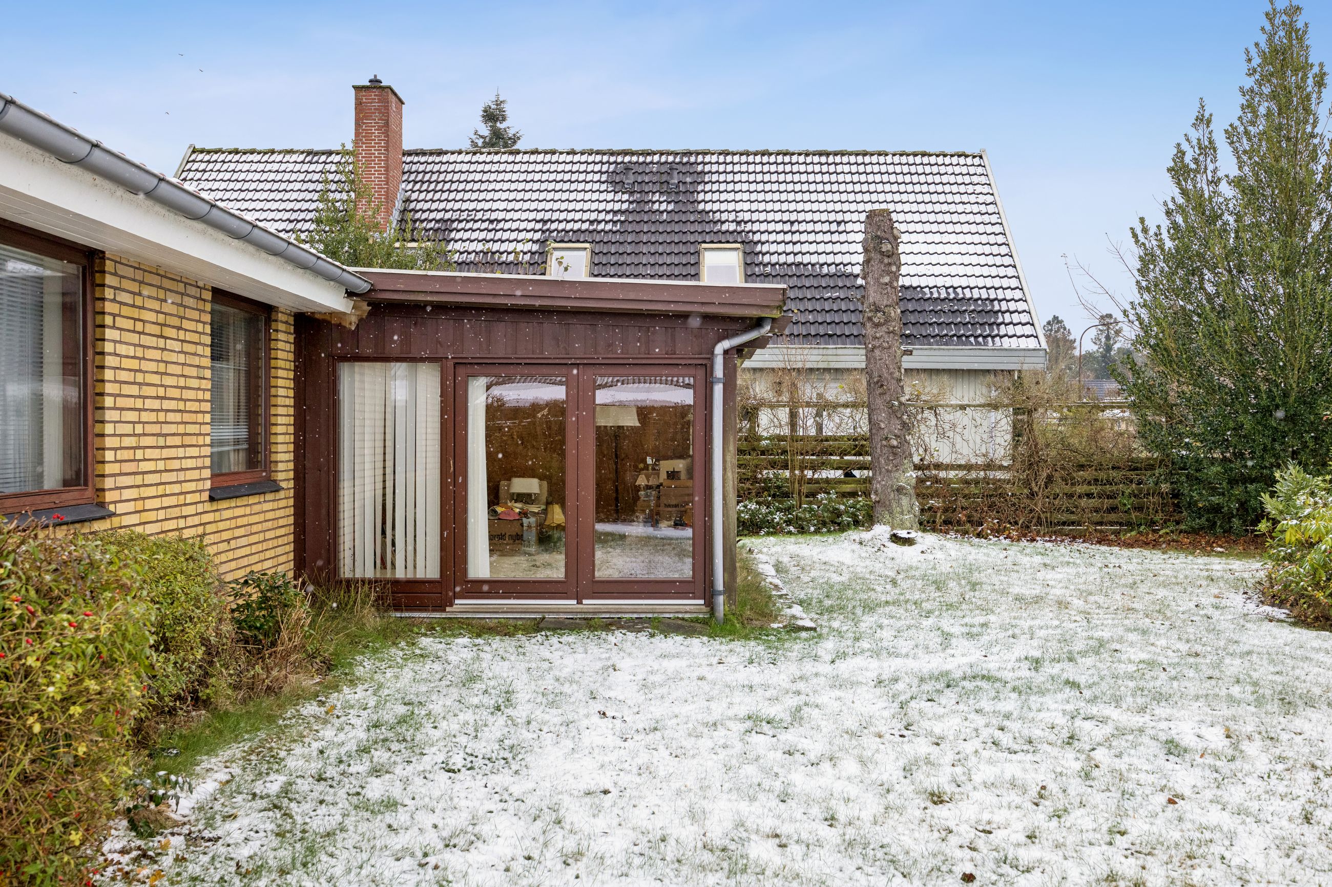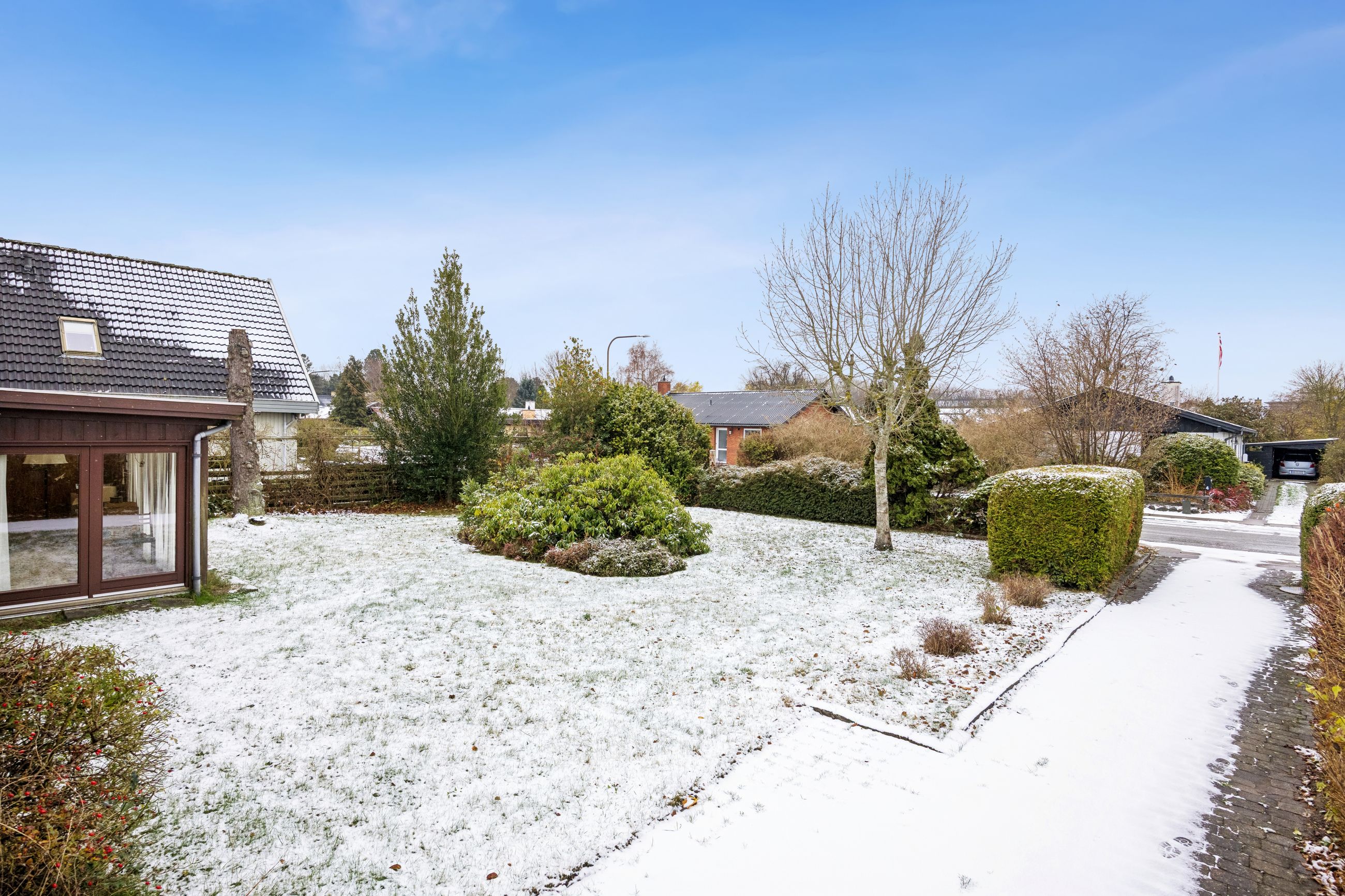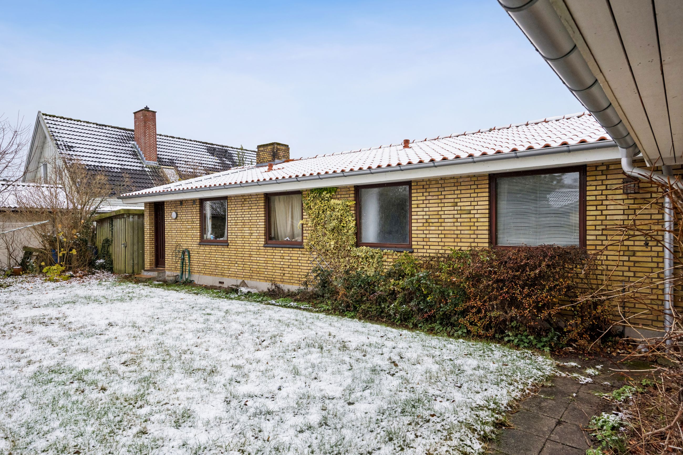 Haven omkring huset er en sand oase med græsplæner på begge sider af huset – perfekt til leg eller afslapning under åben himmel. Den store murede garage har også fået lagt rødt tegltag og tilbyder rigelig plads til opbevaring.