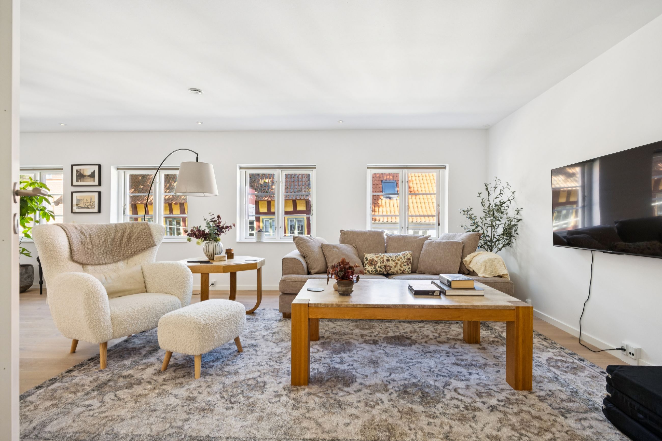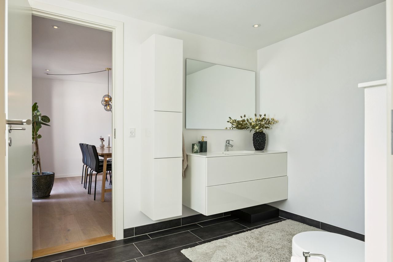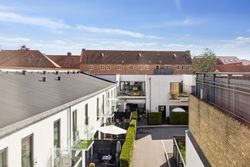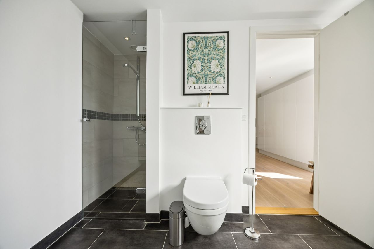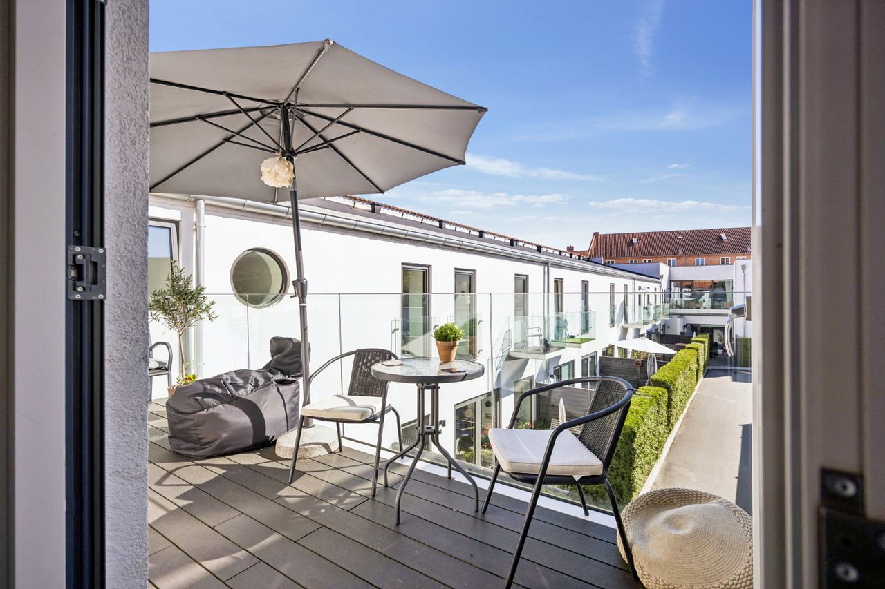 Med gulvvarme overalt sikres en behagelig temperatur året rundt, mens de to moderne badeværelser tilbyder både funktionalitet og stil. En stor solrig altan giver dig mulighed for at nyde udendørslivet midt i byen – perfekt til morgenkaffen eller afslapning efter en lang dag.