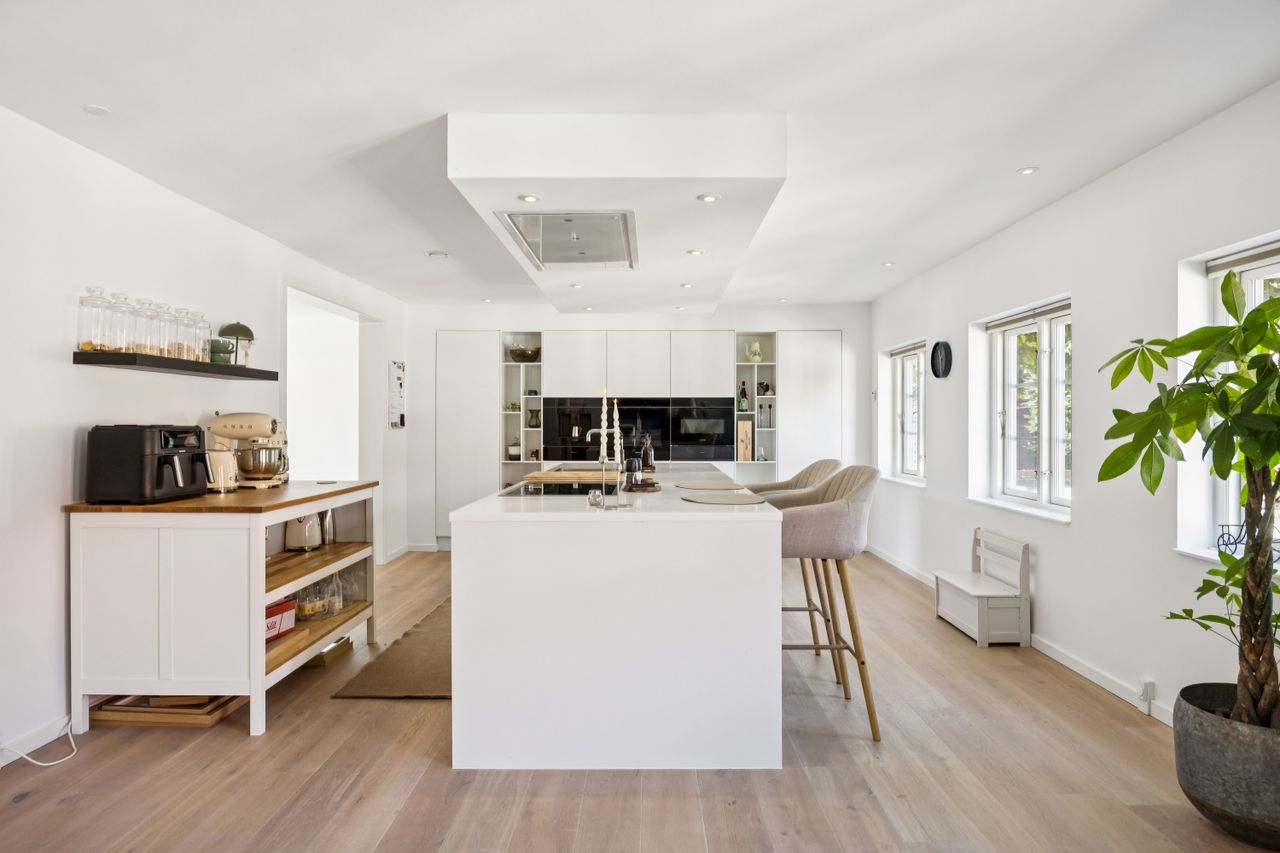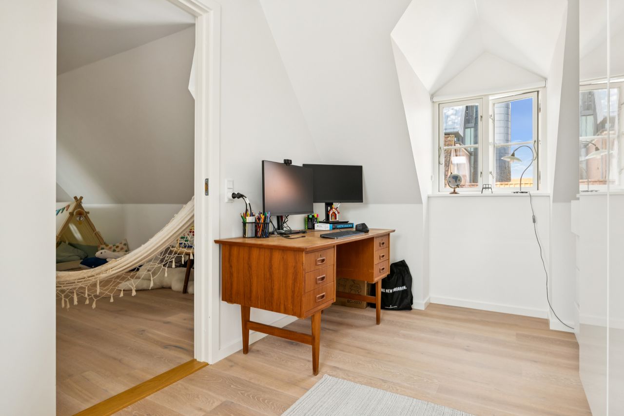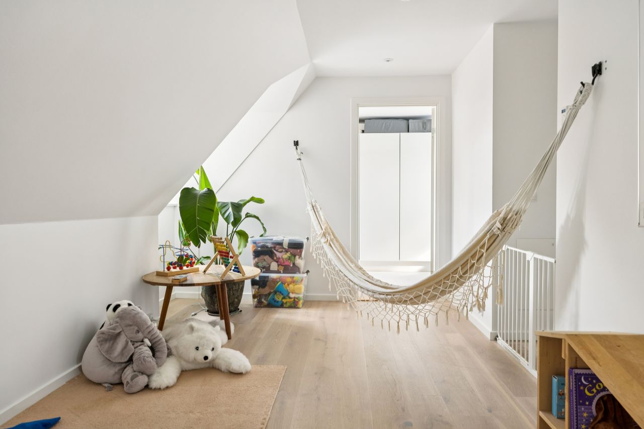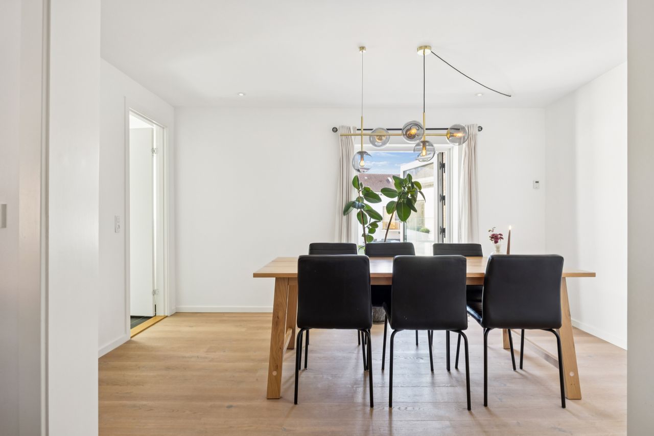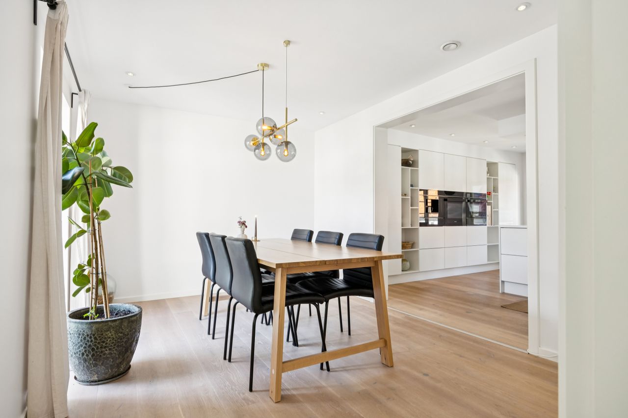 Lejligheden har fire rummelige værelser, der giver mulighed for at skabe både børne- og forældreafdeling efter behov. Det store køkken/alrum er perfekt integreret med stuen, hvilket skaber et åbent og lyst opholdsområde med plads til hjerterum og langbord – ideelt til hyggelige middage eller sociale sammenkomster. Den gode entre byder på rigelig opbevaringsplads, så du nemt kan holde orden i hverdagen. Derudover hører til lejligheden også et godt kælderrum.