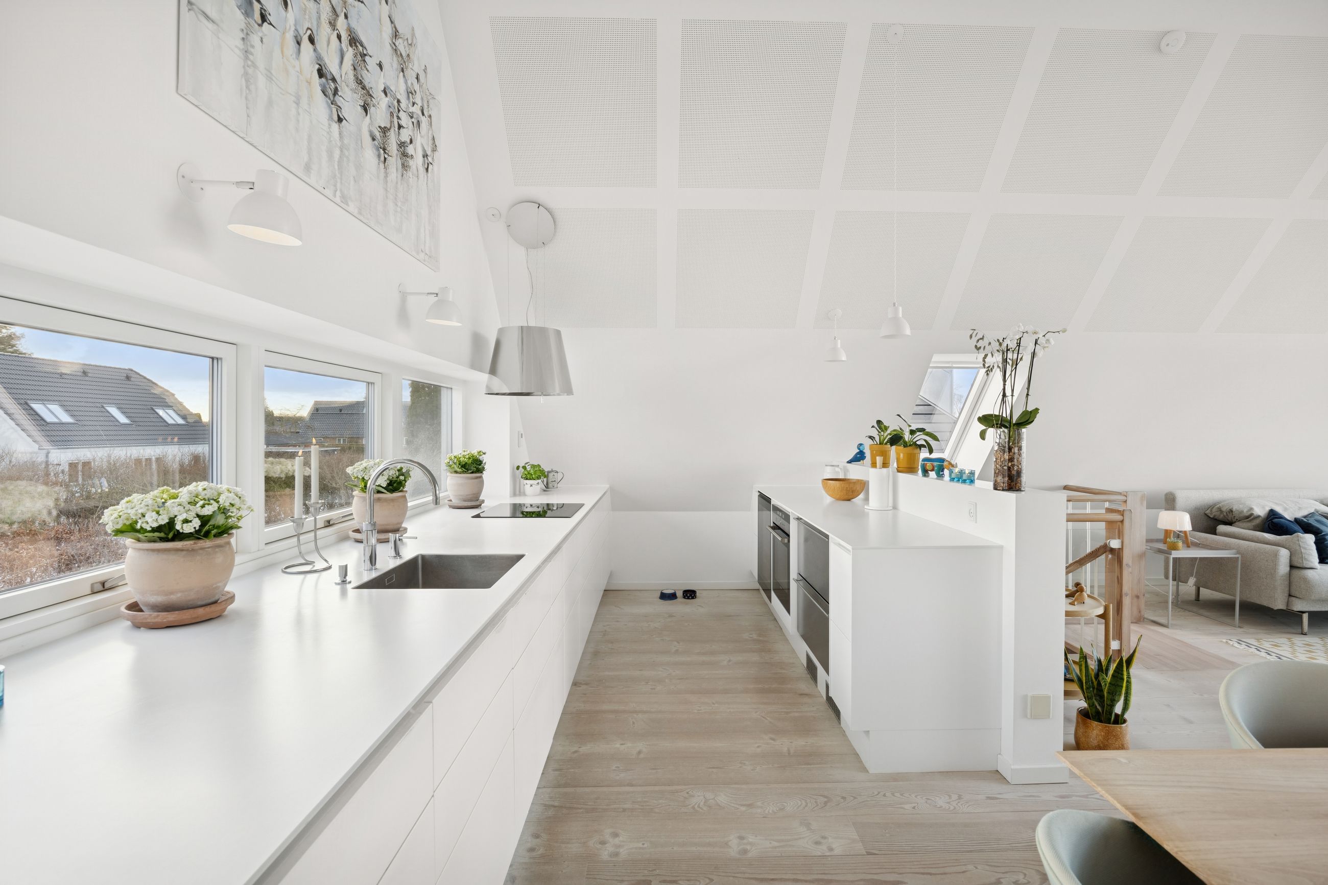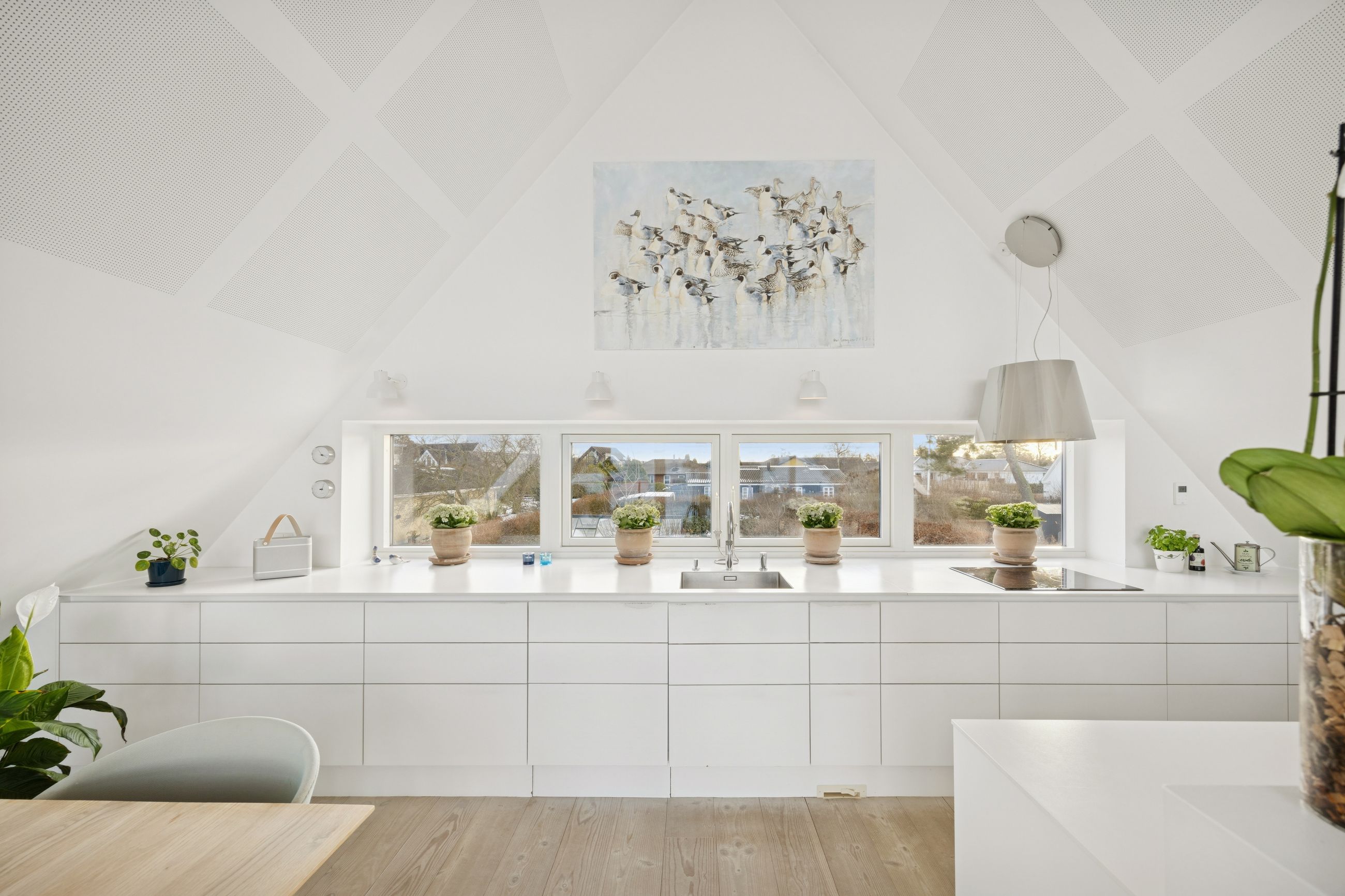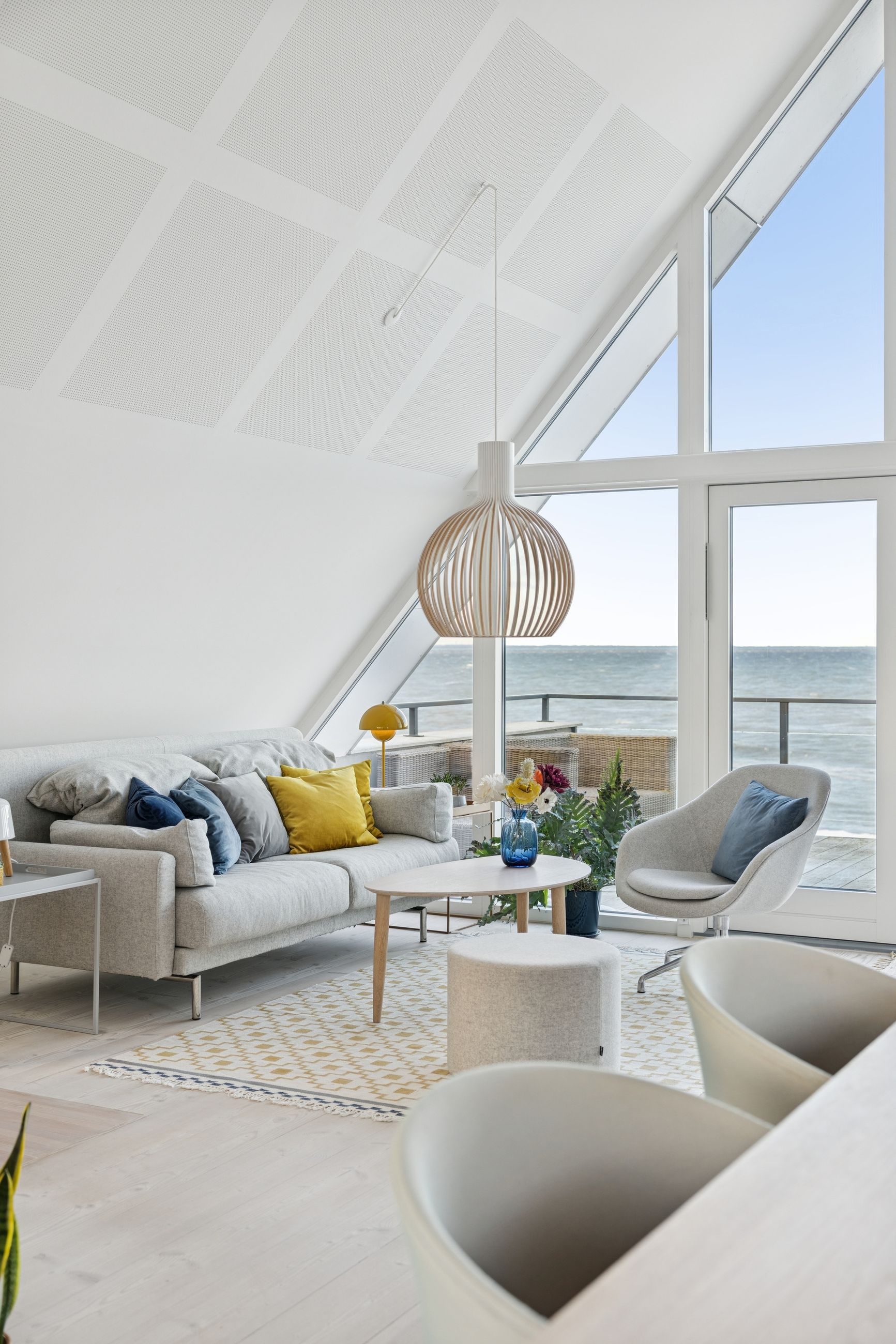 Indenfor mødes du af et velindrettet hjem med gennemtænkte rumløsninger. På første sal finder du det imponerende køkken-alrum med loft til kip og akustikpaneler, som skaber en rummelig atmosfære. Herfra kan du nyde den betagende panoramaudsigt over havet fra de store vinduespartier eller træde ud på den store terrasse for at opleve udsigten under åben himmel. Stueplanet byder på et stort soveværelse med tilstødende badeværelse, hvor du også kan vågne op til synet af bølgerne.