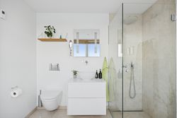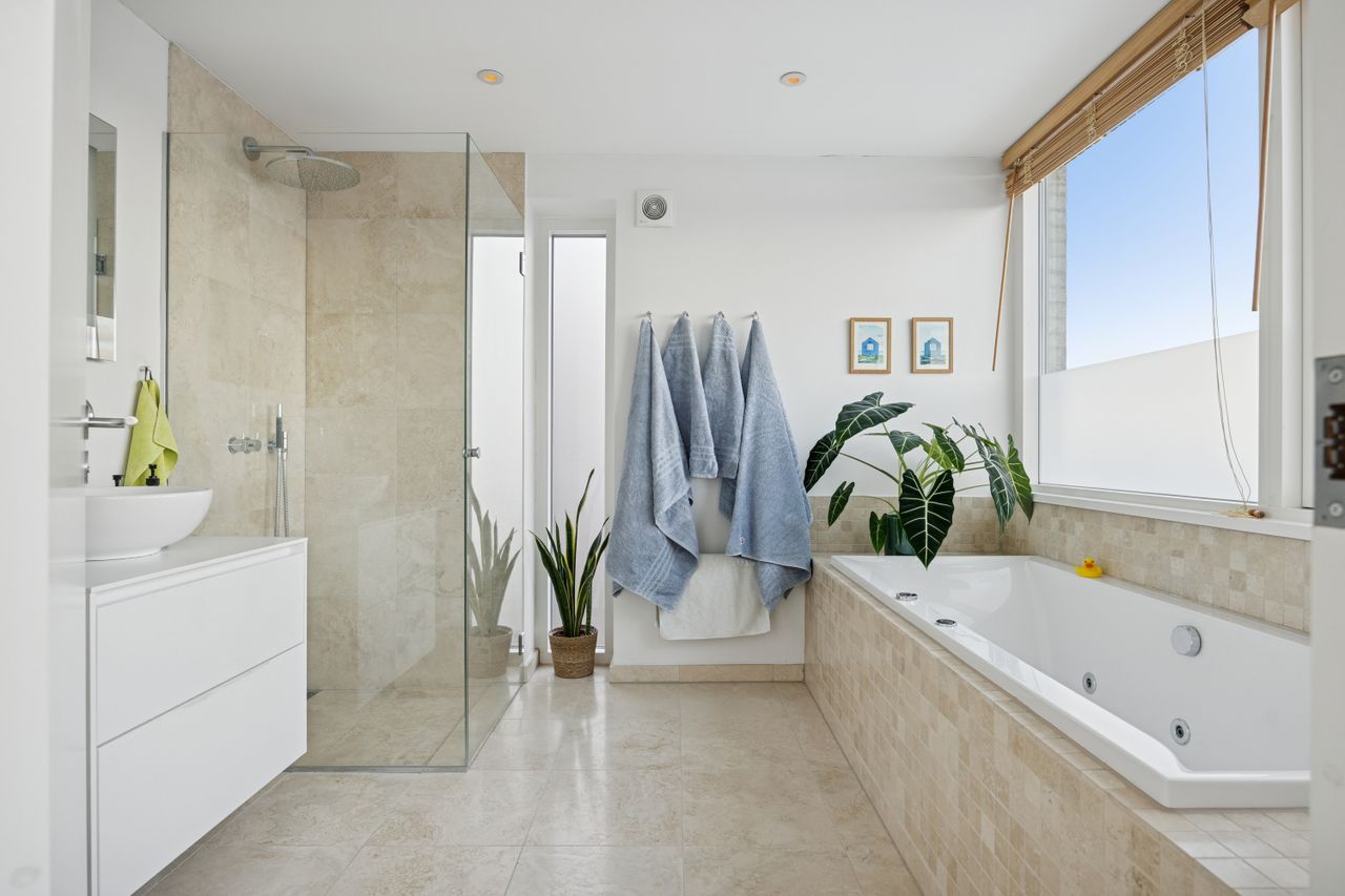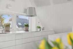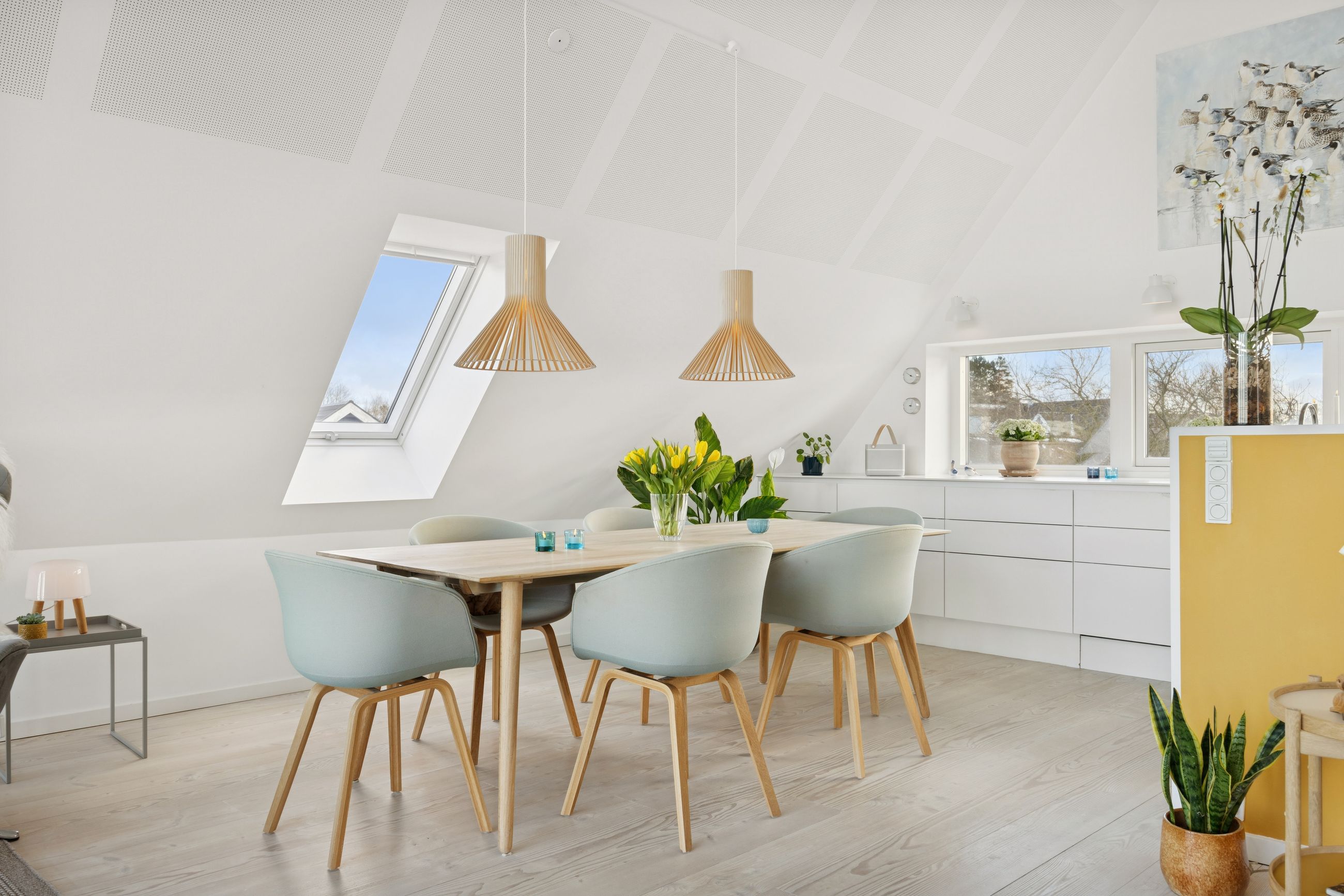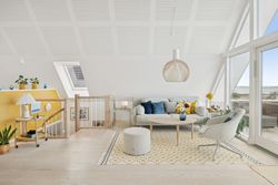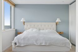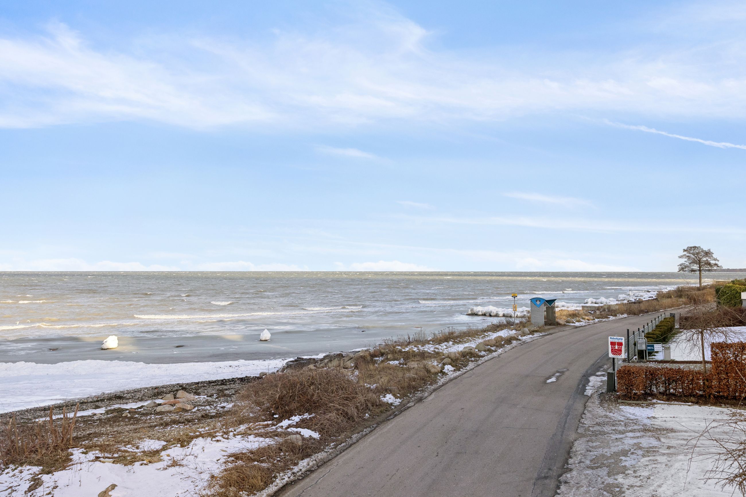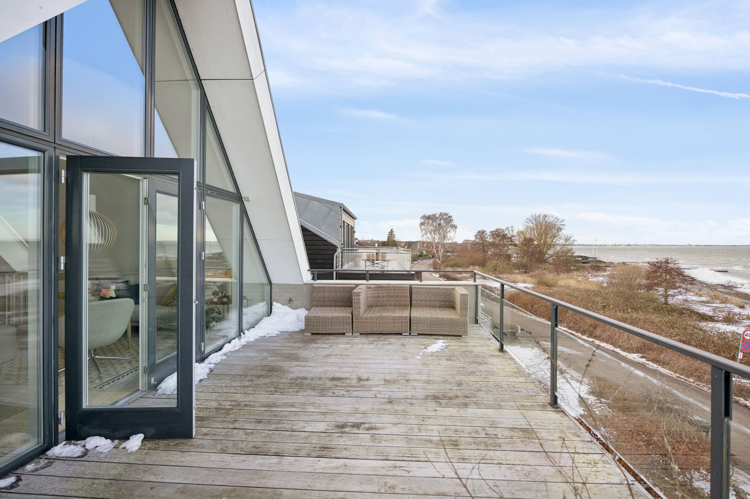 Indenfor mødes du af et velindrettet hjem med gennemtænkte rumløsninger. På første sal finder du det imponerende køkken-alrum med loft til kip og akustikpaneler, som skaber en rummelig atmosfære. Herfra kan du nyde den betagende panoramaudsigt over havet fra de store vinduespartier eller træde ud på den store terrasse for at opleve udsigten under åben himmel. Stueplanet byder på et stort soveværelse med tilstødende badeværelse, hvor du også kan vågne op til synet af bølgerne.