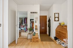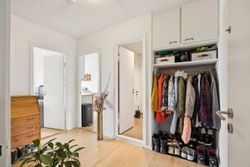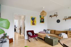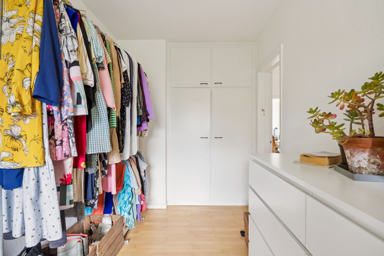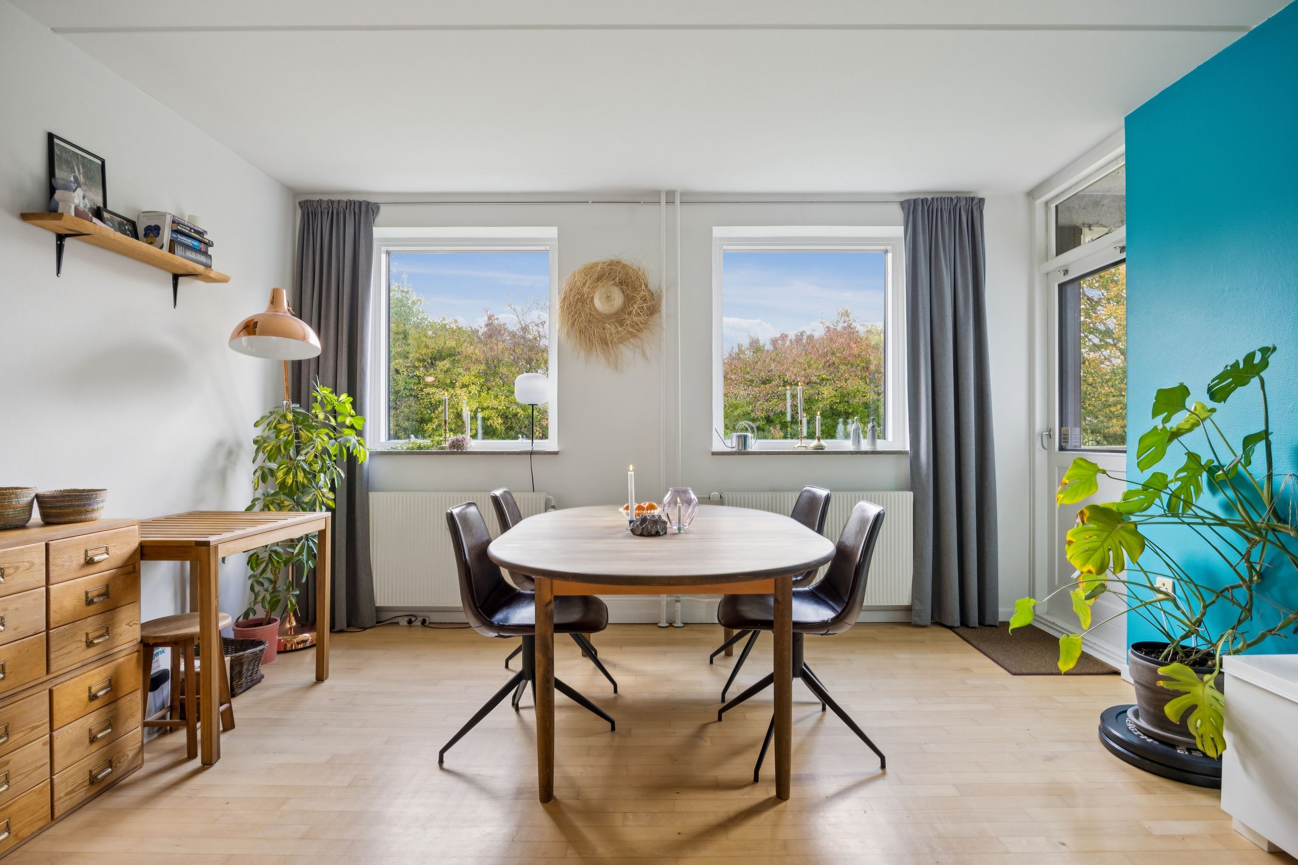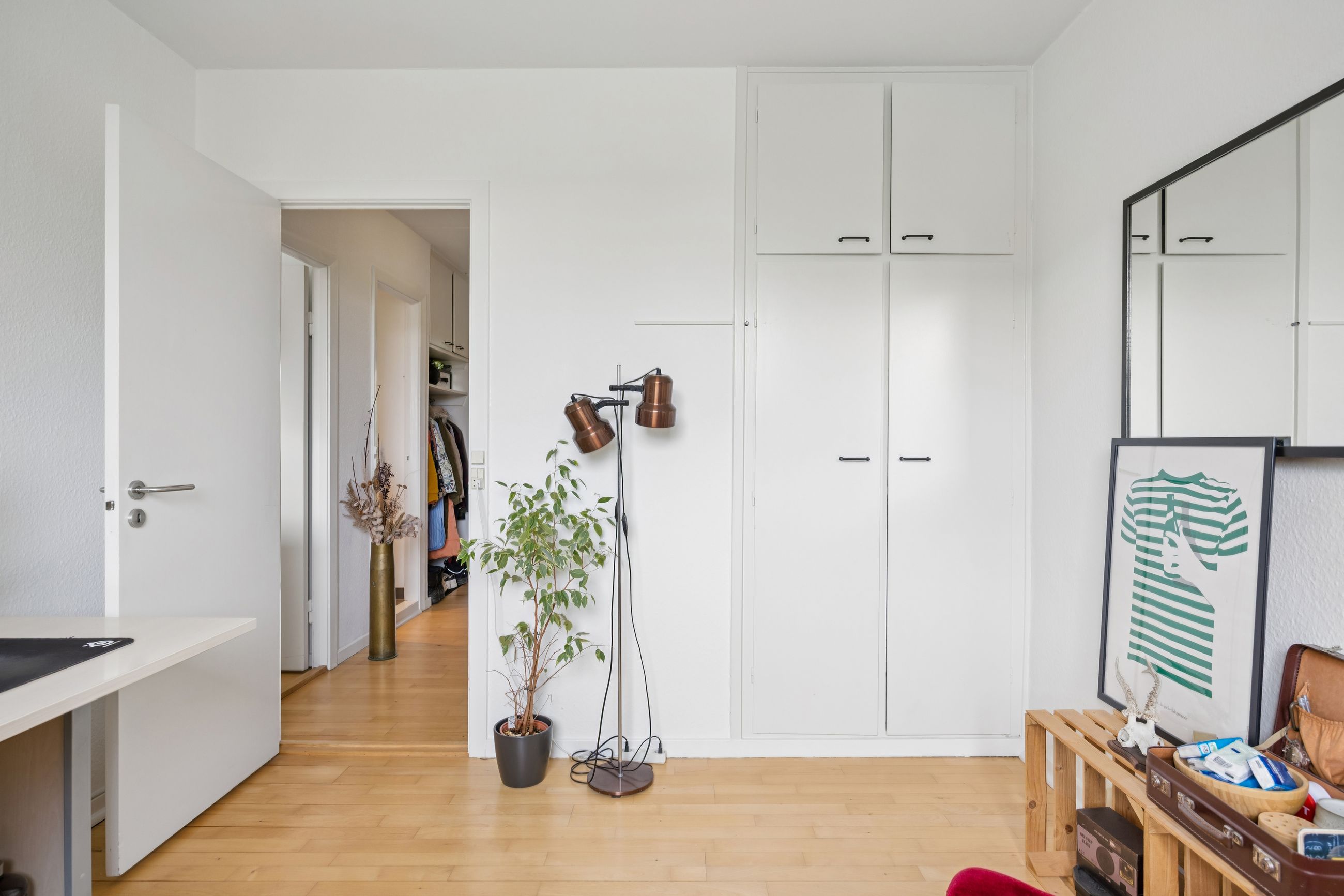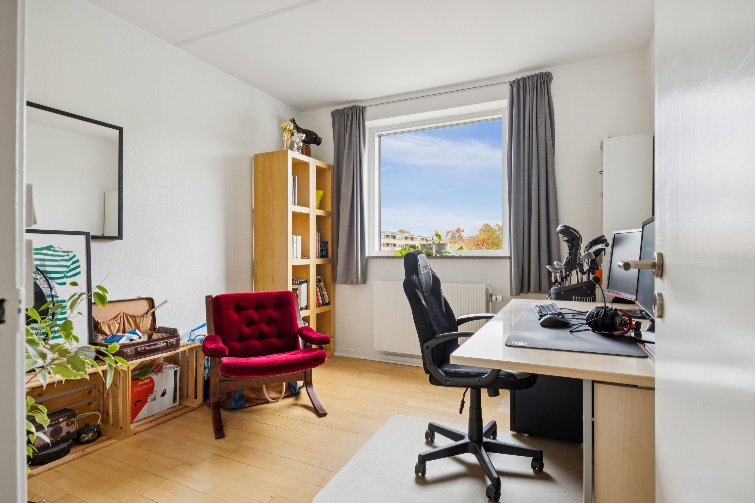 Med to gode værelser tilbyder lejligheden fleksible muligheder for både soveværelse og kontor eller børneværelse. Trægulvene gennem hele boligen bidrager yderligere til den varme atmosfære.