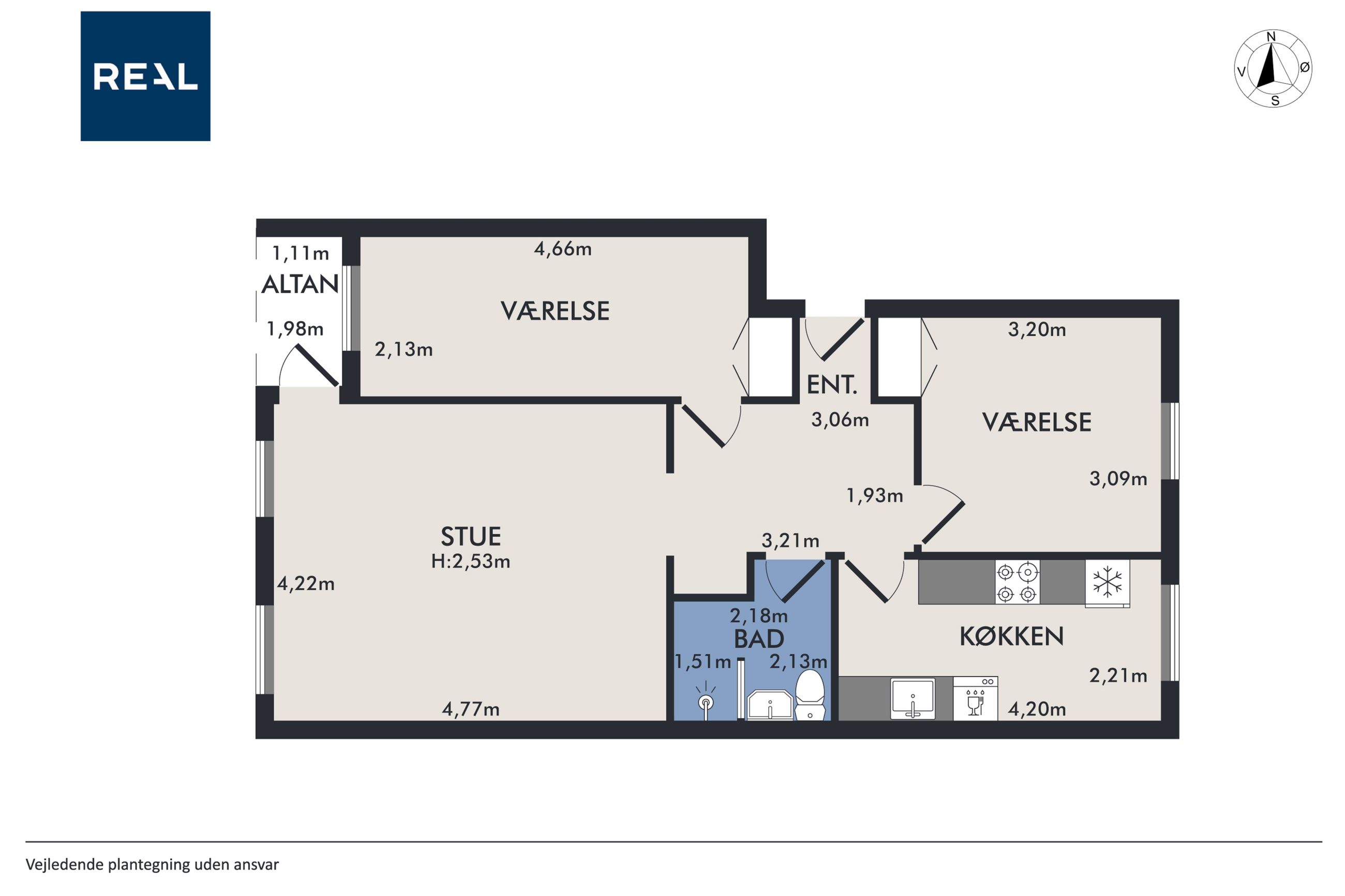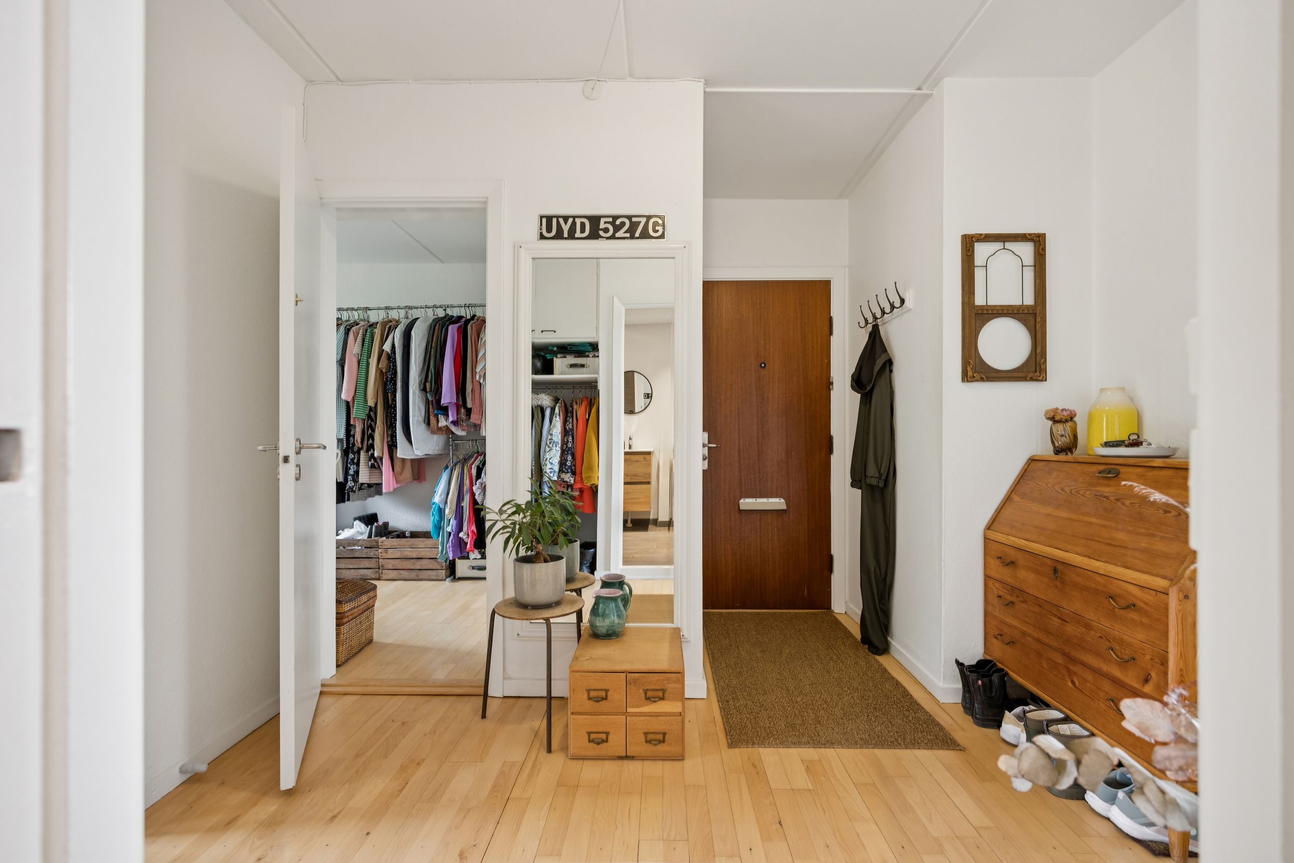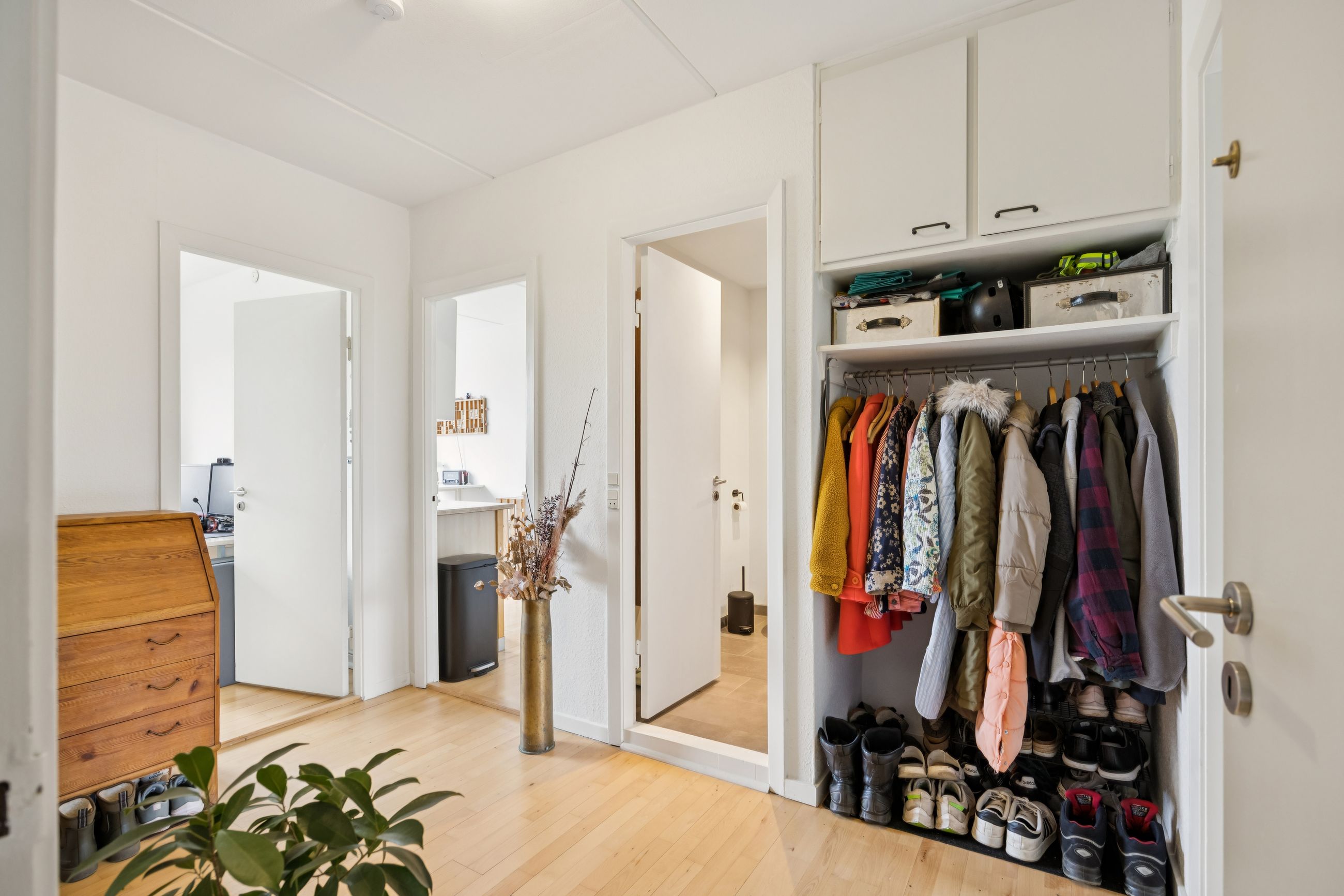 Når du træder ind i lejligheden, mødes du af en rummelig fordelingsentré med rigelig plads til overtøj og sko. Herfra ledes du videre ind i den lyse stue, der imponerer med sin gode indretning og direkte adgang til en dejlig altan. Altanen giver dig mulighed for at nyde udsigten over det ugenerede grønne område – et perfekt sted at slappe af efter en lang dag.
