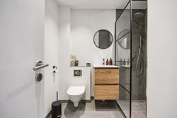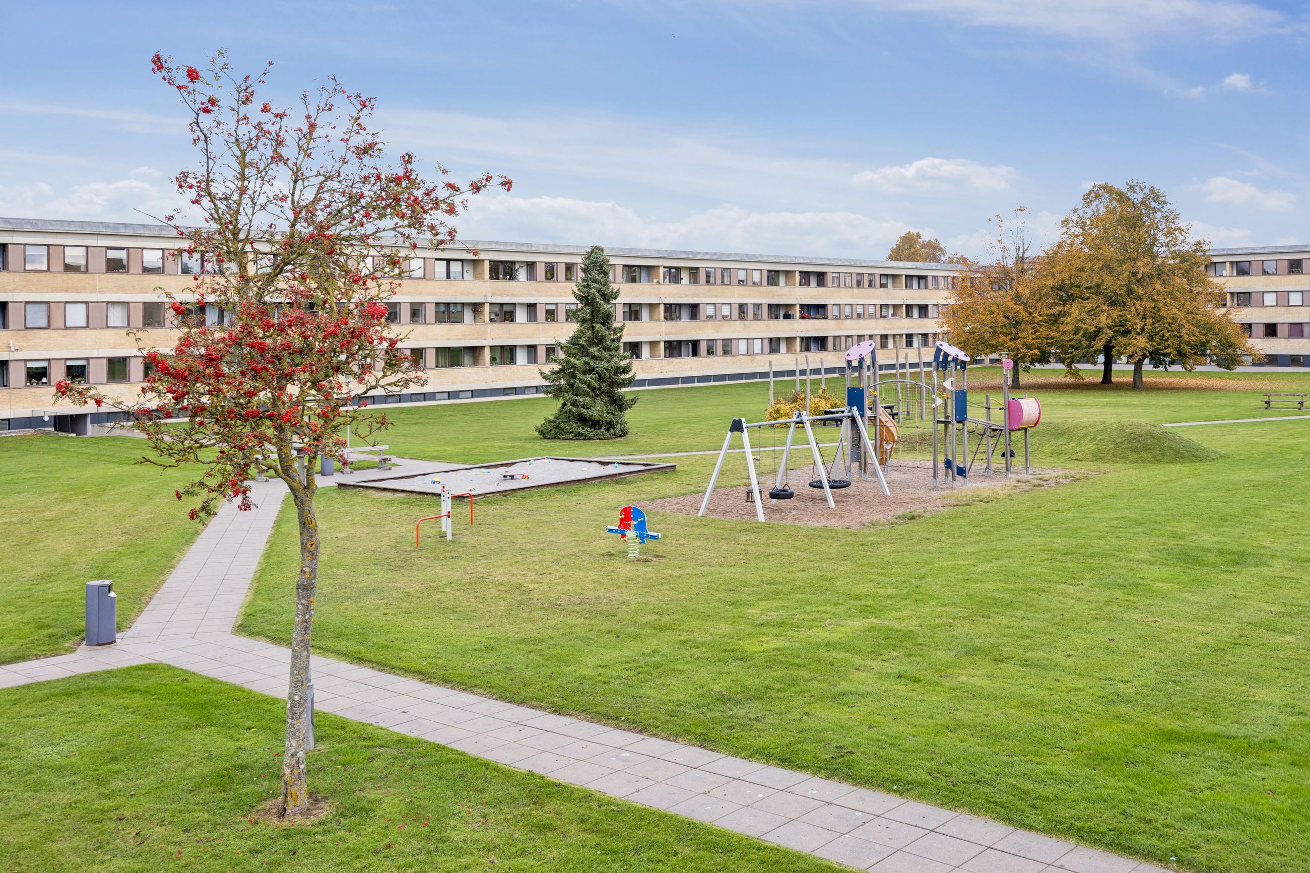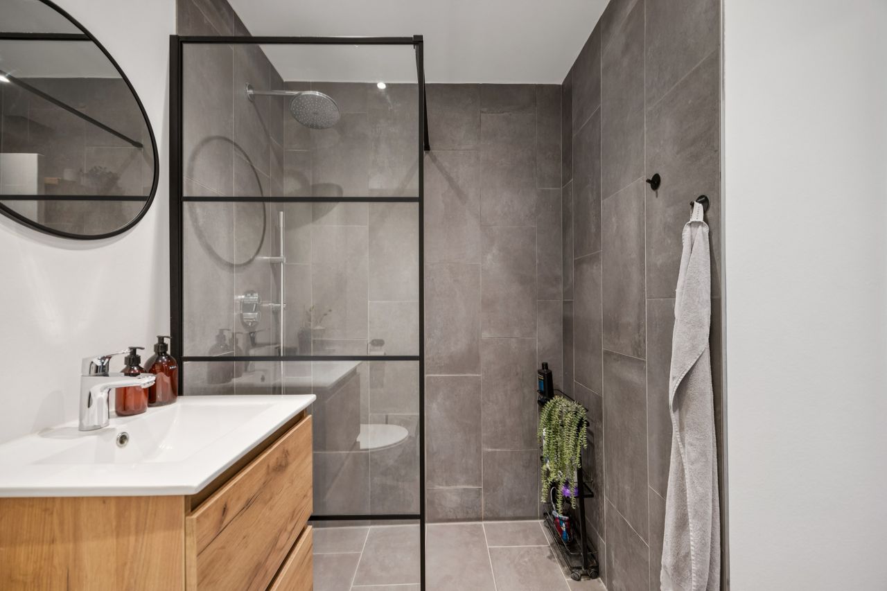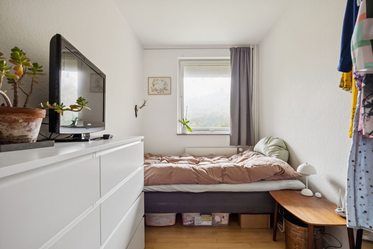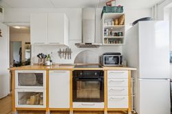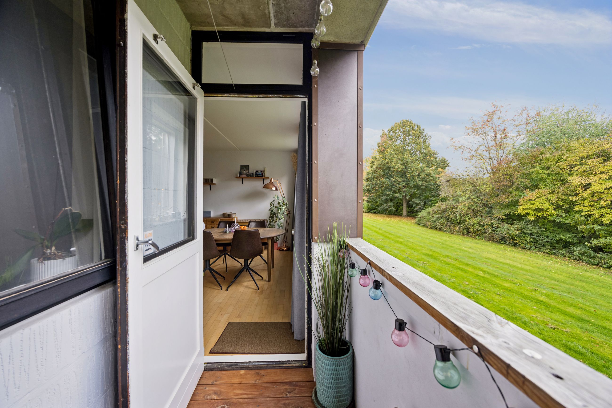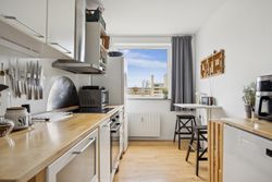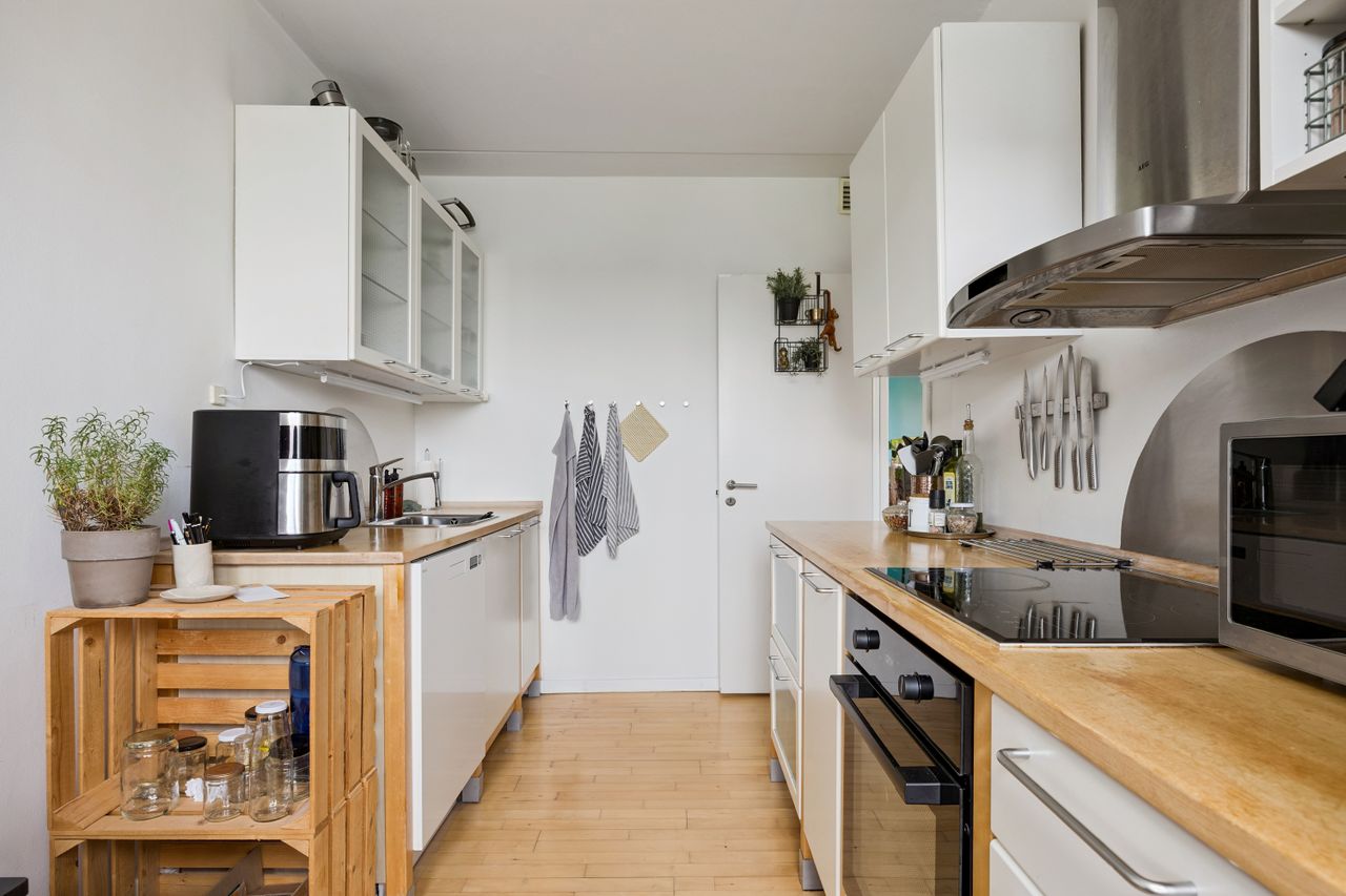 Lejligheden byder også på et nyere badeværelse udført med flotte grå klinker og god plads til brusebadet. Køkkenet er lyst og funktionelt med pæne hvide elementer samt udsigt over de pæne områder mellem blokkene. Der er endda mulighed for at etablere en lille spiseplads her, hvilket gør køkkenet til et hyggeligt samlingspunkt.
