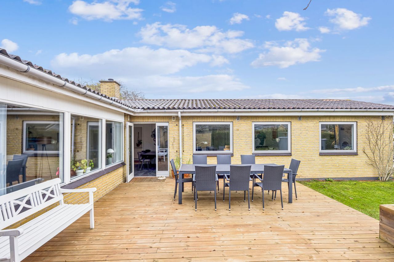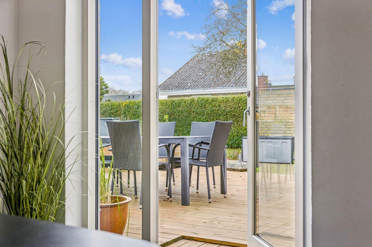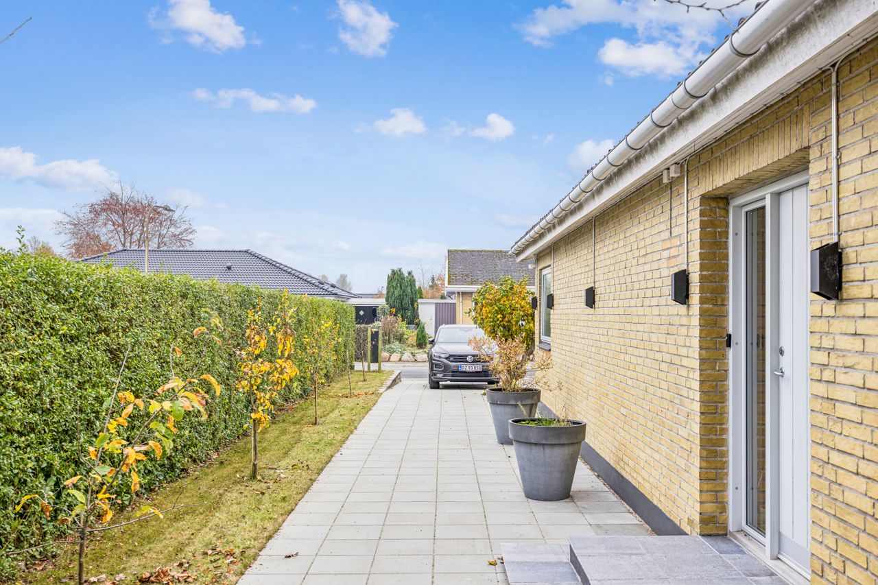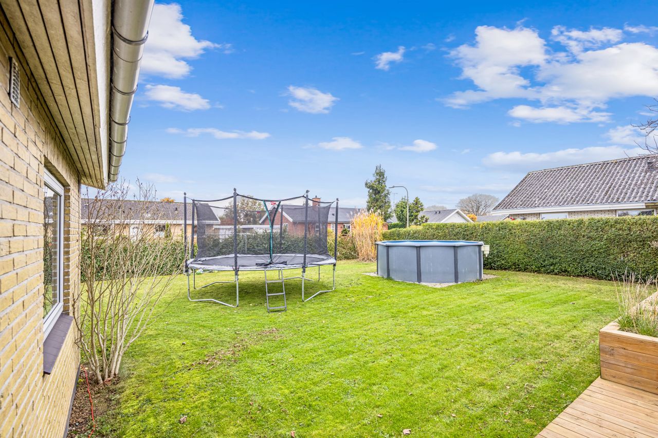 Udenfor venter en nem have med mange anvendelsesmuligheder; her kan børnene lege frit eller man kan nyde solrige dage på den gode træterrasse. Indgangspartiet samt parkeringsarealet er nyere anlagt for at sikre både æstetik og funktionalitet.