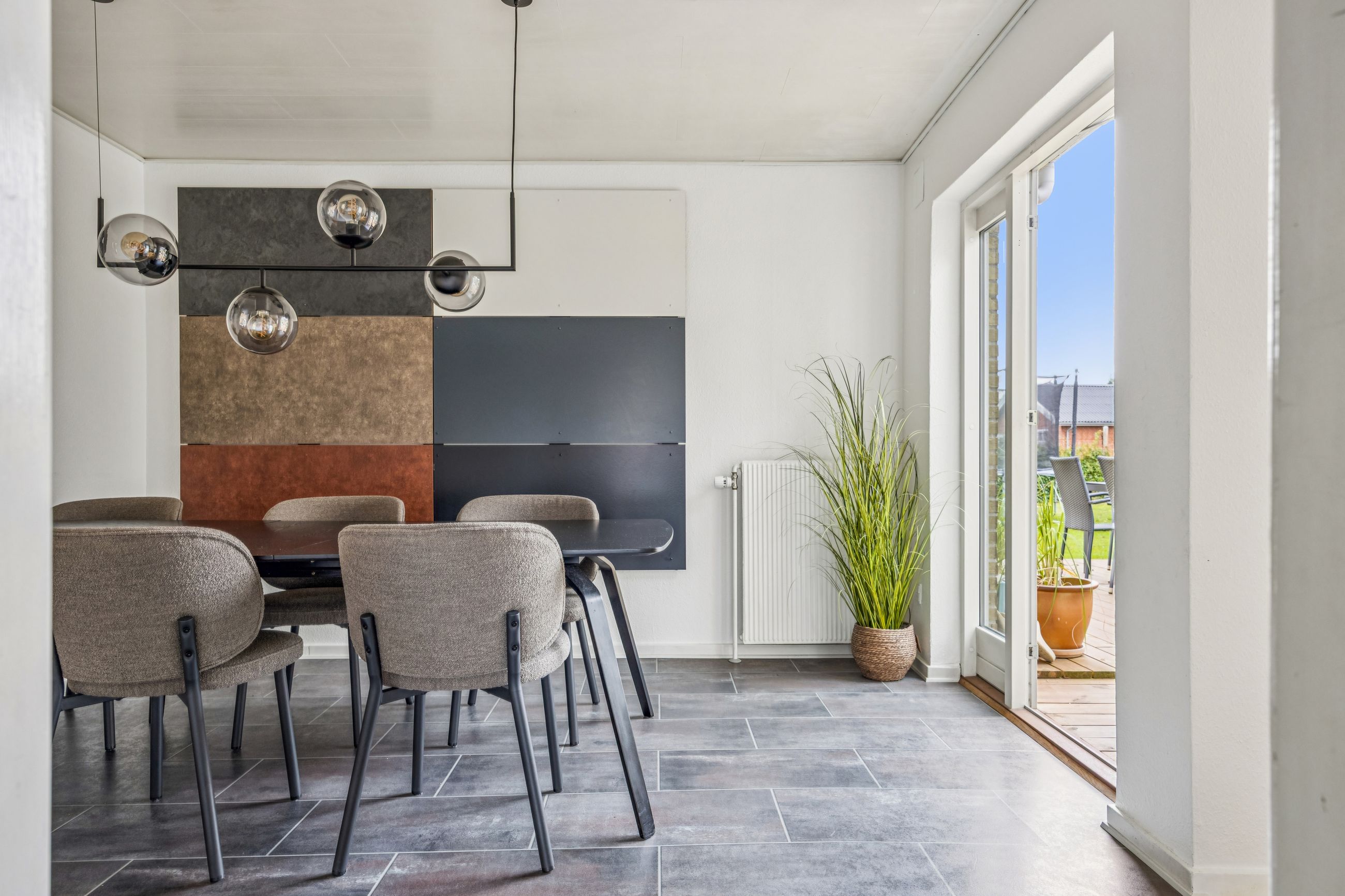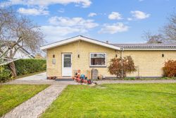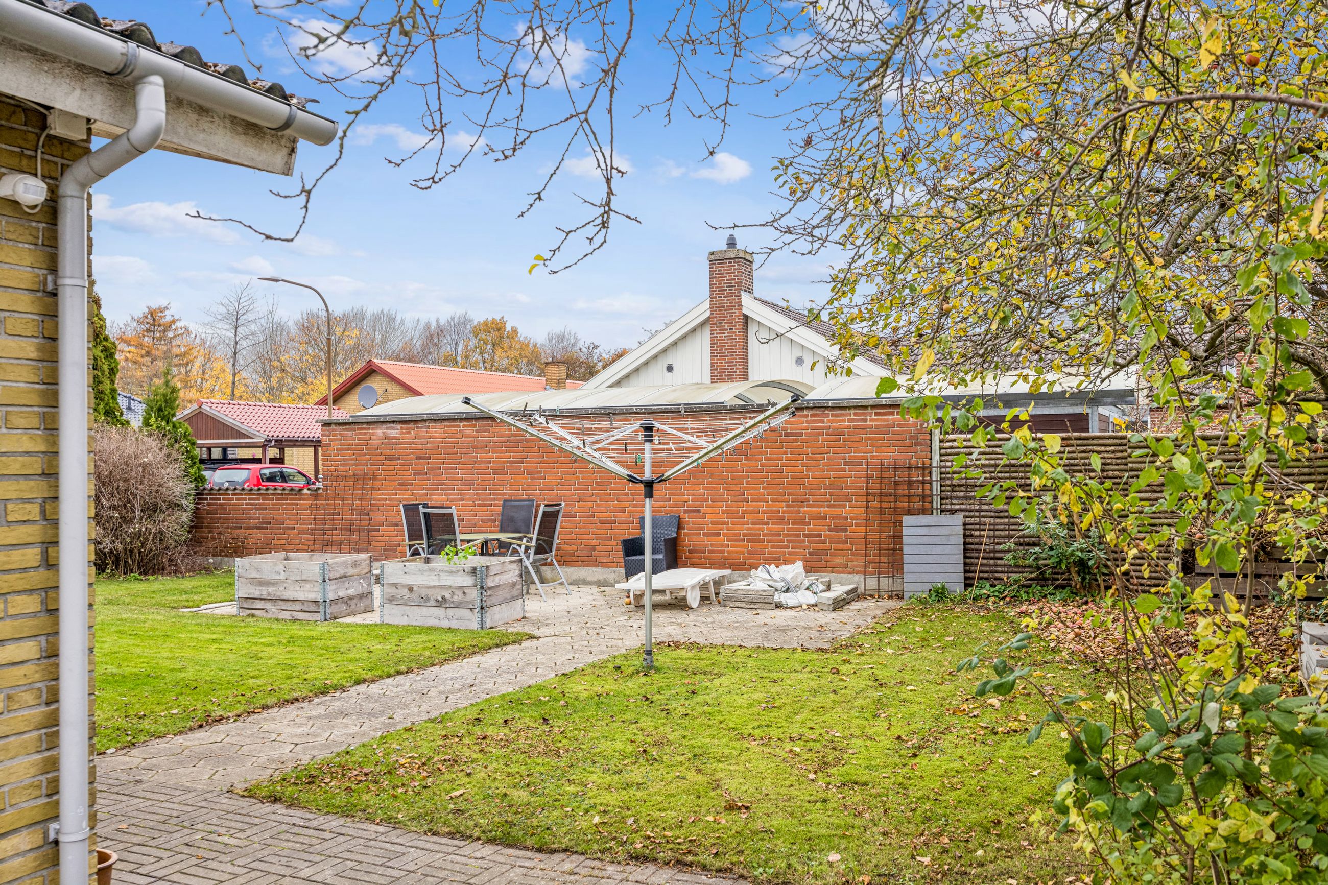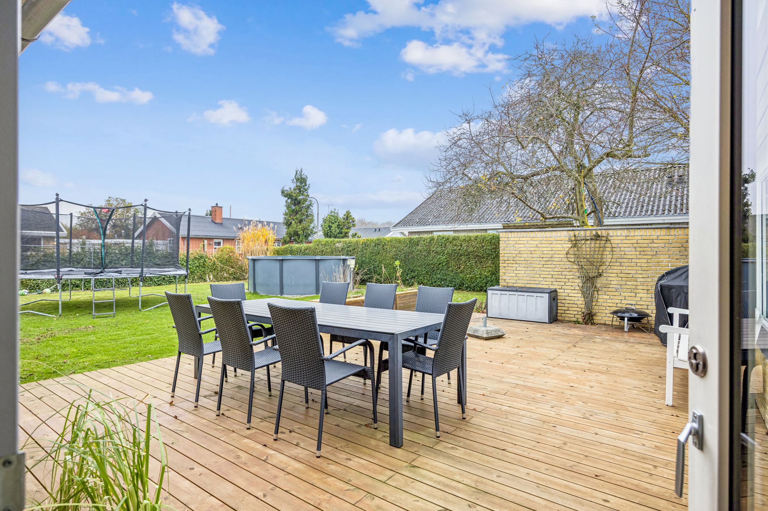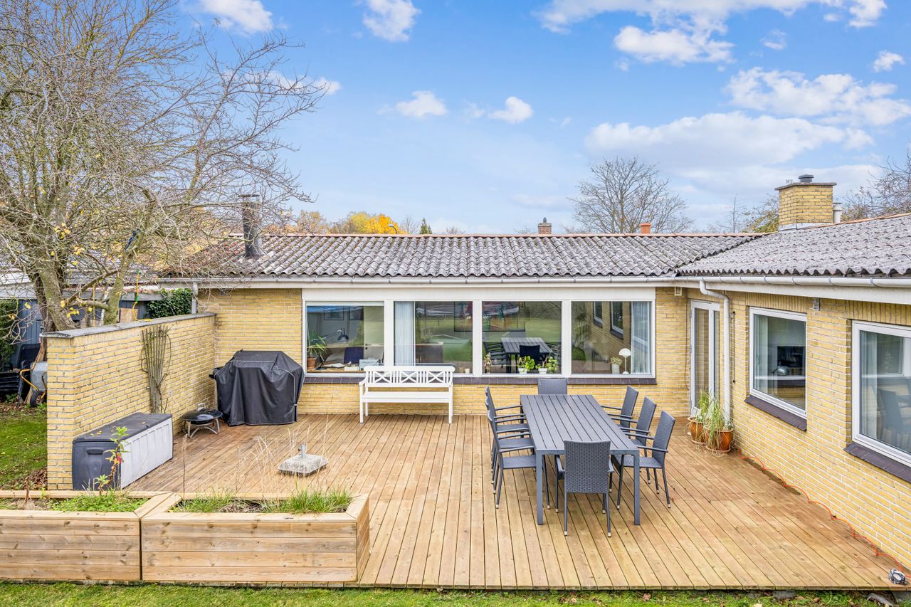 Udenfor venter en nem have med mange anvendelsesmuligheder; her kan børnene lege frit eller man kan nyde solrige dage på den gode træterrasse. Indgangspartiet samt parkeringsarealet er nyere anlagt for at sikre både æstetik og funktionalitet.