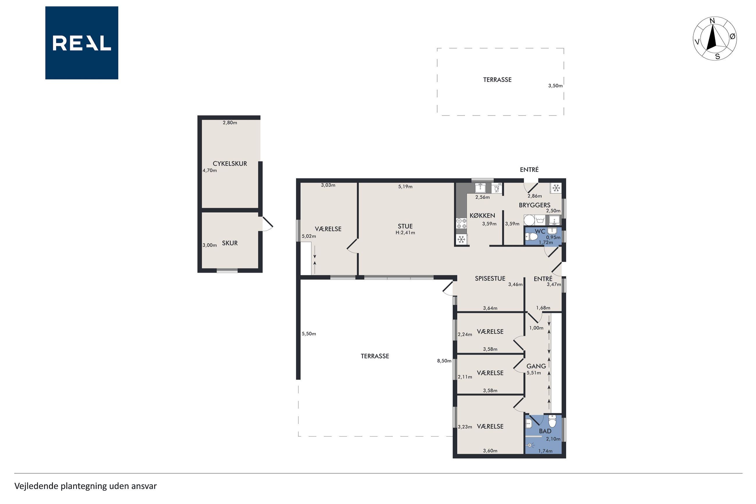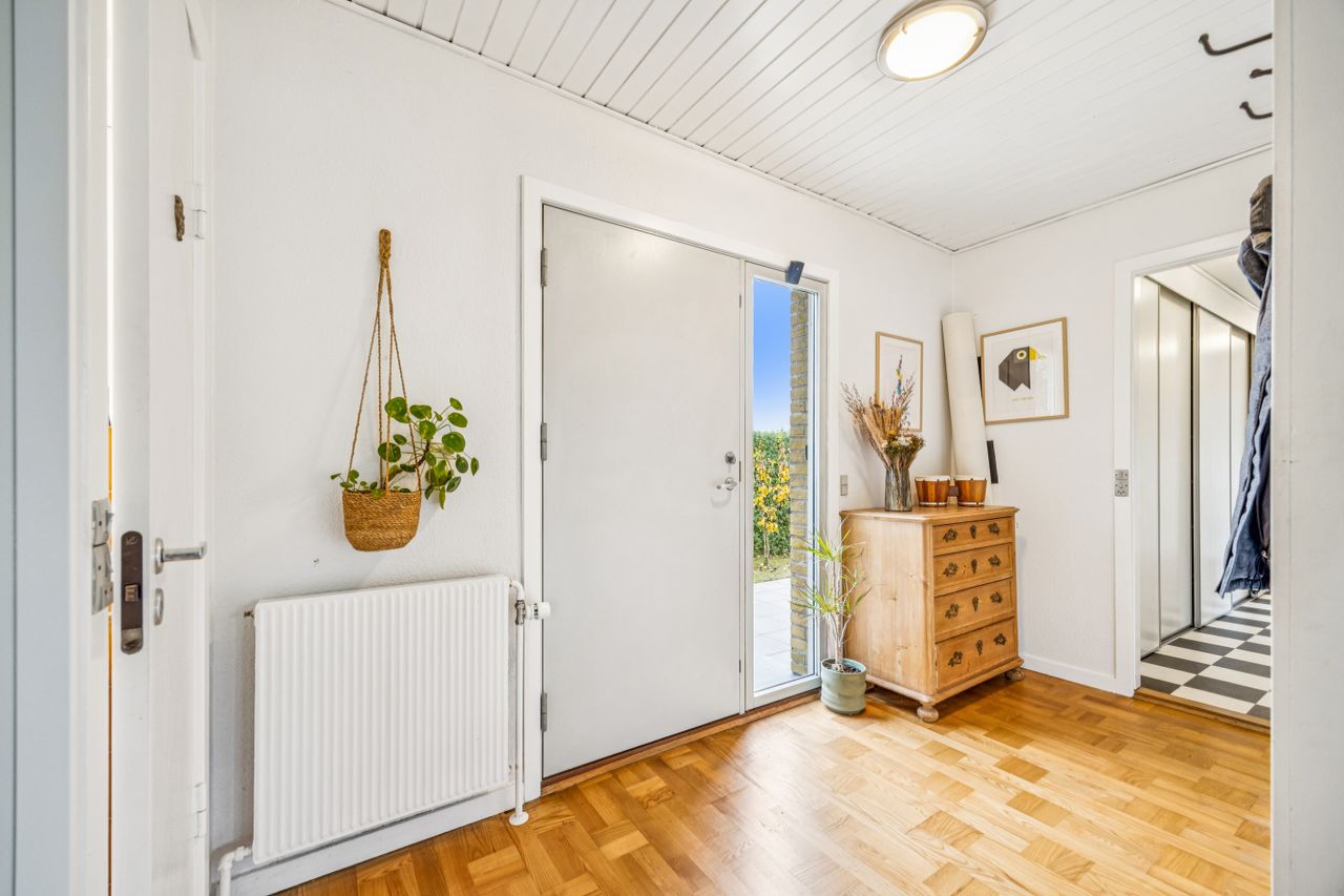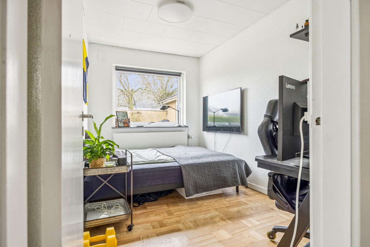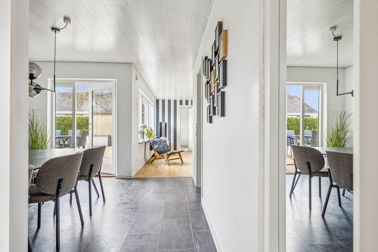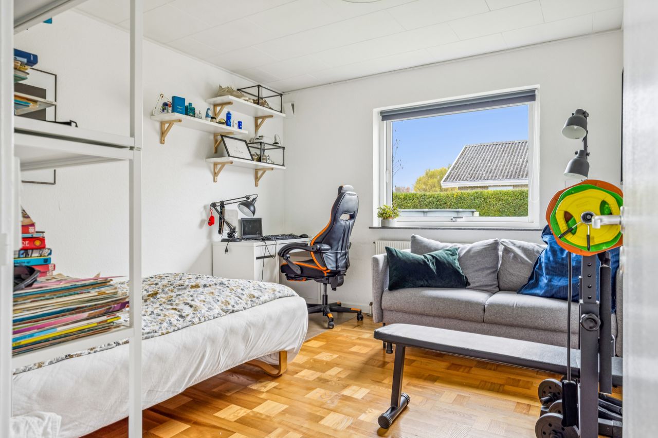 Velkommen til denne skønne etplansvilla, der strækker sig over 141 kvadratmeter og tilbyder en perfekt kombination af komfort og funktionalitet. Når du træder ind i boligen, bliver du mødt af en rummelig entre, der fører dig videre til en praktisk fordelingsgang. Her finder du børneafdelingen med tre lyse og indbydende soveværelser, som alle har god plads til leg og kreativ udfoldelse.