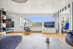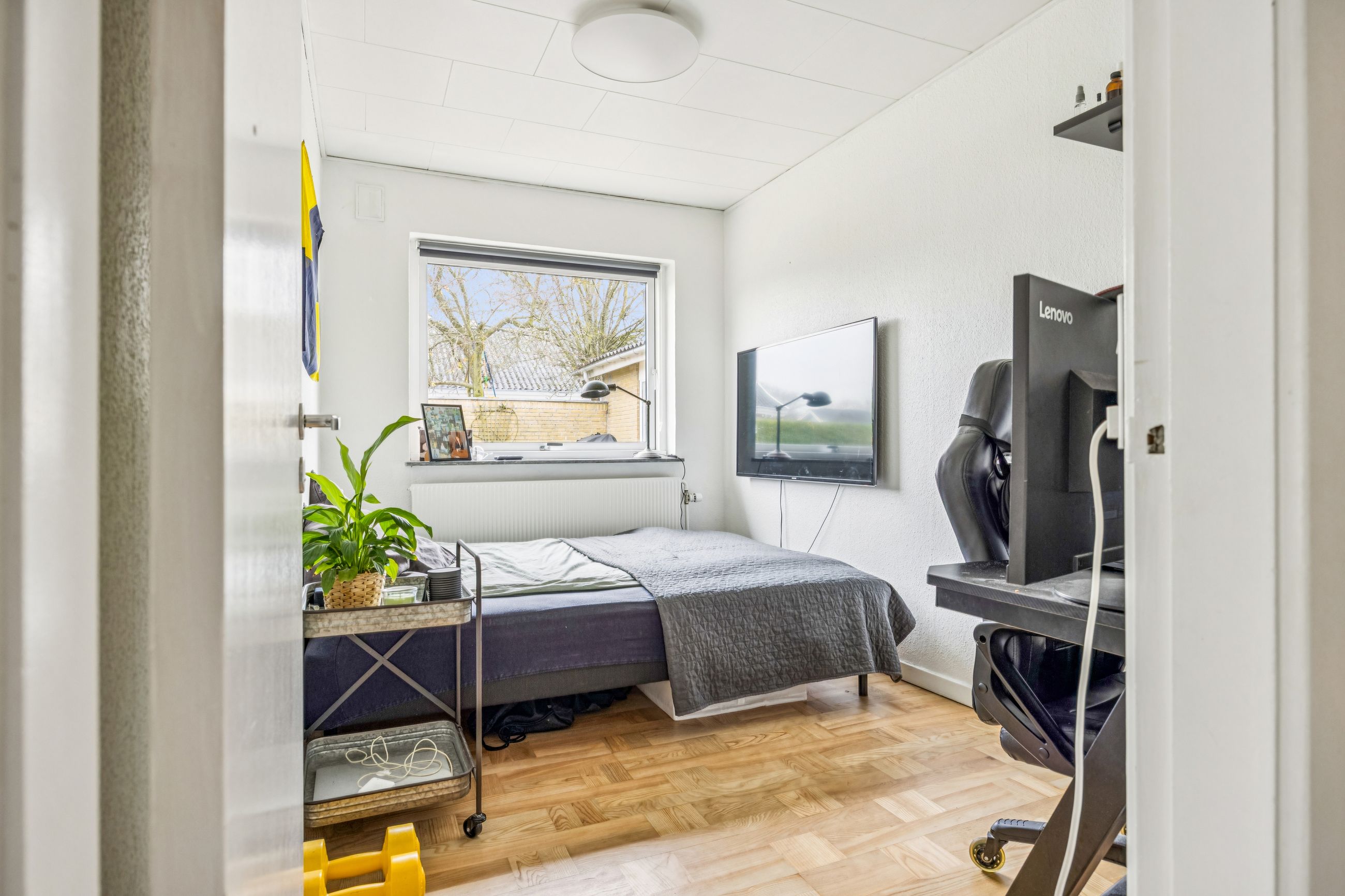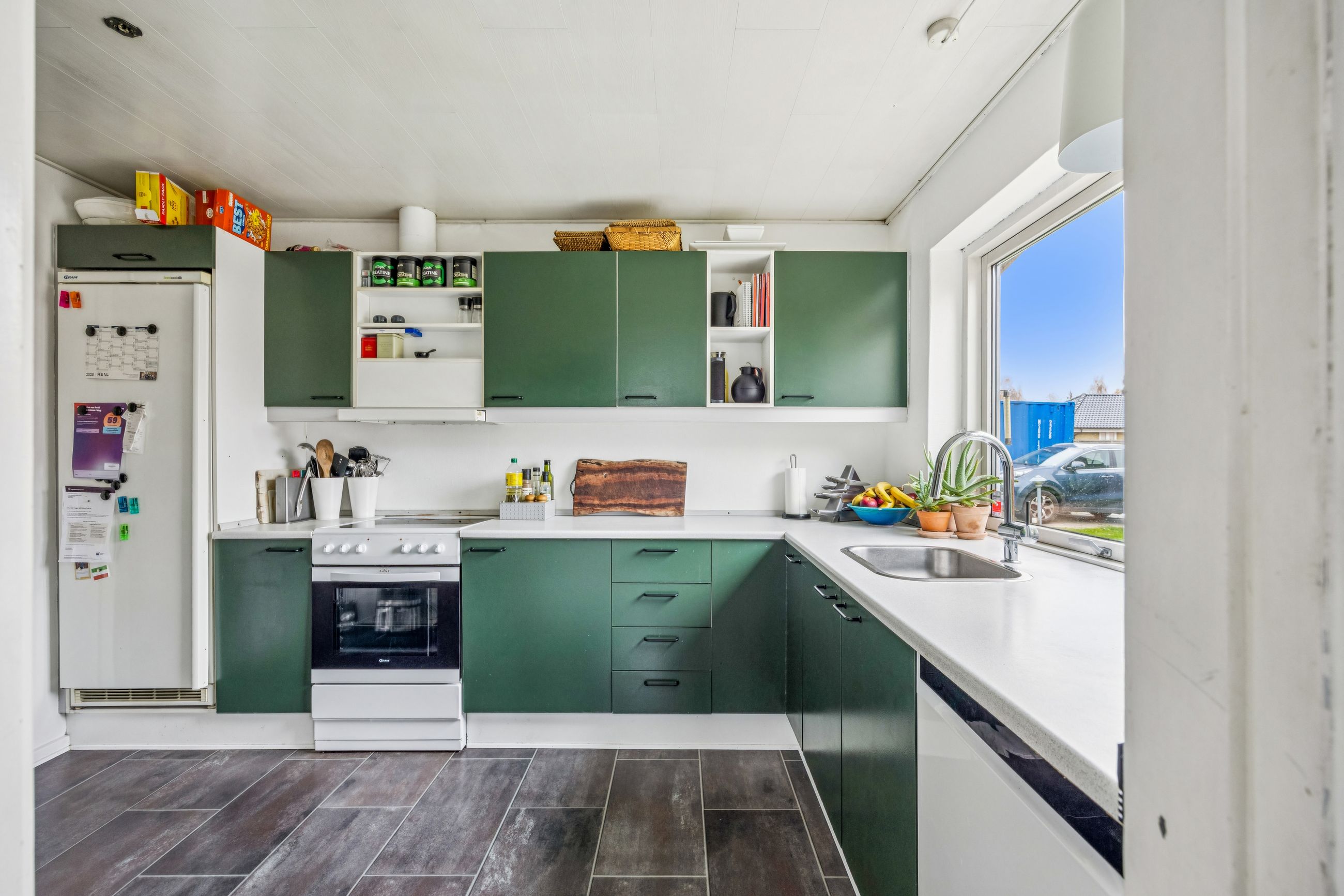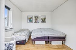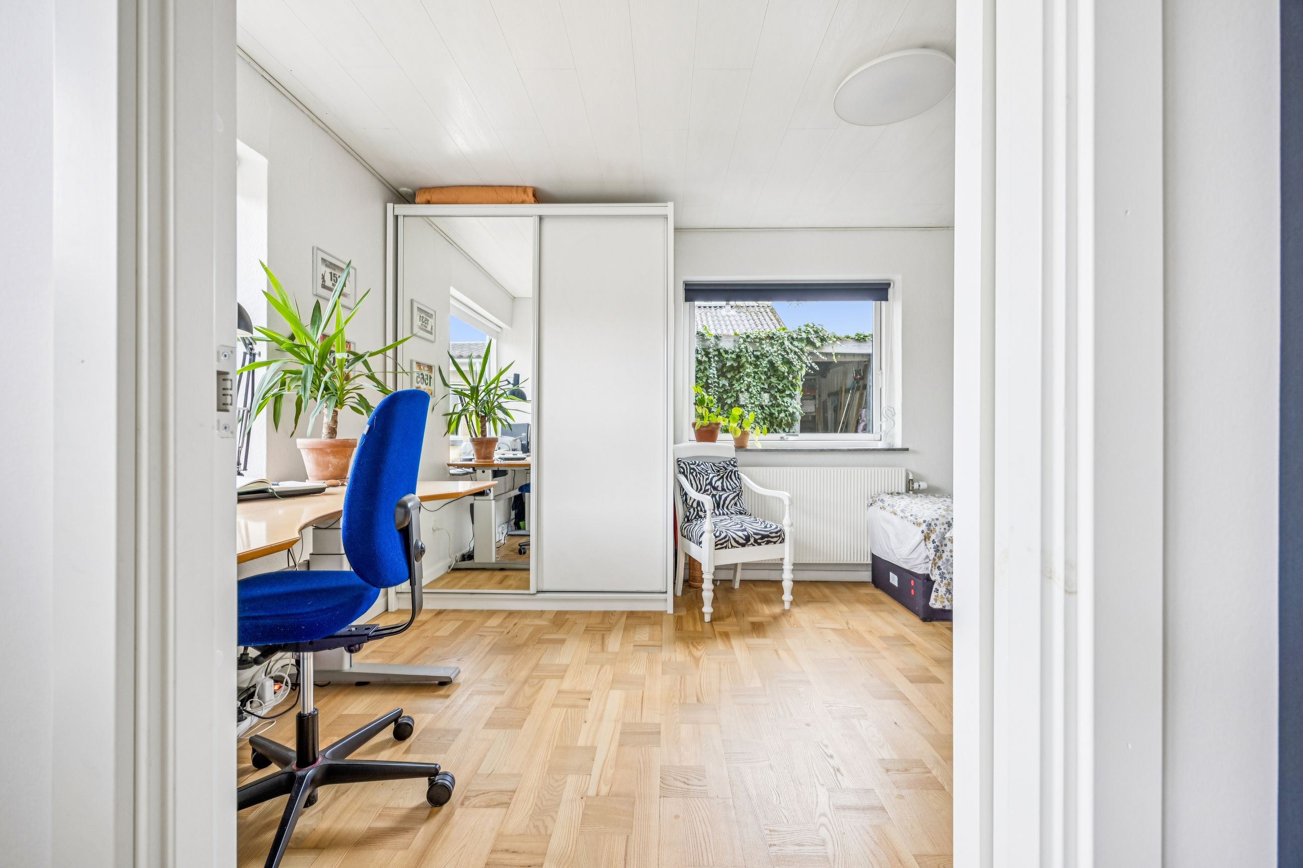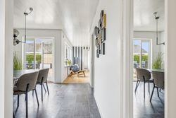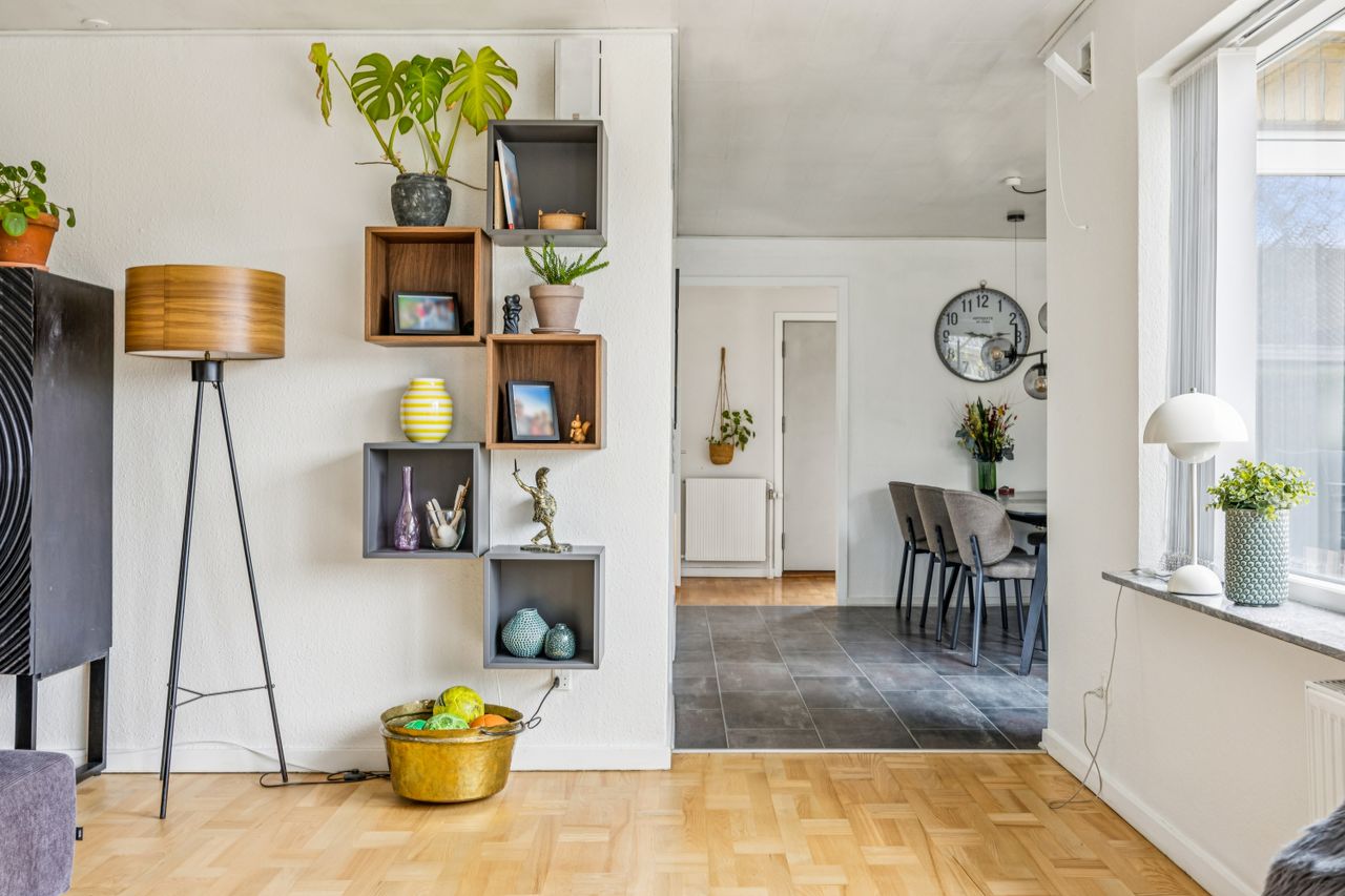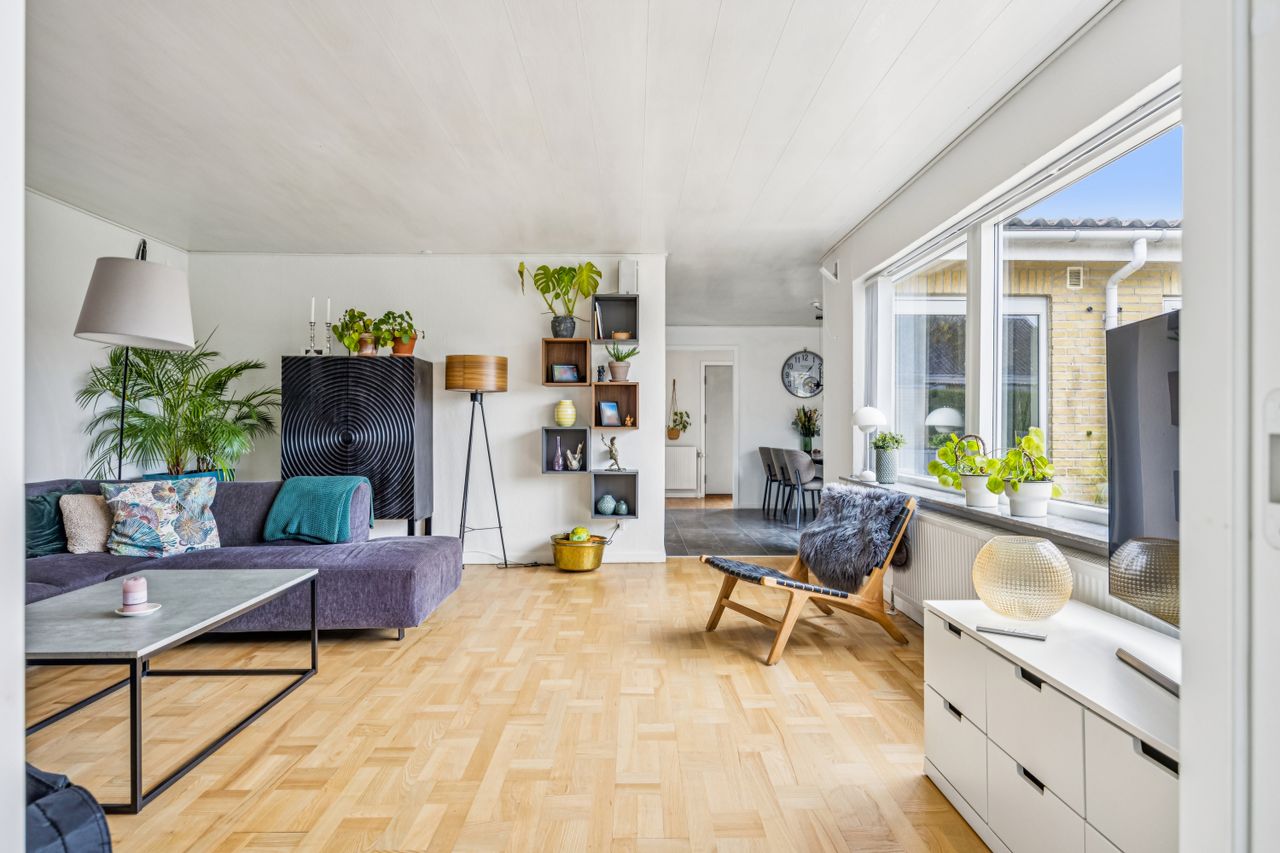 Køkkenet er rummeligt og inviterer til madlavning med adgang direkte til spiseafdelingen. Herfra kan familien samles om måltiderne i den lyse stue, hvor store vinduespartier giver et dejligt lysindfald hele dagen. Fra stuen er der adgang til forældresoveværelset, som tilbyder ro og privatliv.