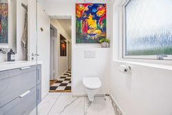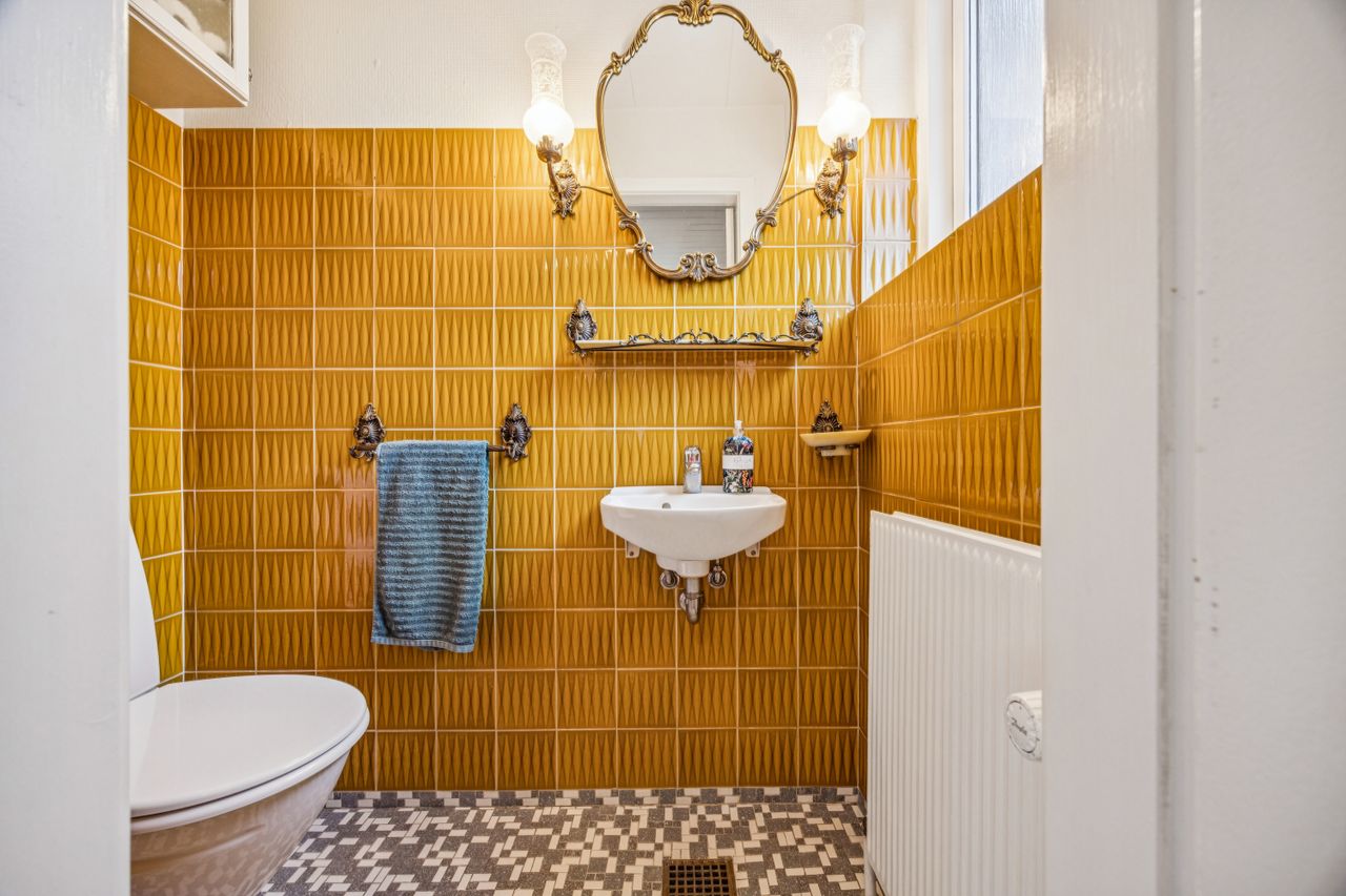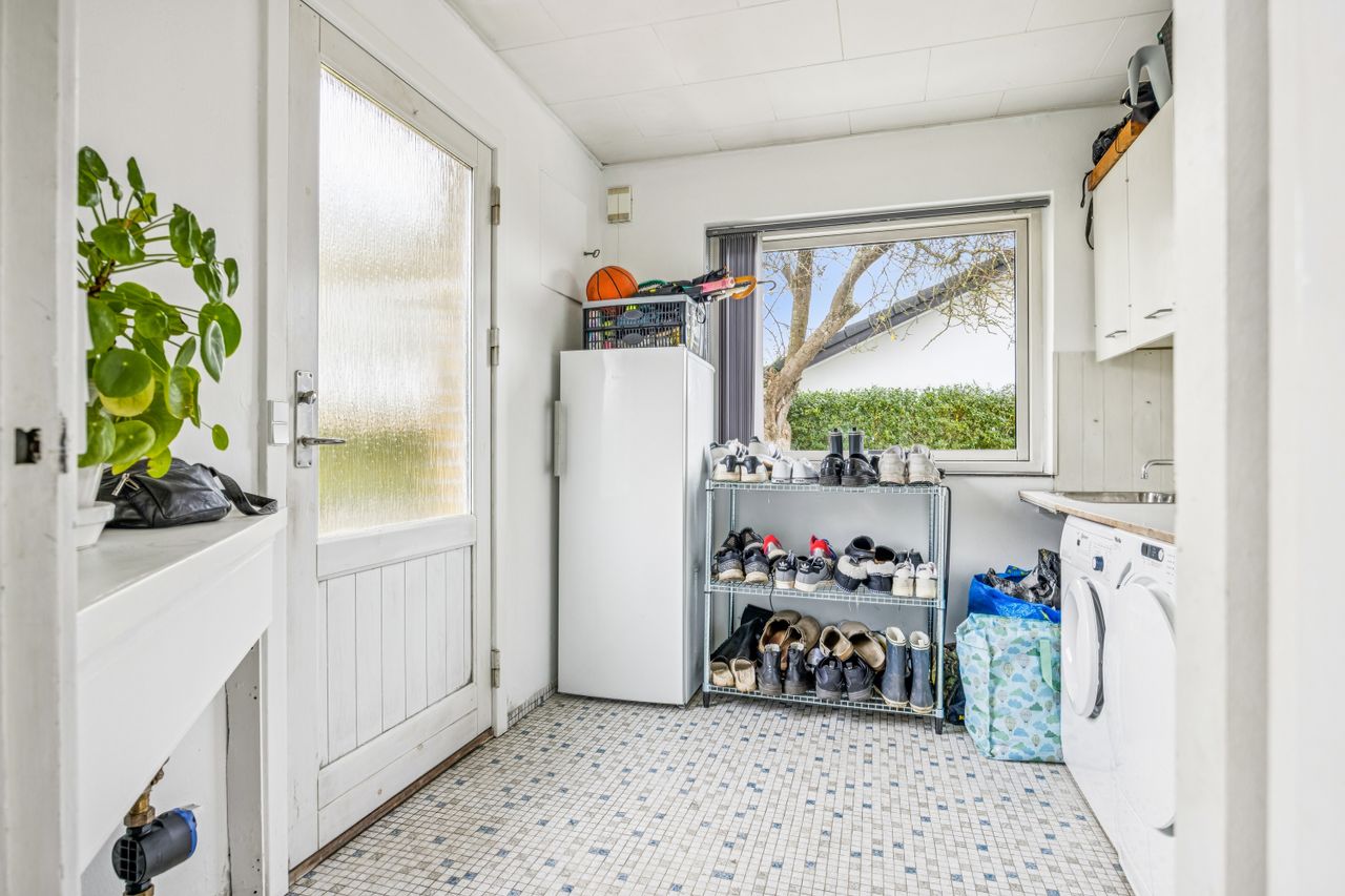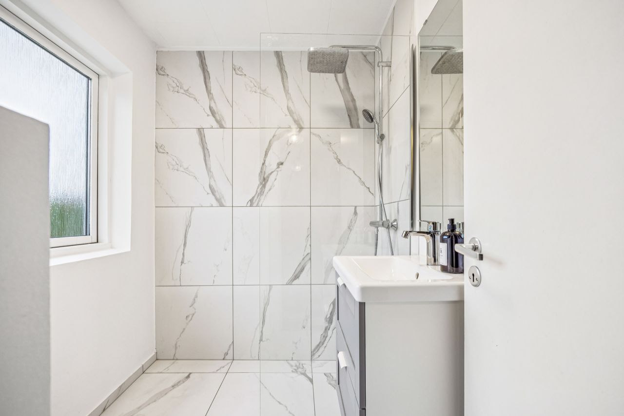 Det nyligt renoverede brusebadeværelse fra 2022 er både stilfuldt og funktionelt med moderne faciliteter, der gør hverdagen lettere. Derudover byder villaen på et gæstetoilet, der charmerer med sin autentiske 70'er vibe på klinkerne – en sjov detalje for dem, der elsker retro-stilen.