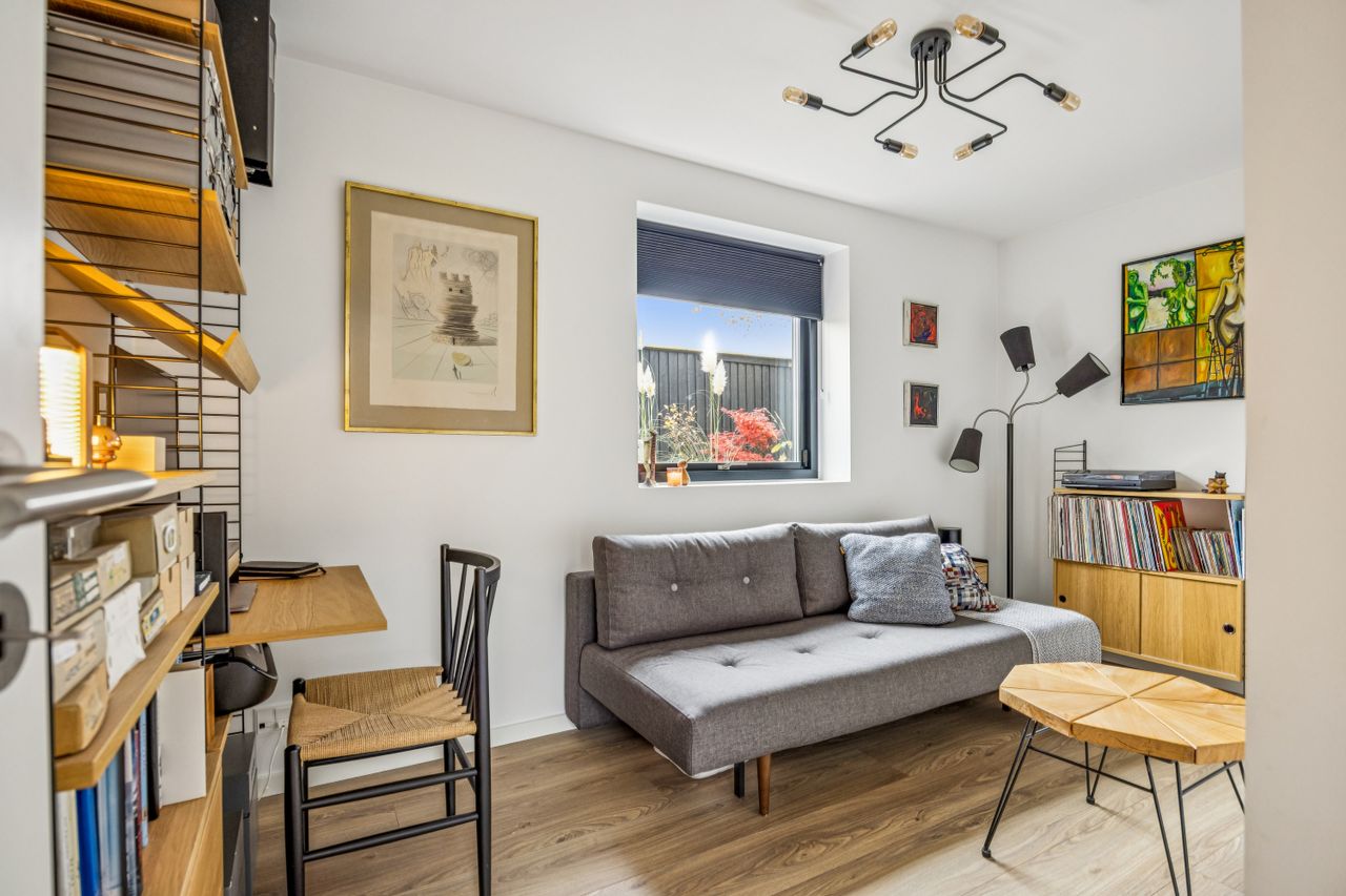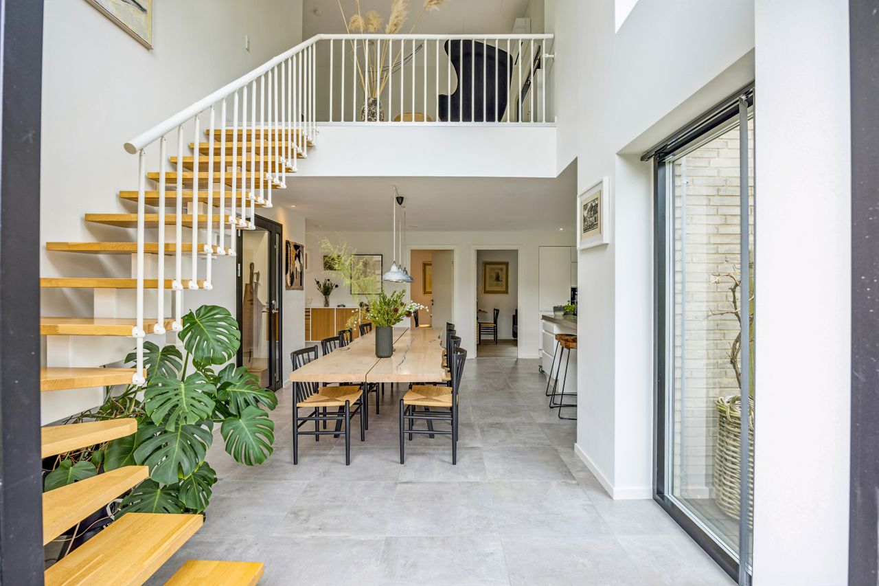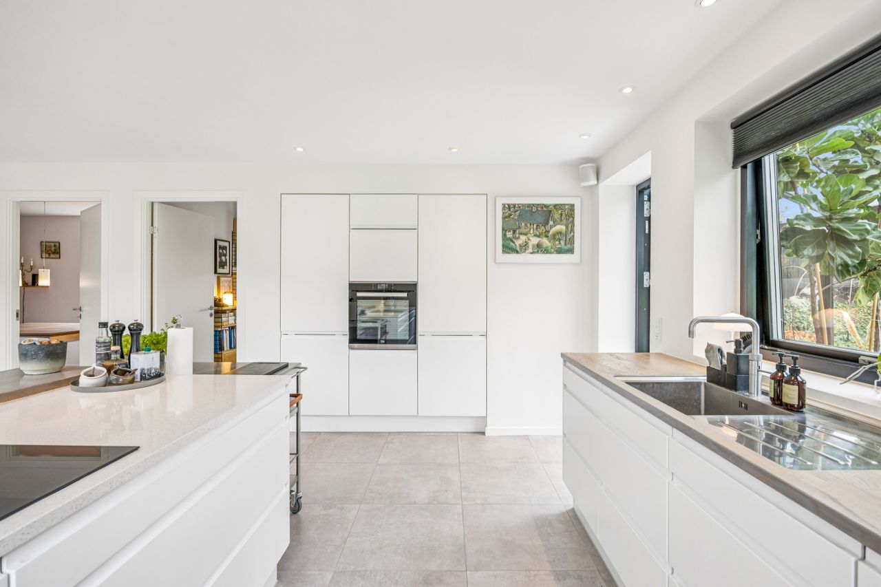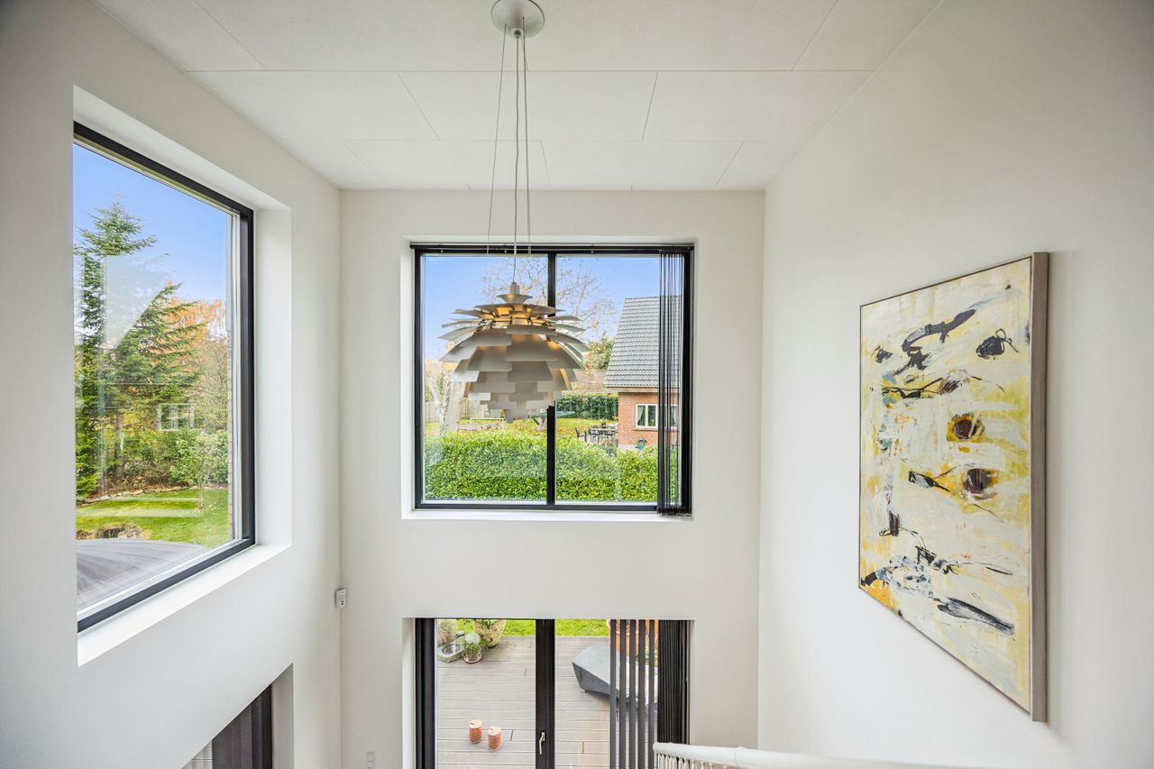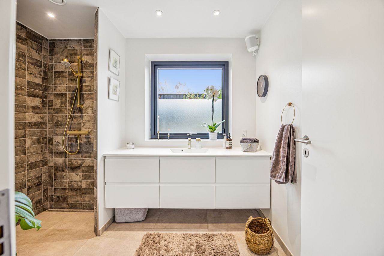 I stueplan træder man ind i et rummeligt leverum med køkken-alrum, hvor lyset strømmer ind gennem de store vinduespartier. Herfra er der direkte adgang til den opvarmede udestue som udgør 20 kvm – en sand oase, hvor man kan nyde roen året rundt. Stueplanet rummer desuden to værelser, et stort badeværelse samt et praktisk bryggers.