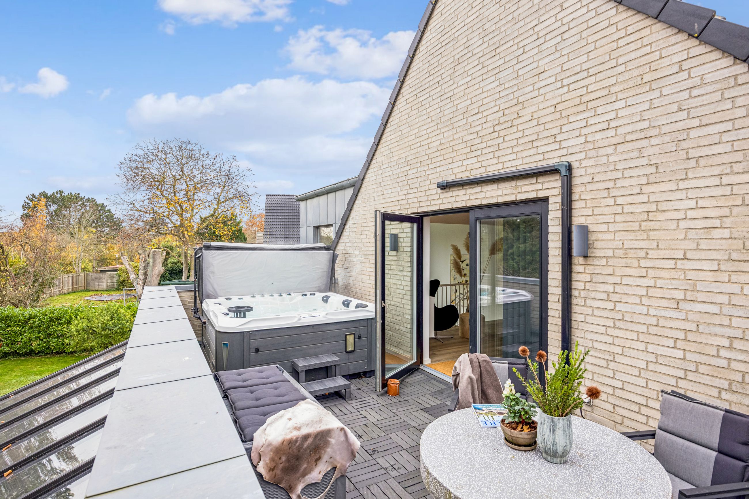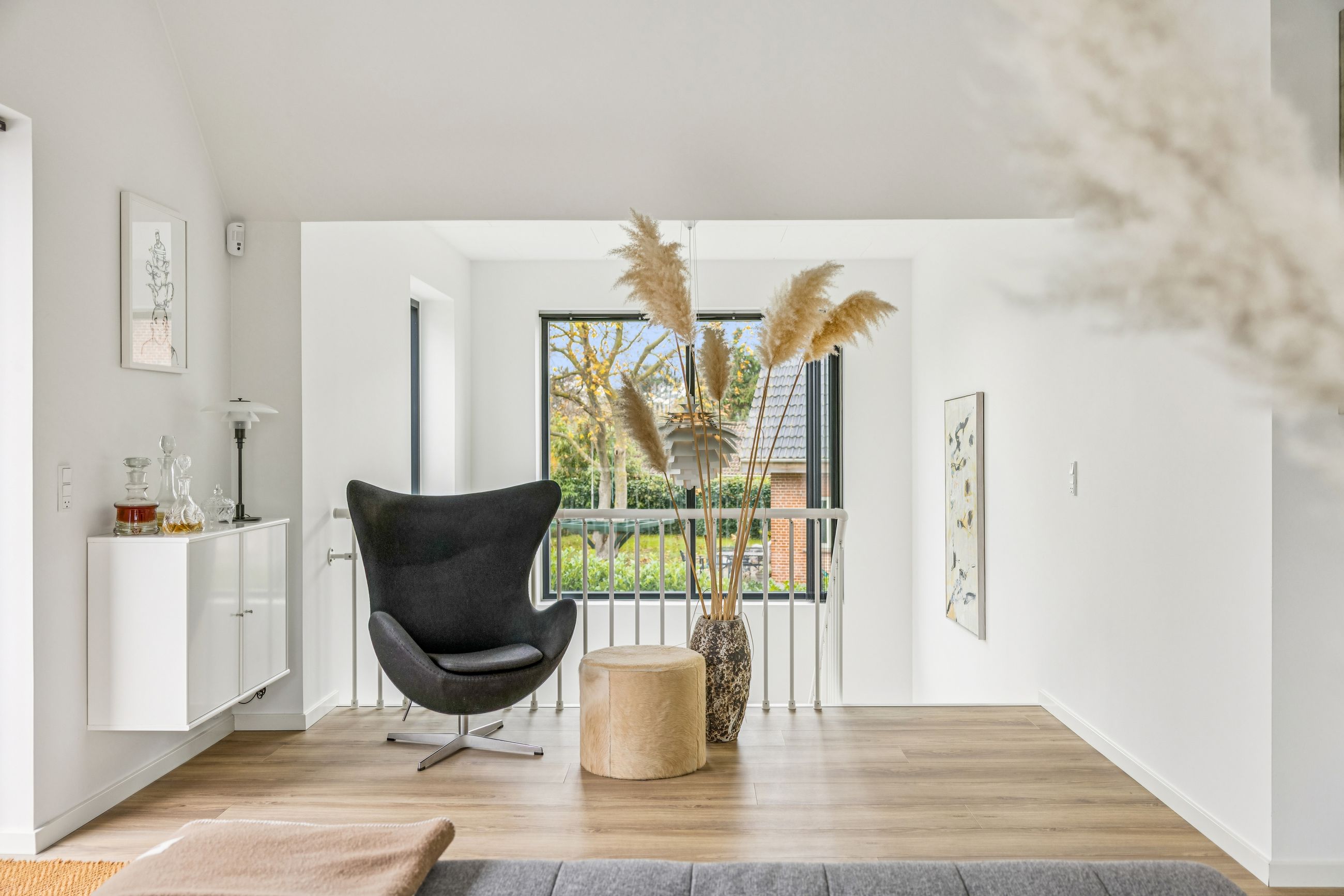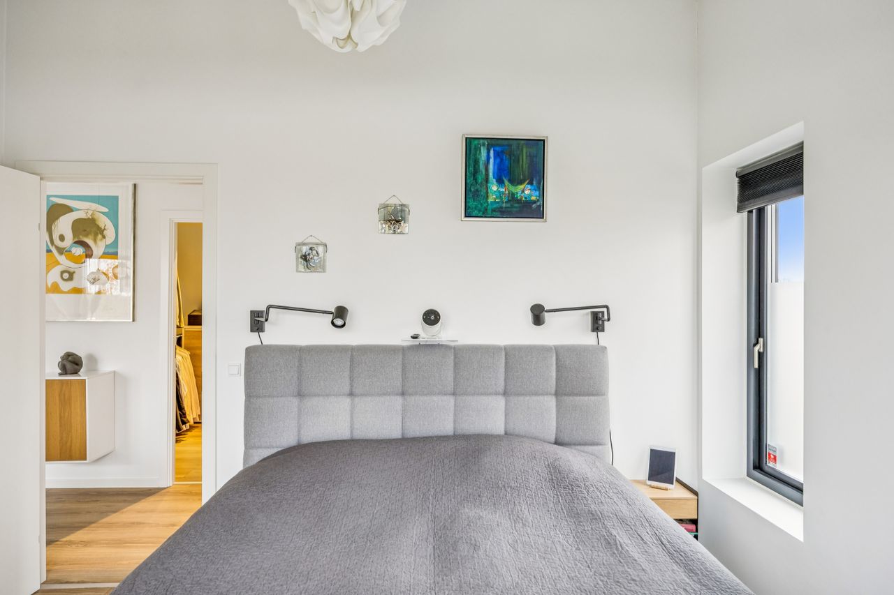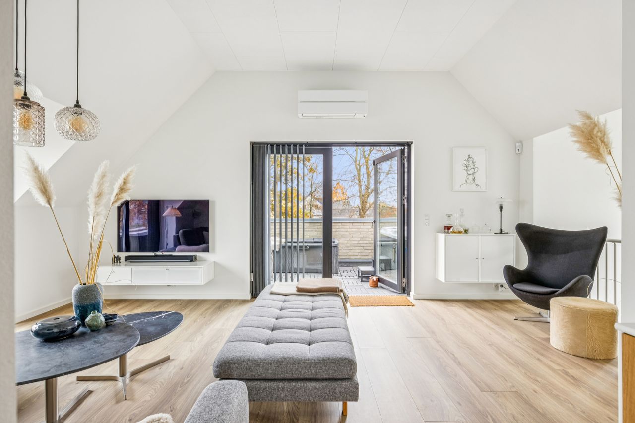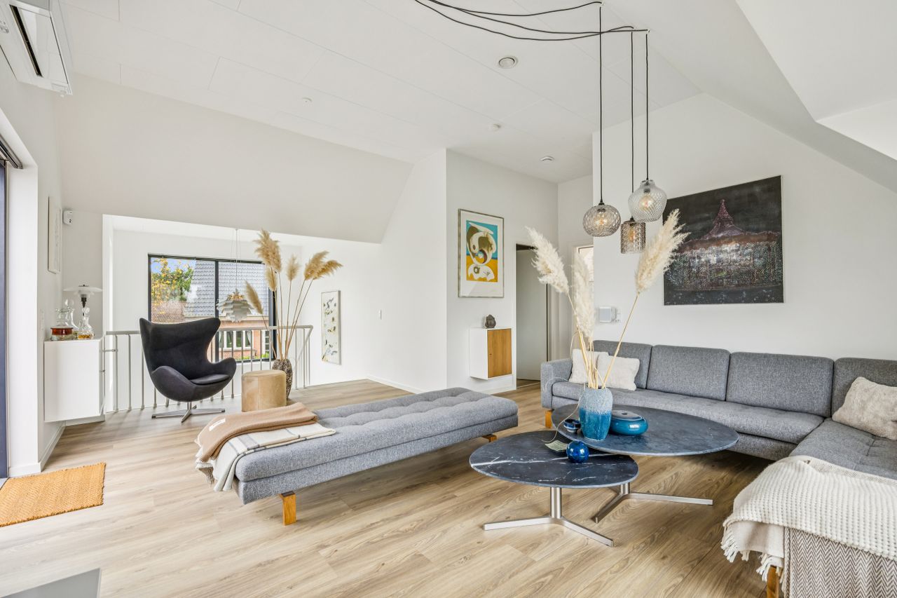 På første sal finder man et stort badeværelse med både brusekabine og badekar, et stort soveværelse samt et walk-in closet. Den smukt designede stue ligger også heroppe og tilbyder en betagende udsigt over Køge Bugt. Fra stuen er der udgang til altanen med spa – det perfekte sted at slappe af og nyde solen mens man skuer ud over vandet.