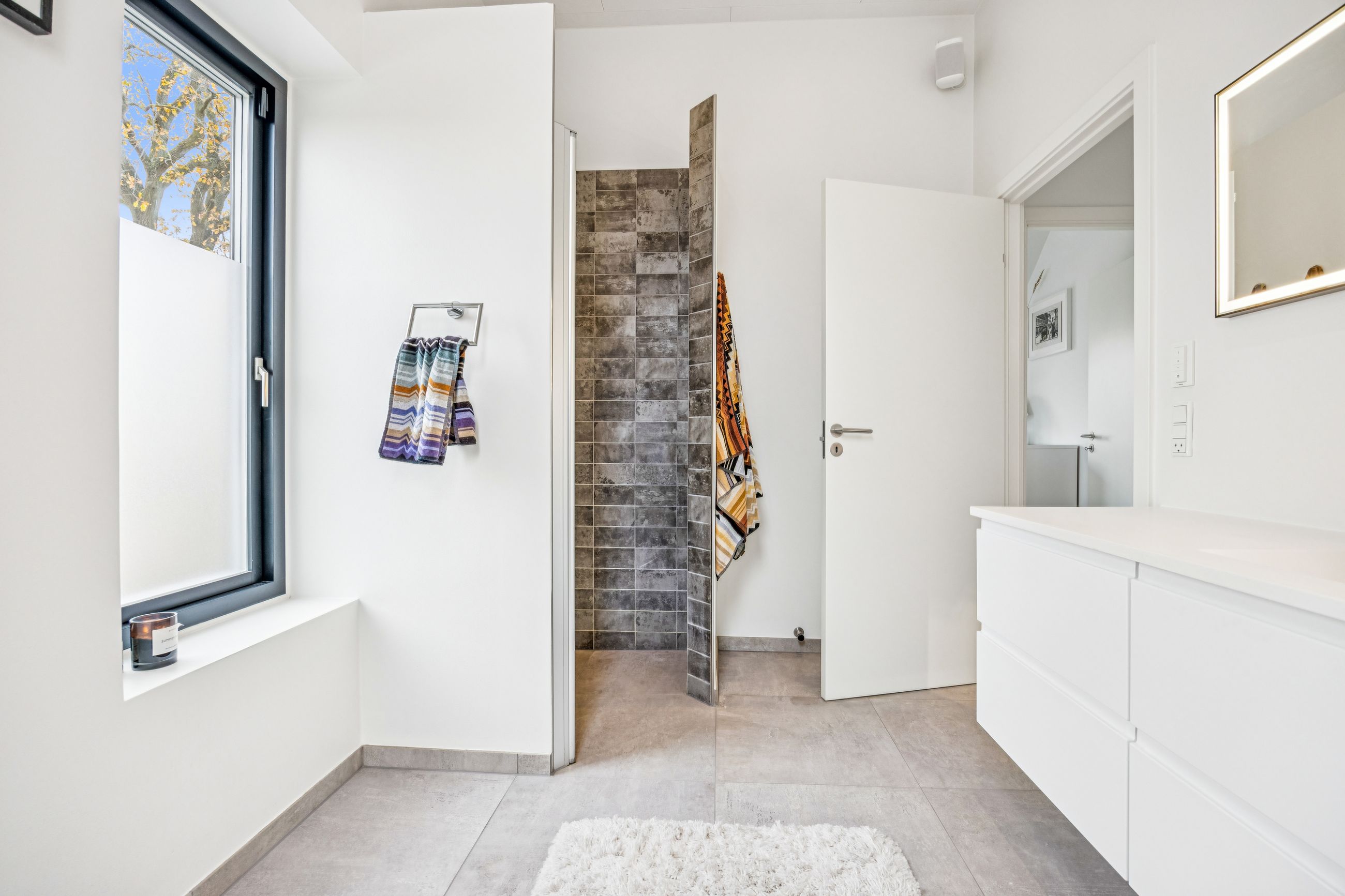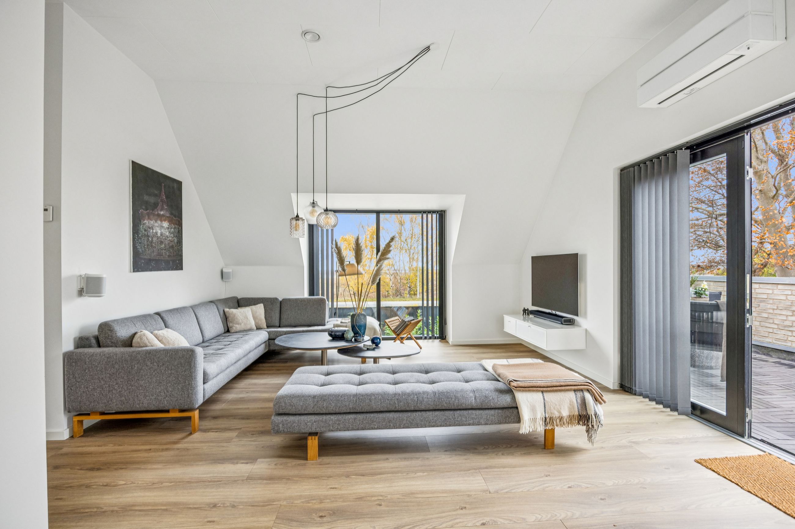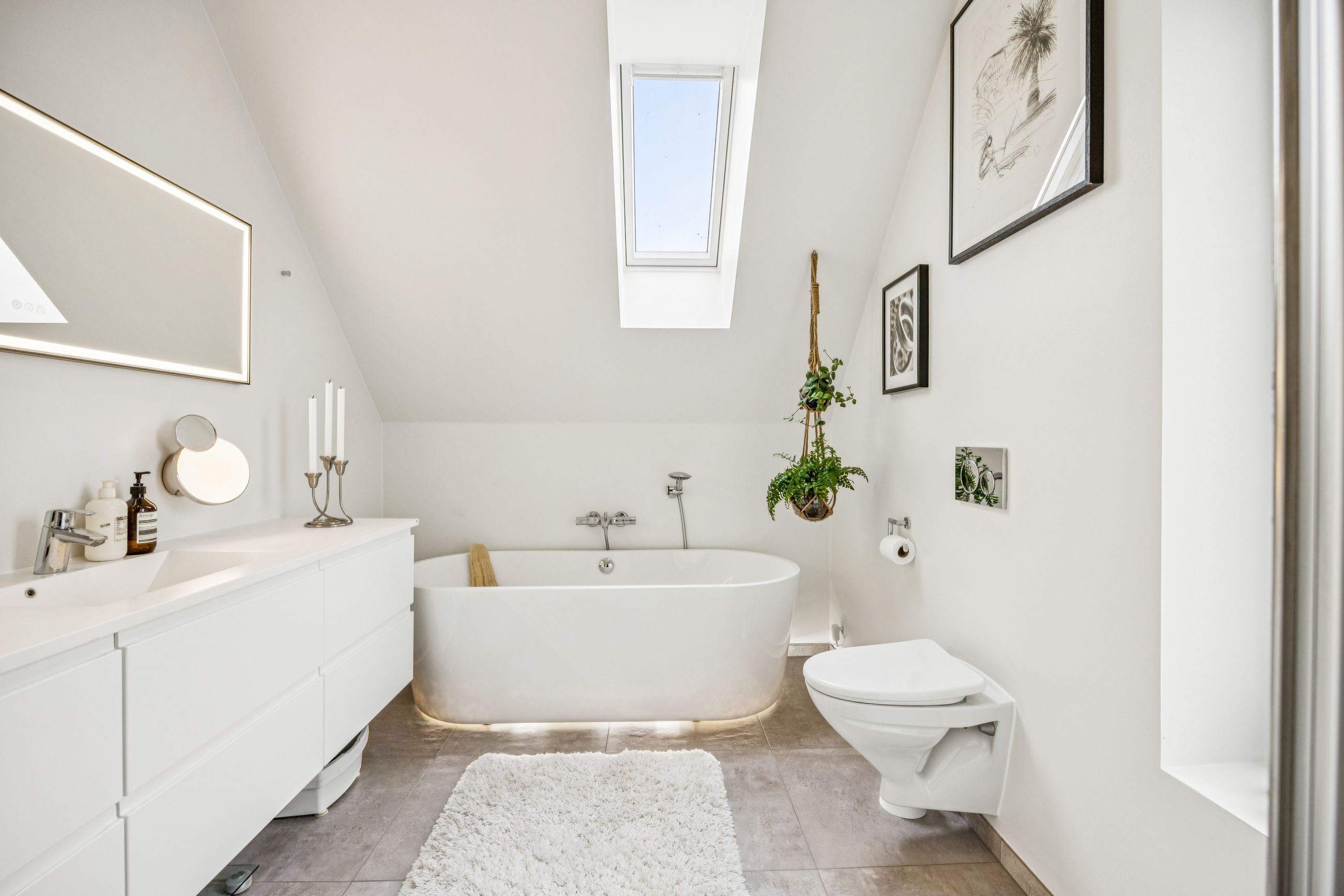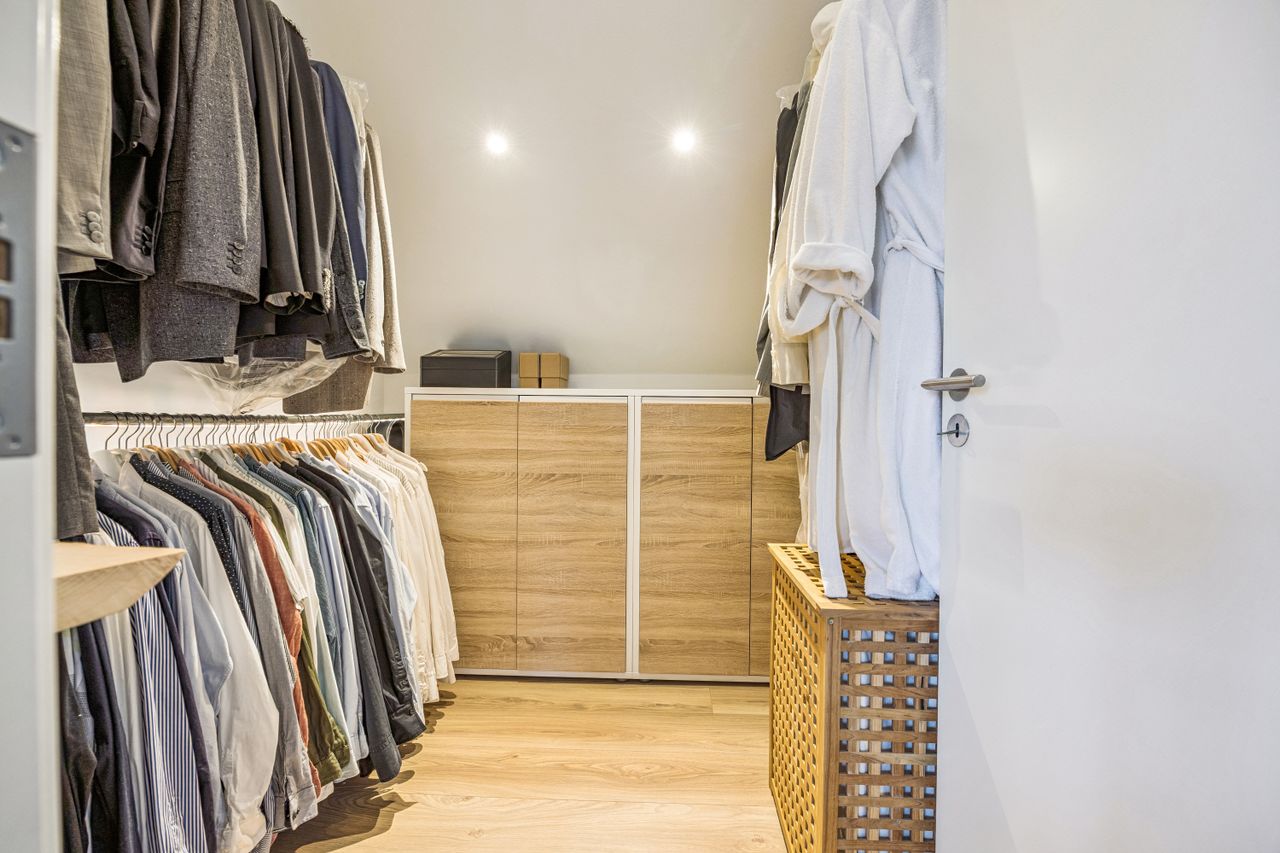 På første sal finder man et stort badeværelse med både brusekabine og badekar, et stort soveværelse samt et walk-in closet. Den smukt designede stue ligger også heroppe og tilbyder en betagende udsigt over Køge Bugt. Fra stuen er der udgang til altanen med spa – det perfekte sted at slappe af og nyde solen mens man skuer ud over vandet.