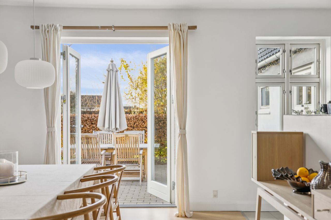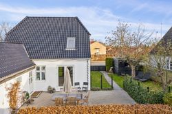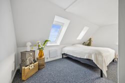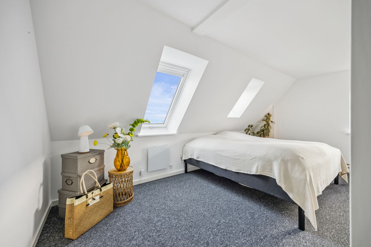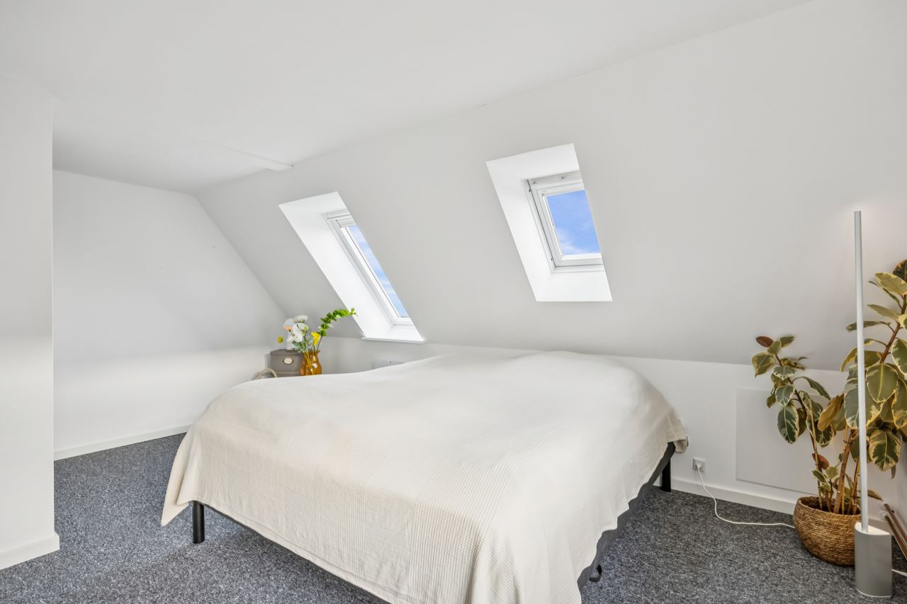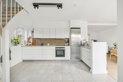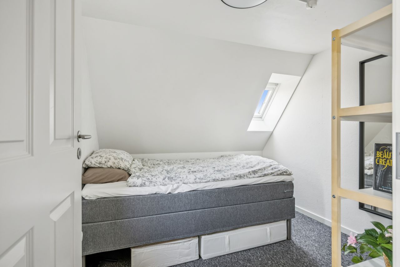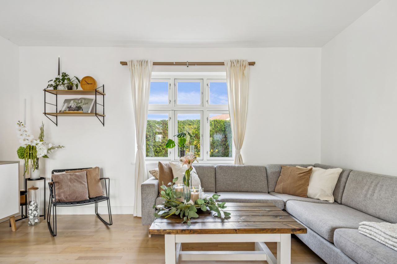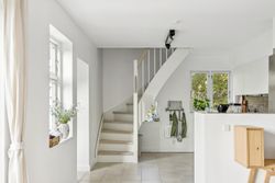 På første sal finder du tre rummelige soveværelser, der alle er lyse og indbydende. Disse værelser giver rig mulighed for personlig indretning og komfortabel overnatning for hele familien. Stueetagen byder på et åbent køkken-alrum med direkte adgang til en solrig fliseterrasse - det perfekte sted at nyde morgenkaffen eller underholde gæster på de lange sommeraftener.