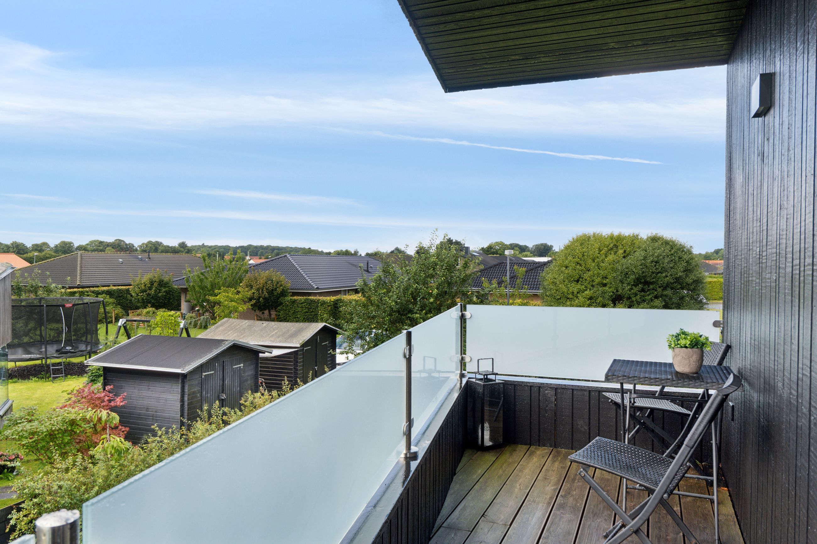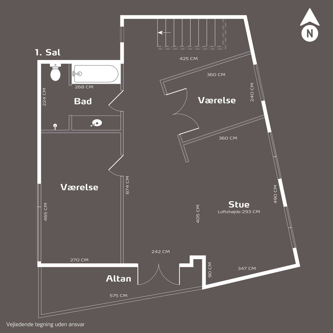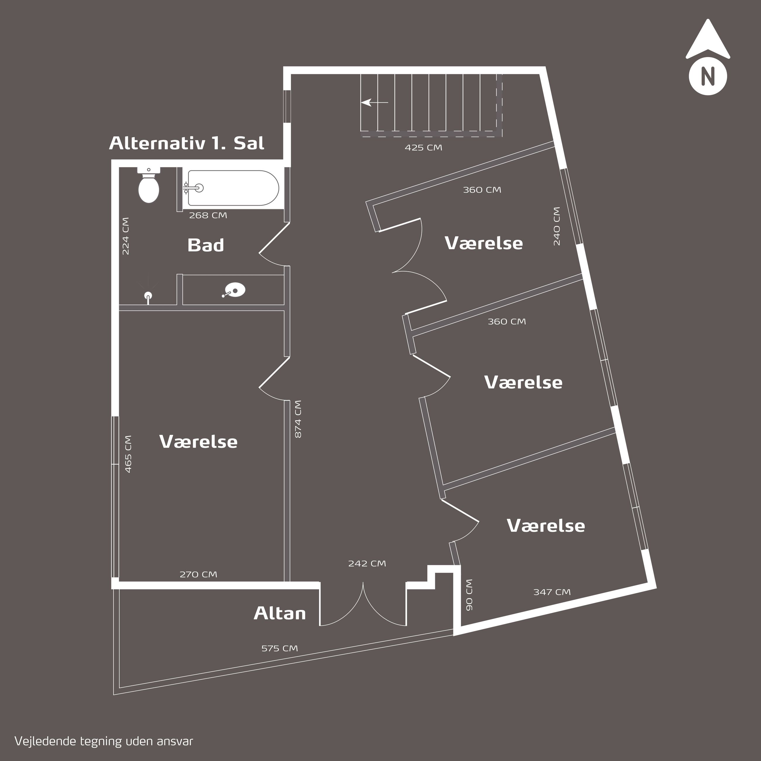 På første sal finder I to rummelige soveværelser samt endnu et stort badeværelse. Fra denne etage er der direkte adgang til en altan, hvorfra I kan nyde den betagende udsigt over landskabet. Der er desuden mulighed for at etablere yderligere to soveværelser efter behov.
