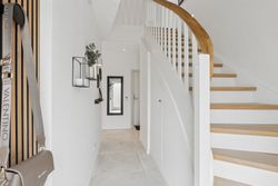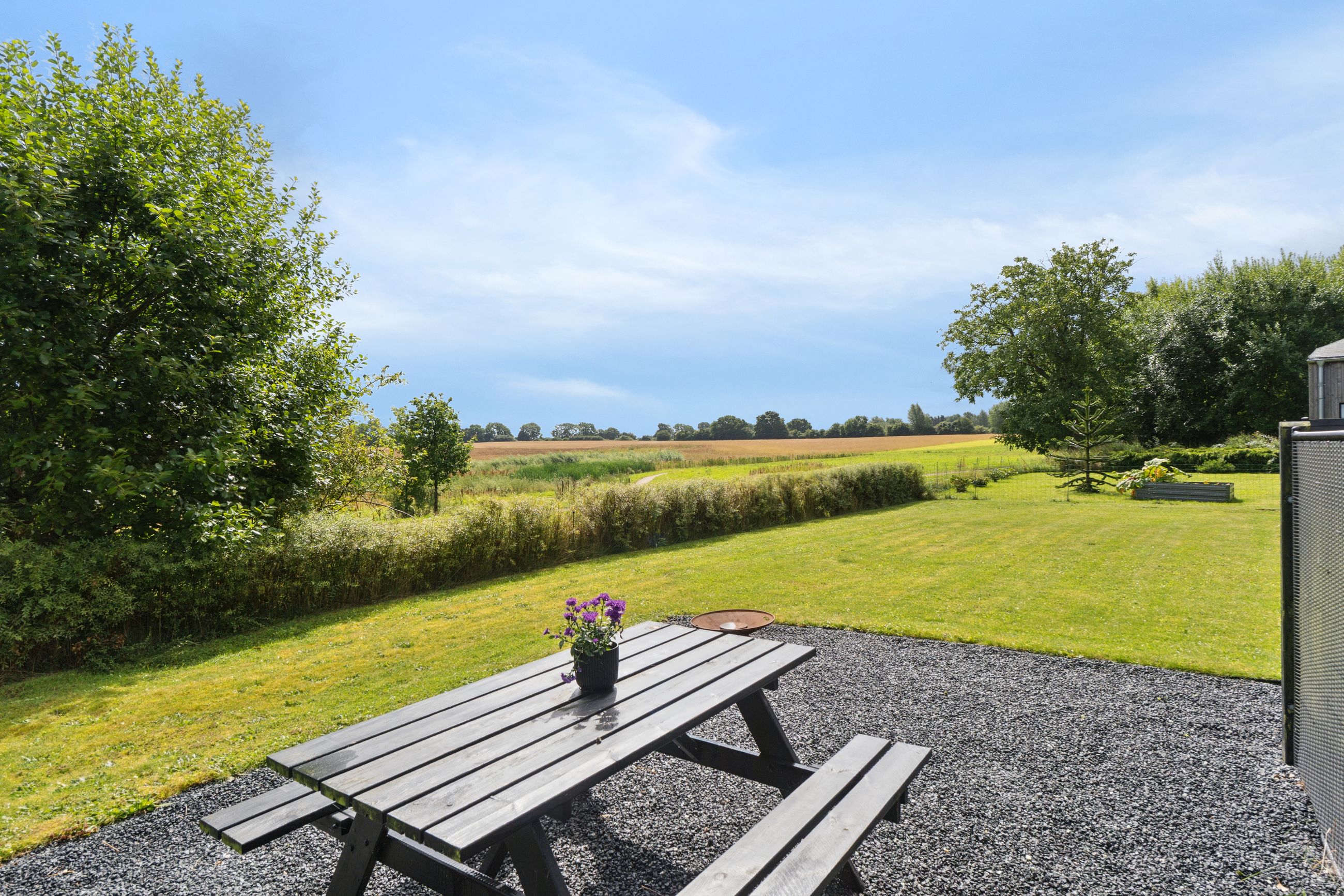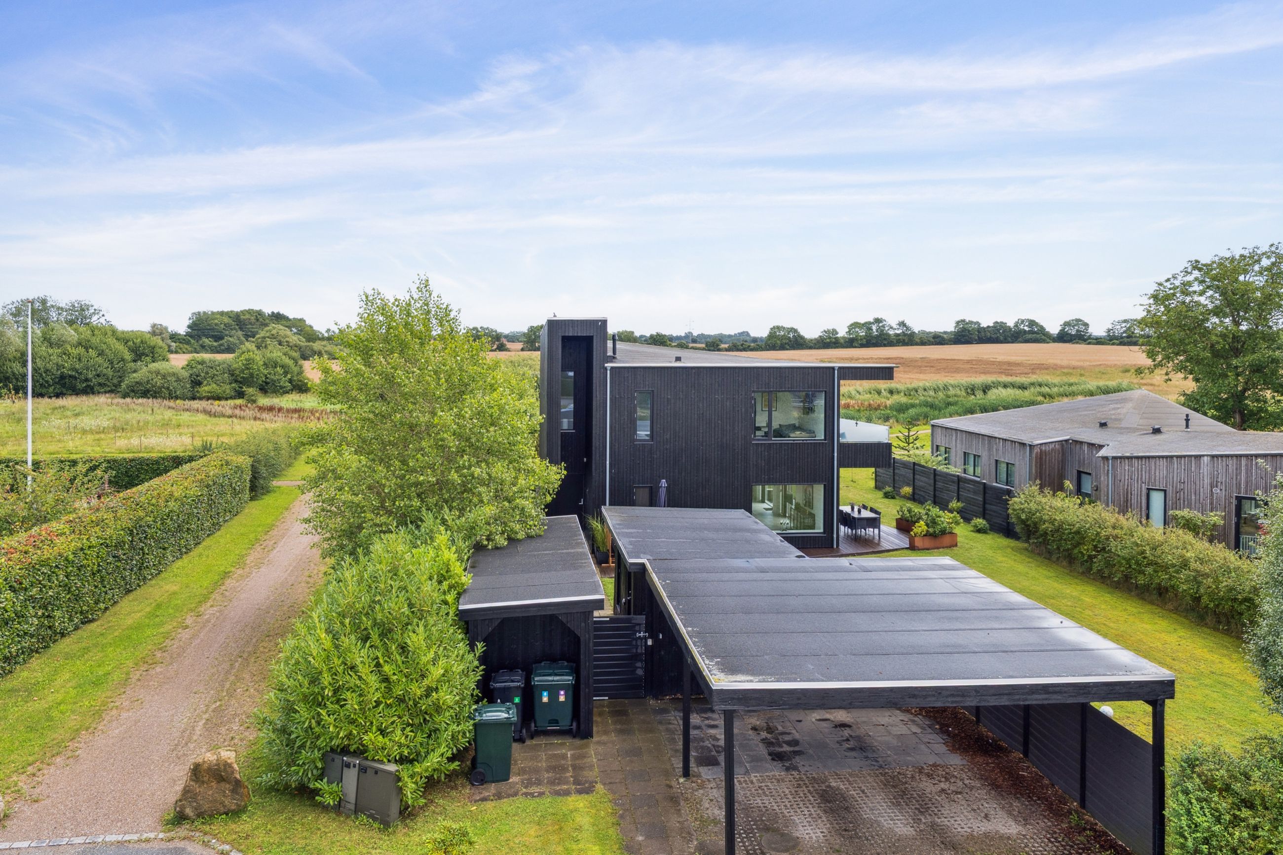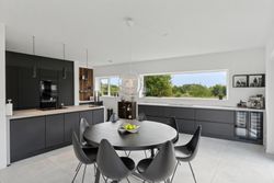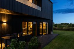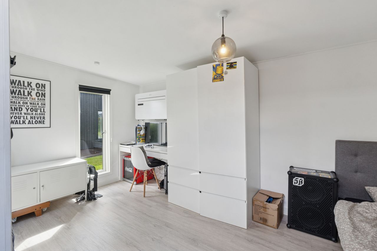 Ejendommen inkluderer også et anneks med flere anvendelsesmuligheder, udstyret med en luft-til-luft-varmepumpe for optimal komfort året rundt. Indendørs venter gulvvarme i alle rum samt eksklusive løsninger som BWT-anlæg, centralstøvsuger og Vola-armaturer.