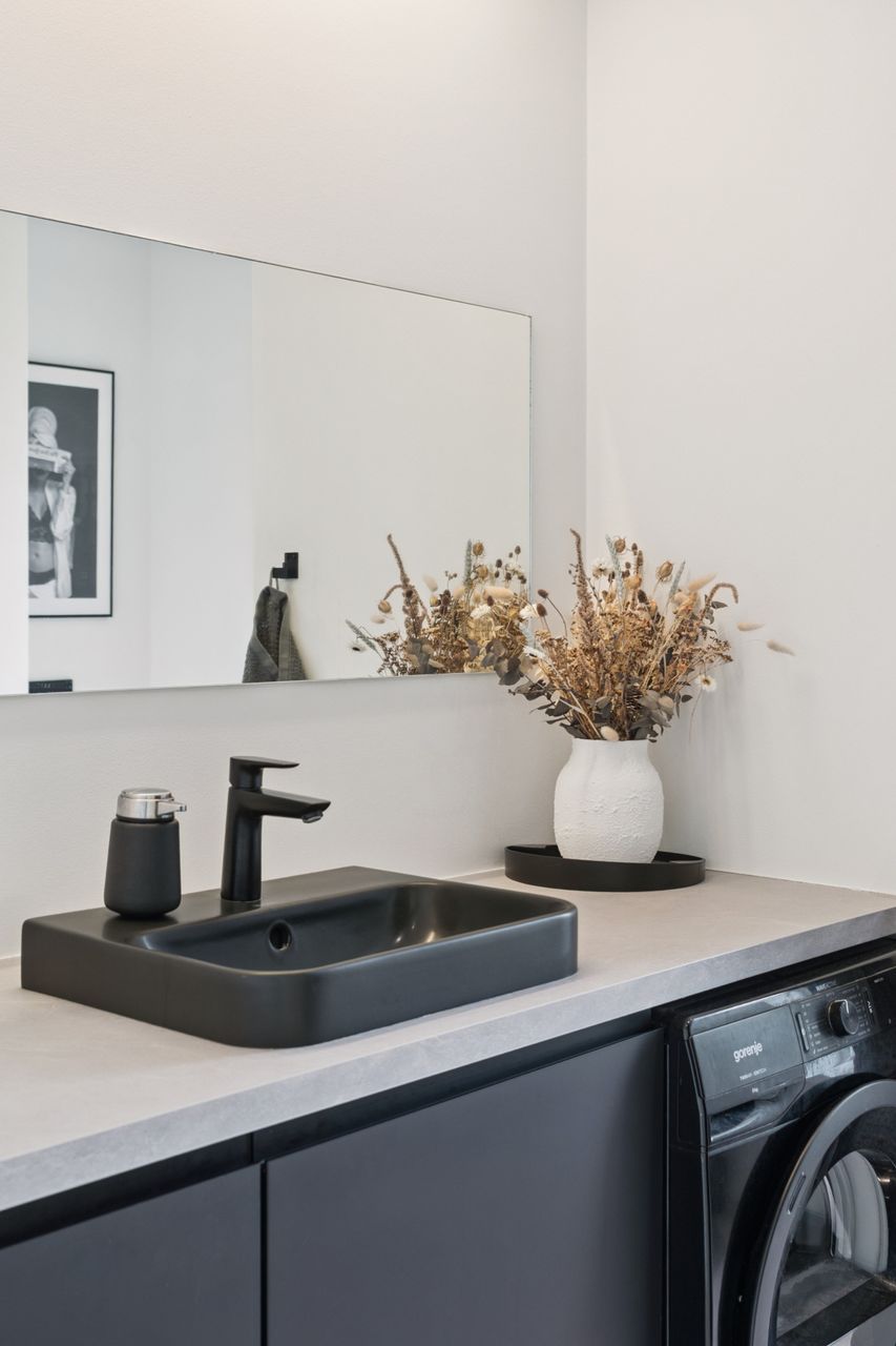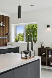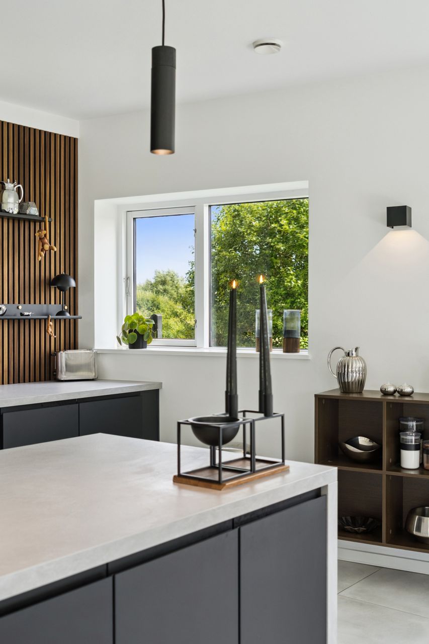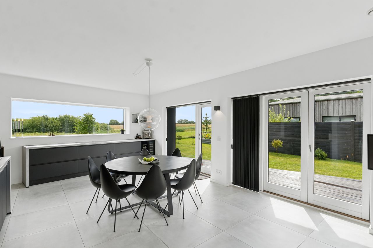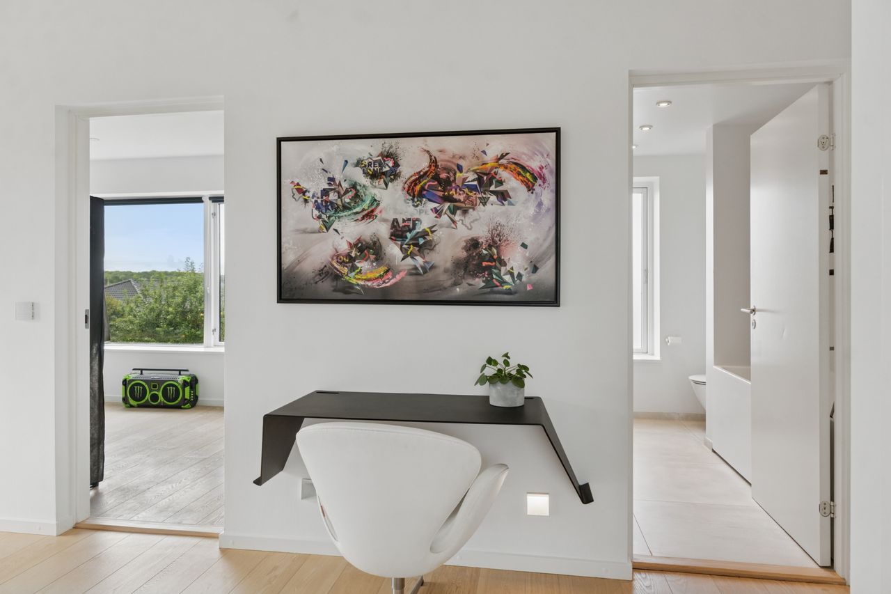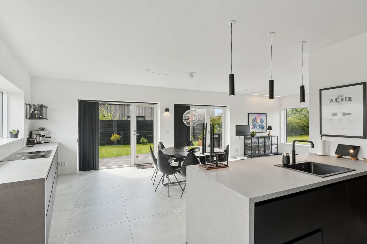Køkkenet er fra Vordingborg Køkkenet og byder på matsorte elementer kombineret med en lys bordplade for et elegant udtryk. Luksuriøse detaljer som Quooker med CUBE-funktion samt vinkøleskab gør madlavningen til en fornøjelse. Stueplan rummer også et stort badeværelse, der er både funktionelt og stilrent.