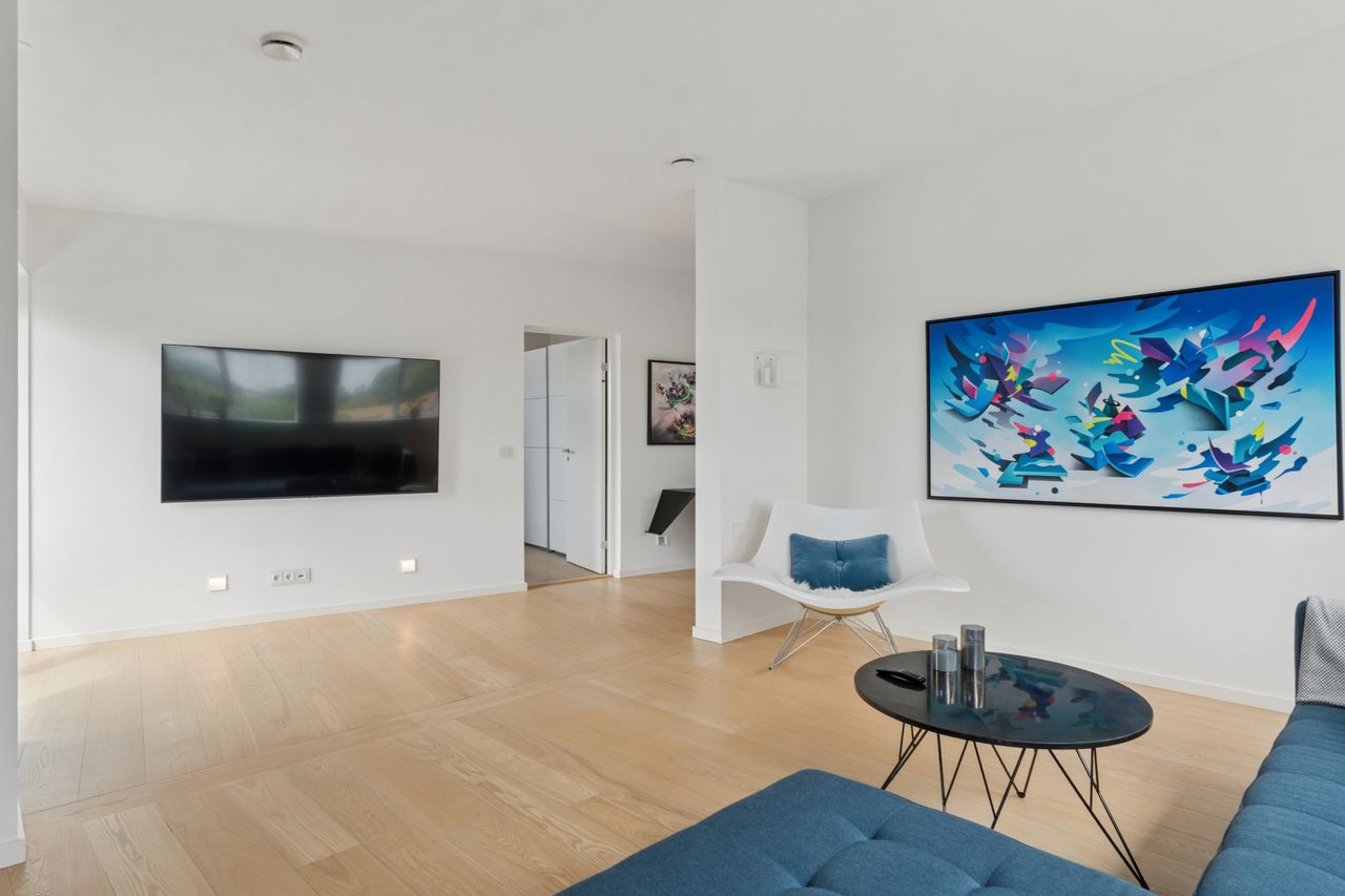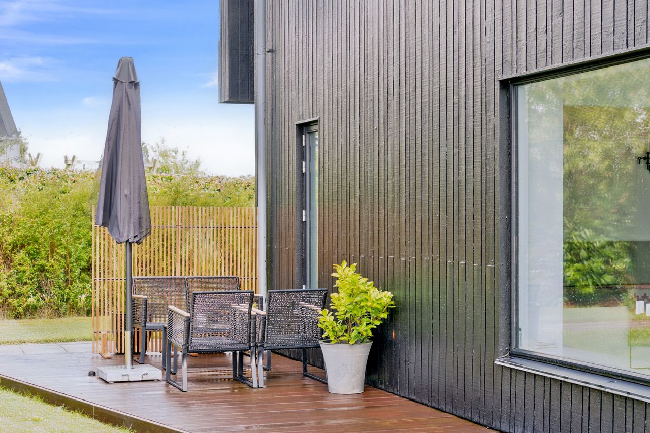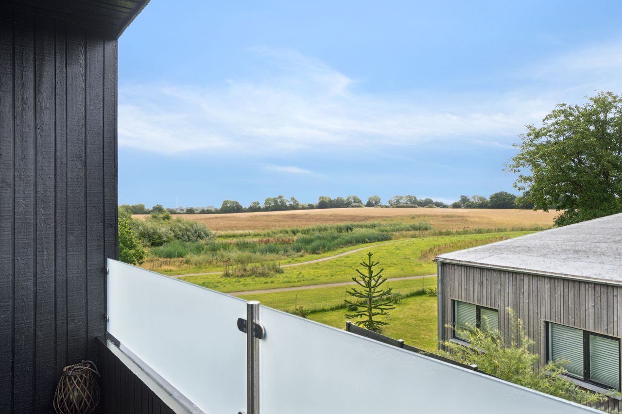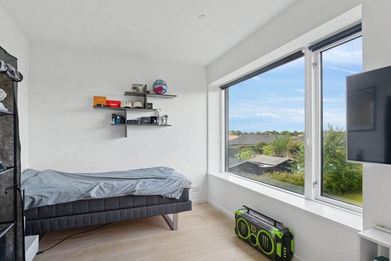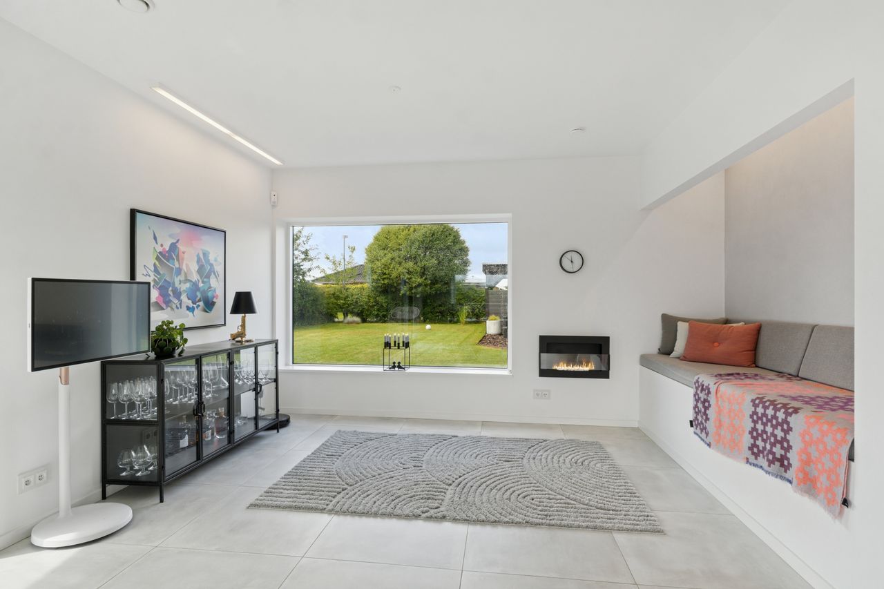 Køkkenet er fra Vordingborg Køkkenet og byder på matsorte elementer kombineret med en lys bordplade for et elegant udtryk. Luksuriøse detaljer som Quooker med CUBE-funktion samt vinkøleskab gør madlavningen til en fornøjelse. Stueplan rummer også et stort badeværelse, der er både funktionelt og stilrent.