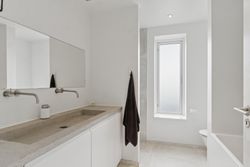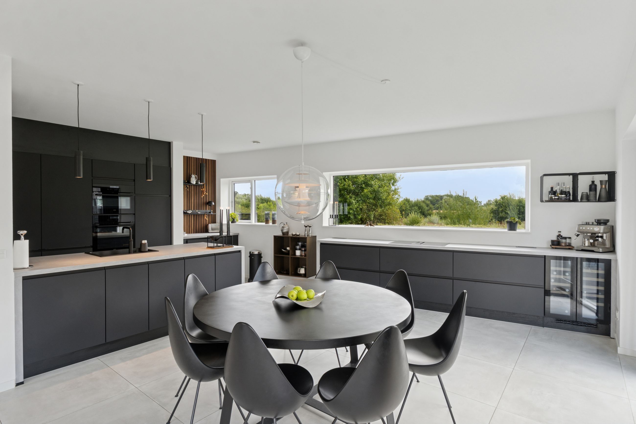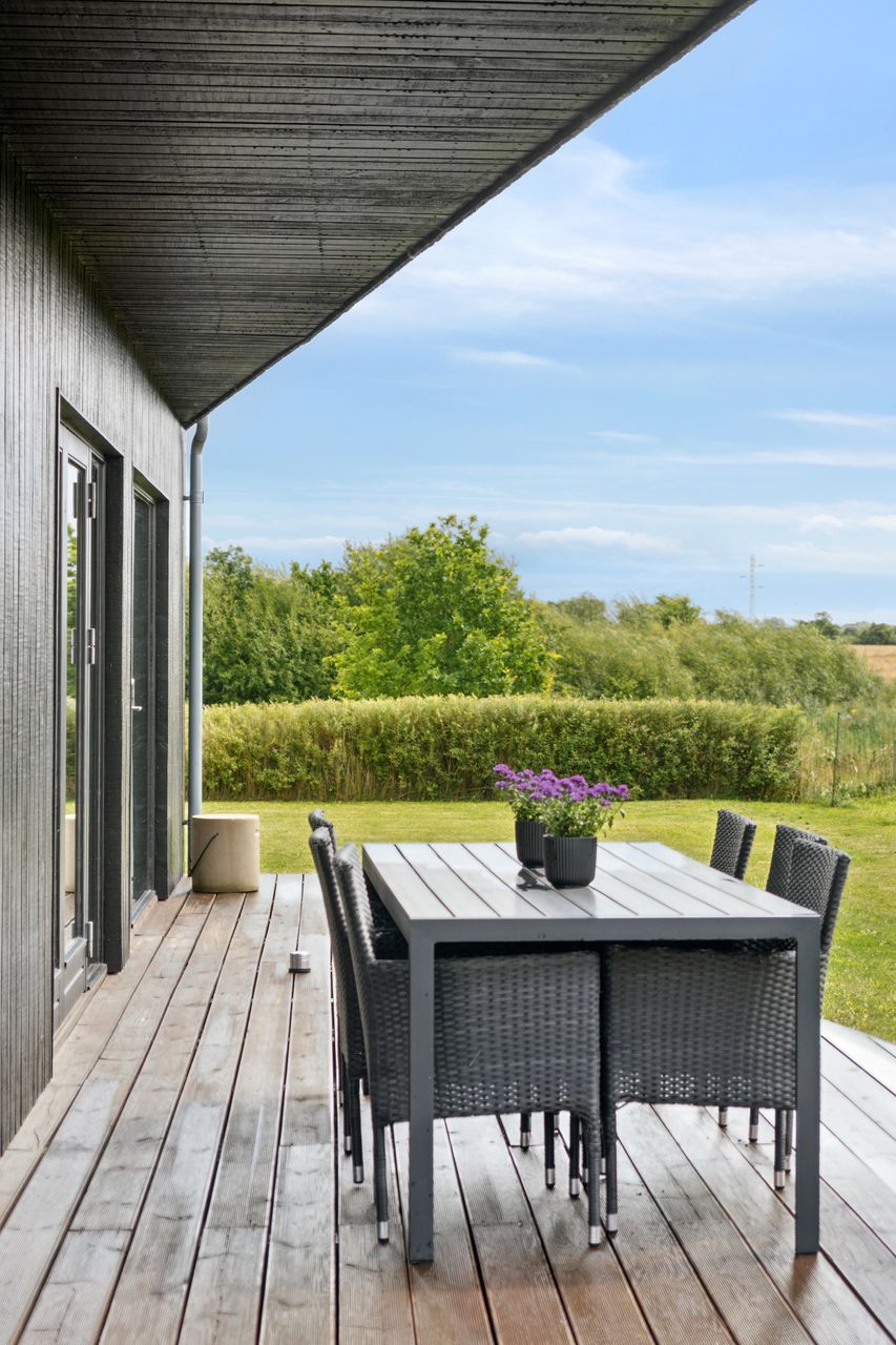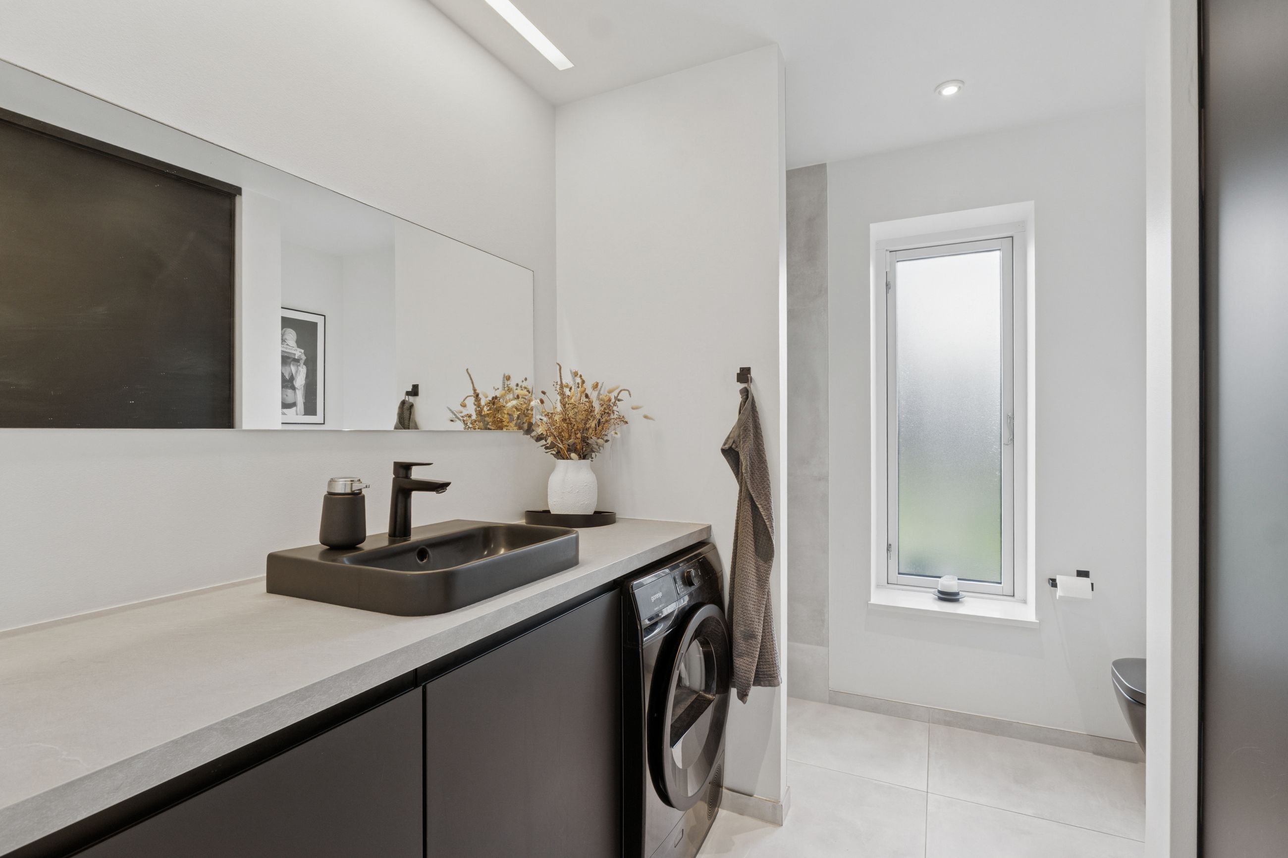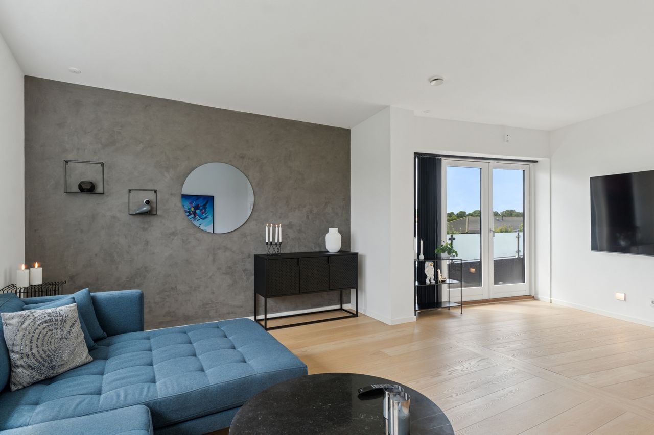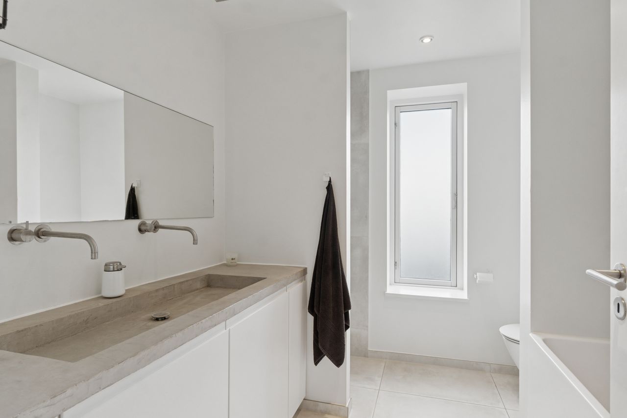Køkkenet er fra Vordingborg Køkkenet og byder på matsorte elementer kombineret med en lys bordplade for et elegant udtryk. Luksuriøse detaljer som Quooker med CUBE-funktion samt vinkøleskab gør madlavningen til en fornøjelse. Stueplan rummer også et stort badeværelse, der er både funktionelt og stilrent.
