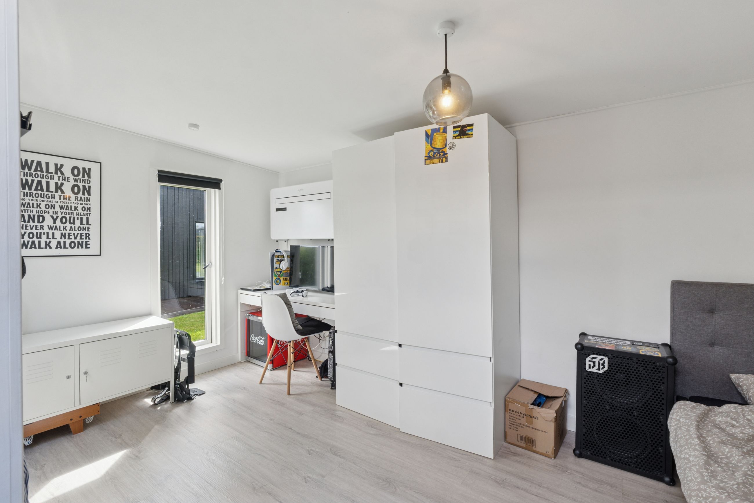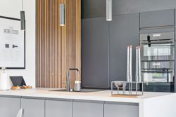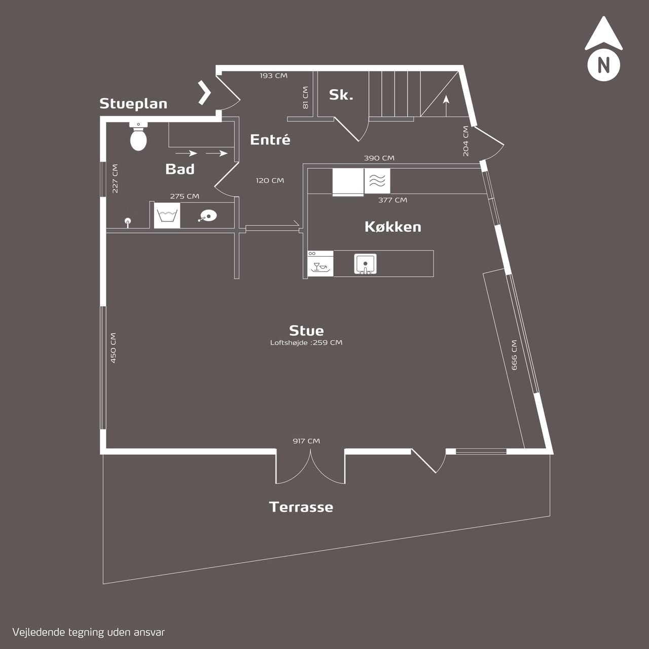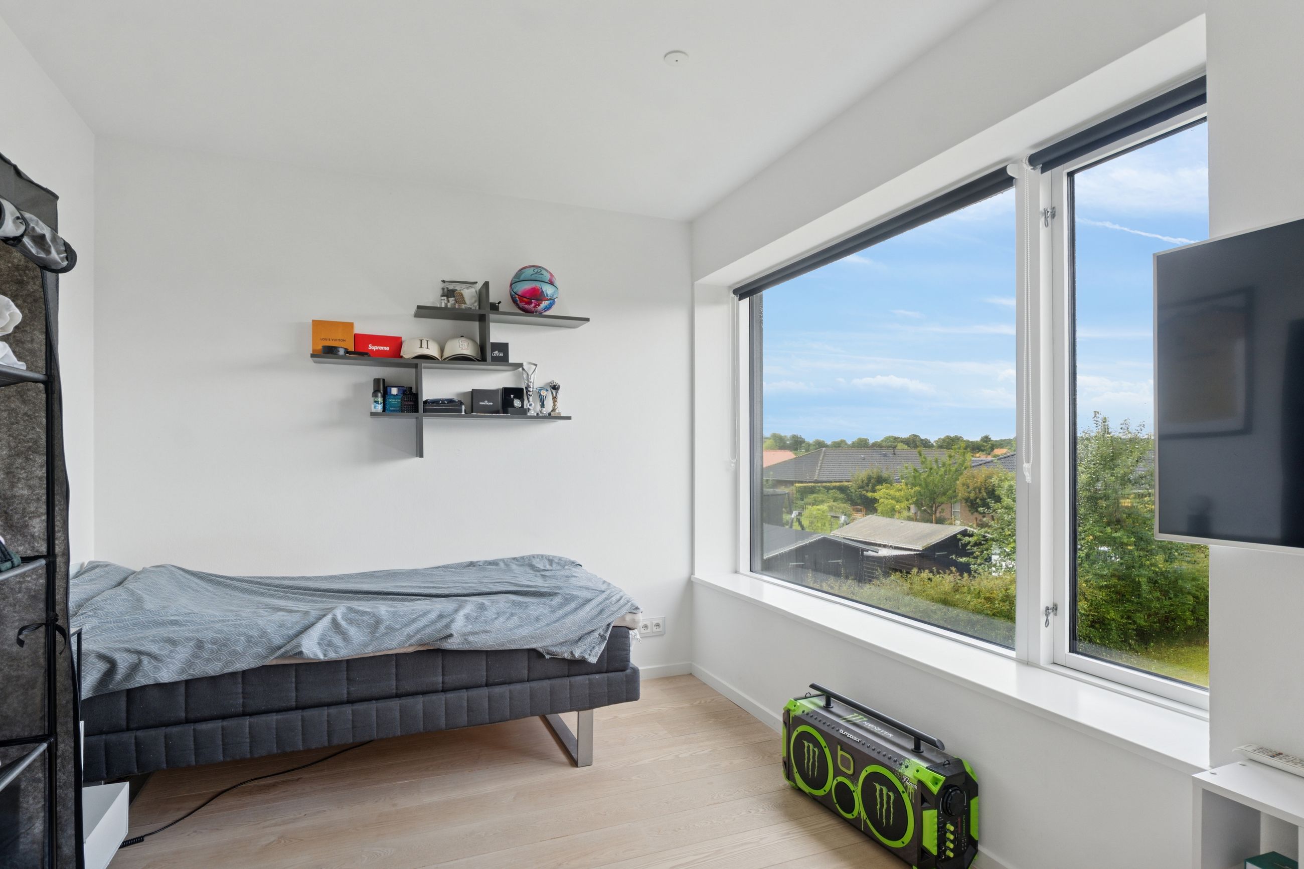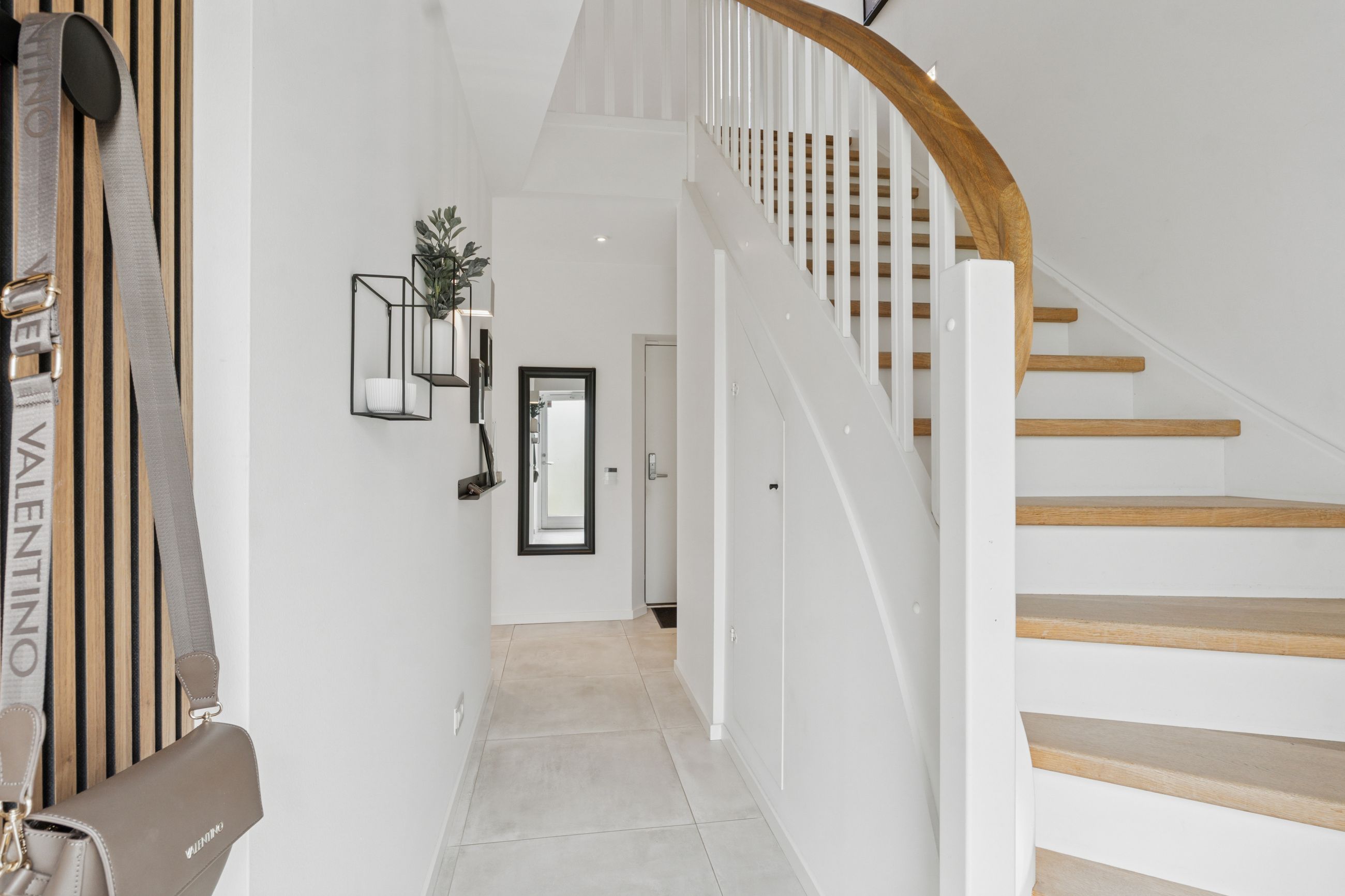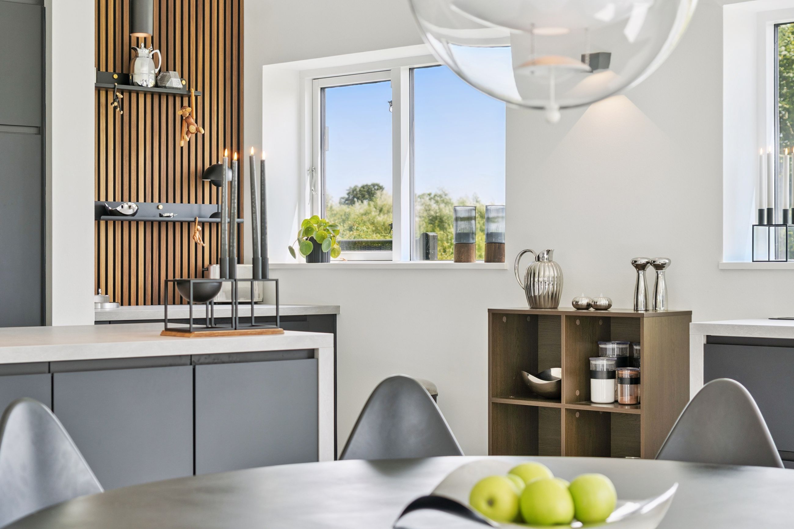 Køkkenet er fra Vordingborg Køkkenet og byder på matsorte elementer kombineret med en lys bordplade for et elegant udtryk. Luksuriøse detaljer som Quooker med CUBE-funktion samt vinkøleskab gør madlavningen til en fornøjelse. Stueplan rummer også et stort badeværelse, der er både funktionelt og stilrent.