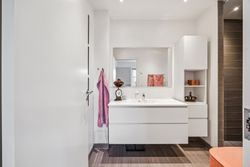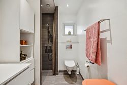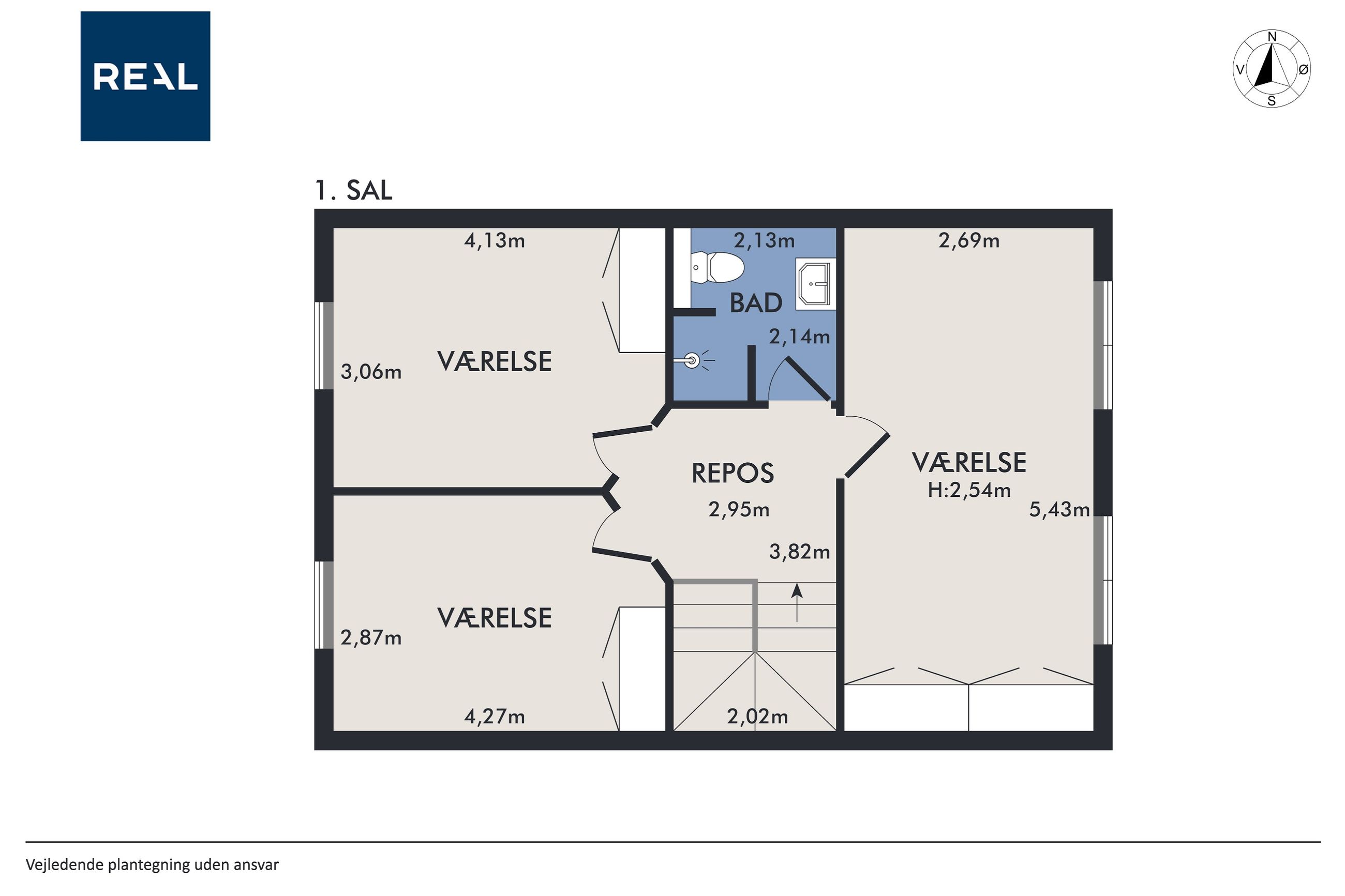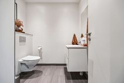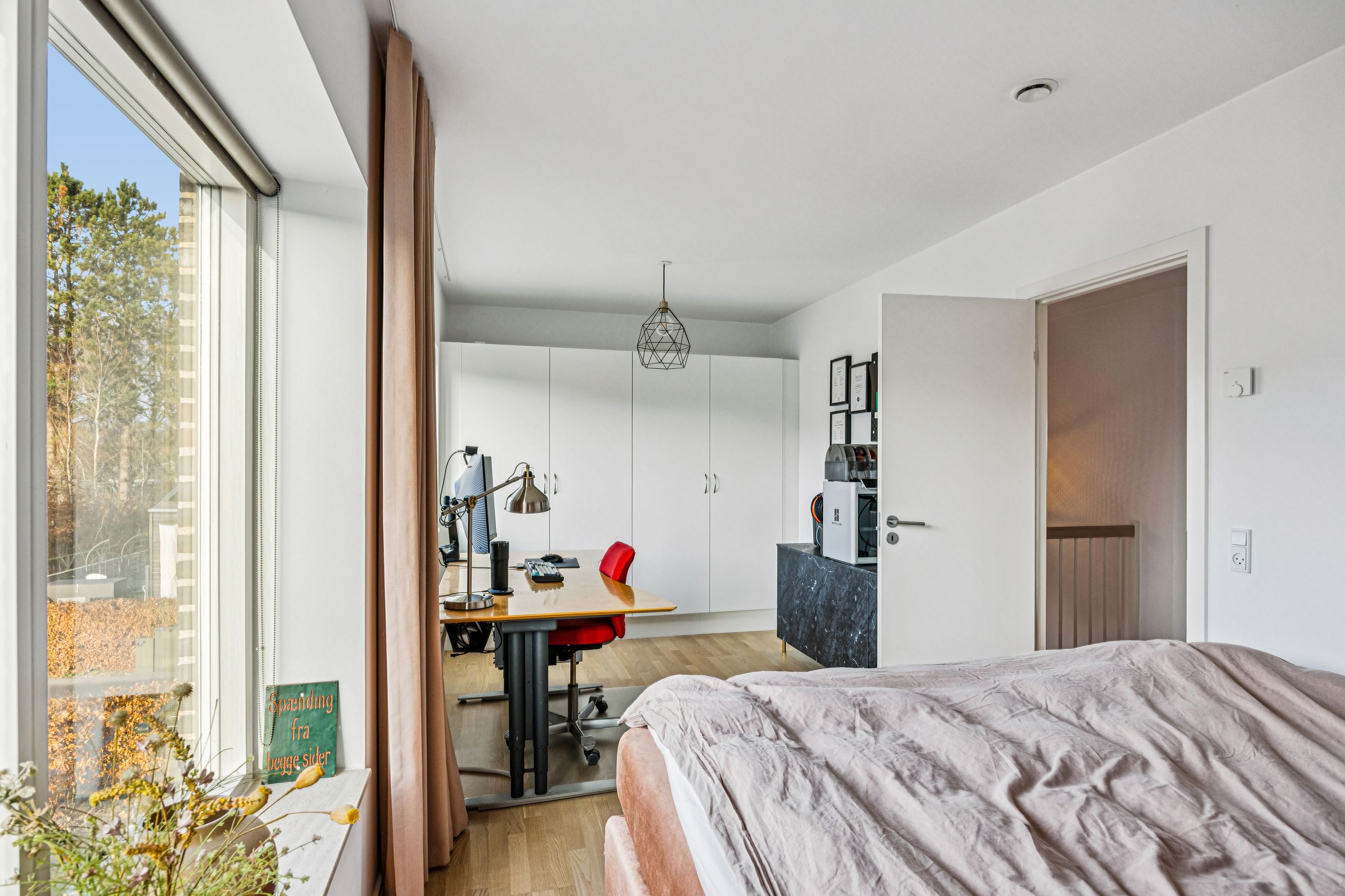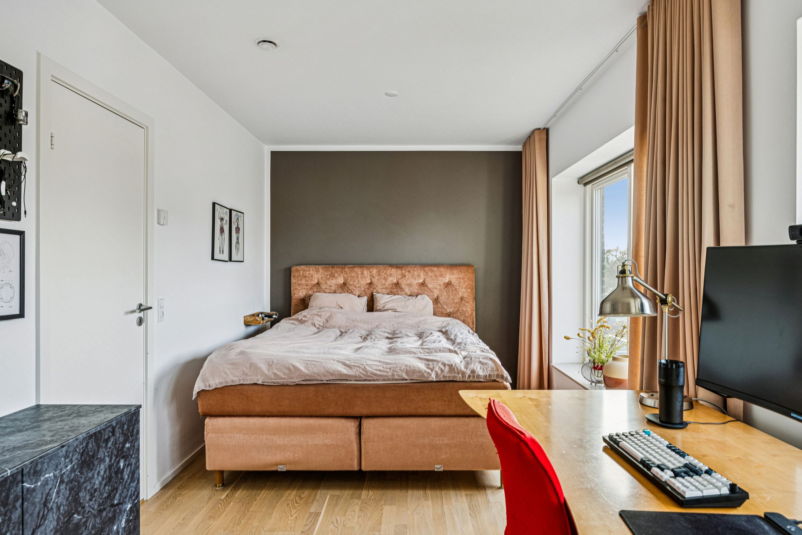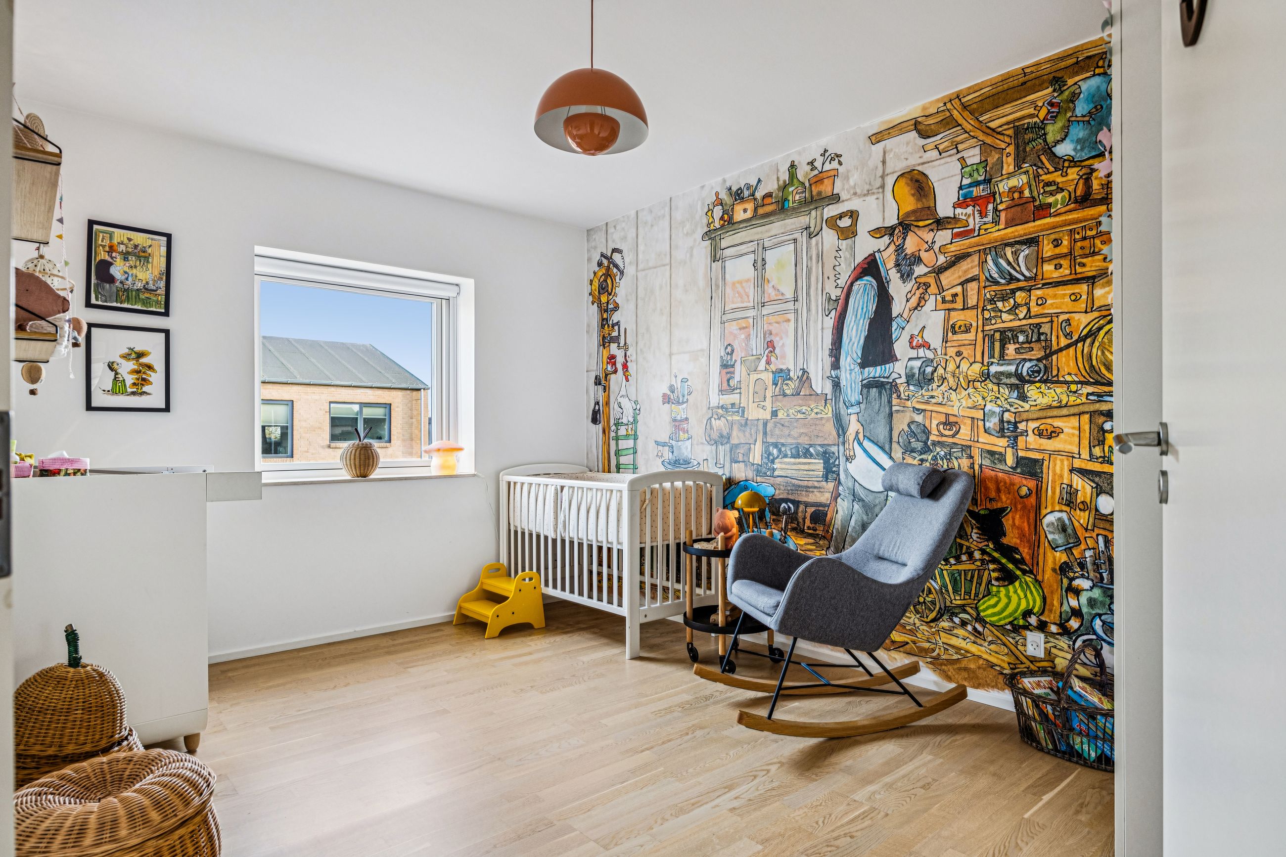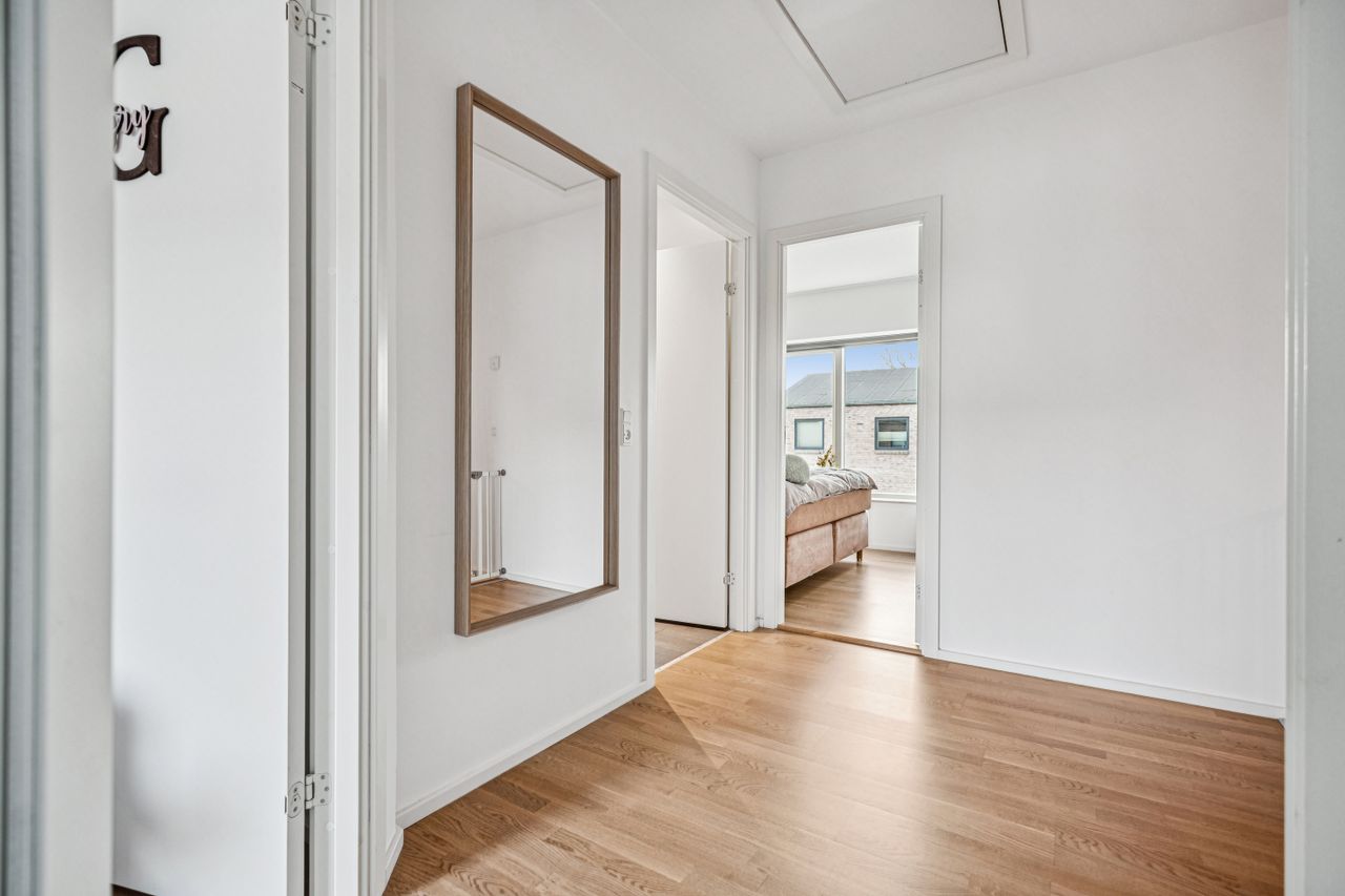 Stueplanet rummer desuden et praktisk bryggers samt et stilfuldt badeværelse. På førstesalen finder du tre rummelige værelser, hvoraf det ene nemt kan opdeles for at skabe et fjerde værelse, hvis behovet skulle opstå. Et stort badeværelse på denne etage fuldender den funktionelle indretning.