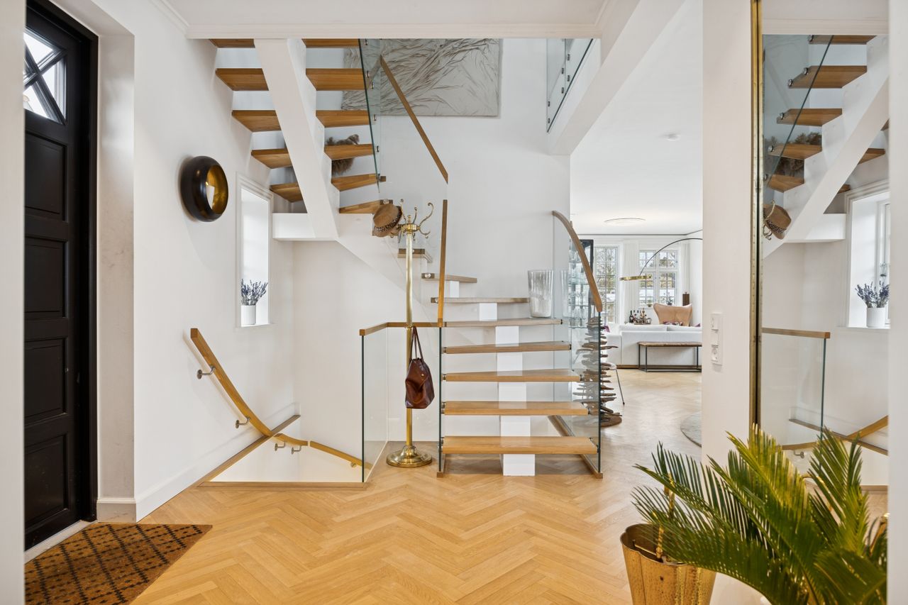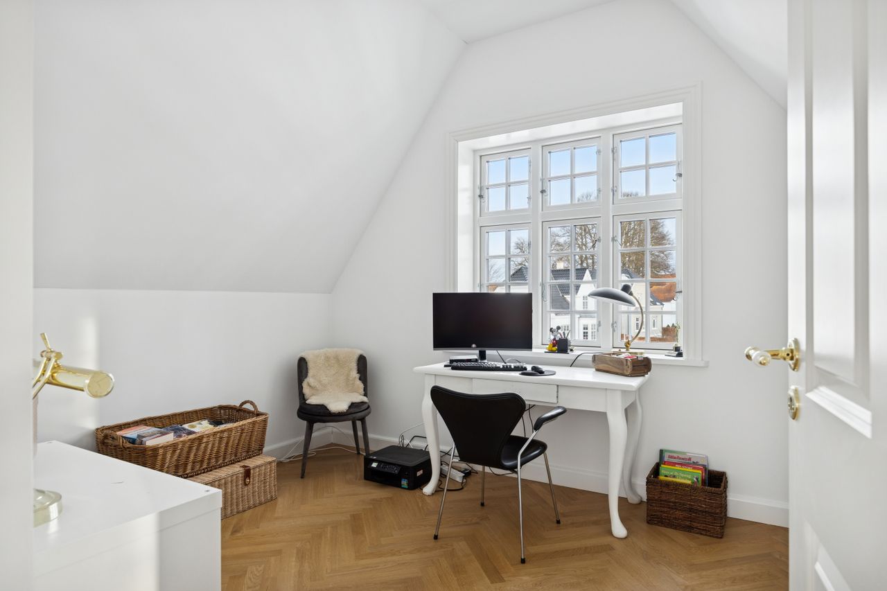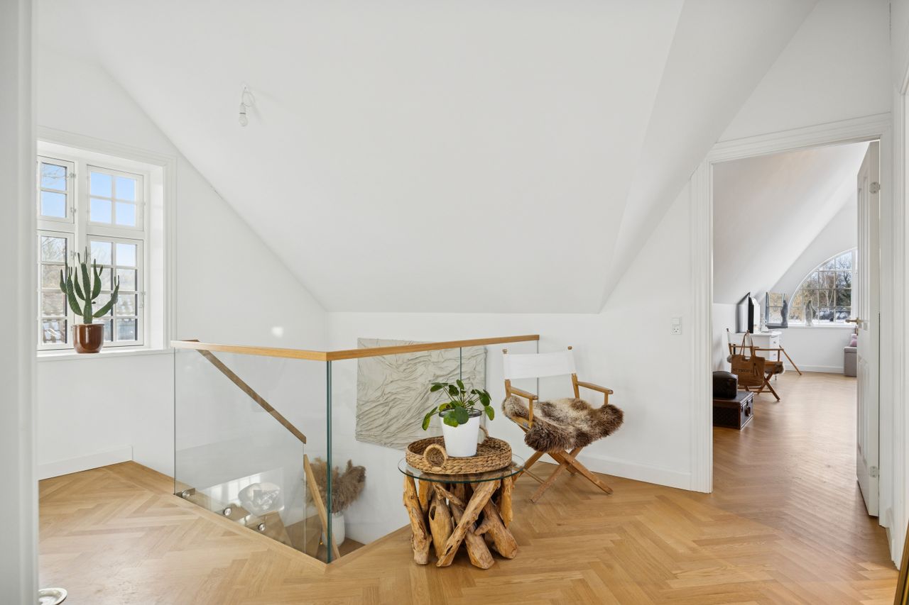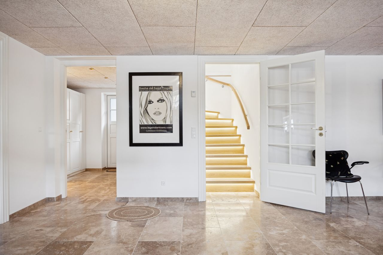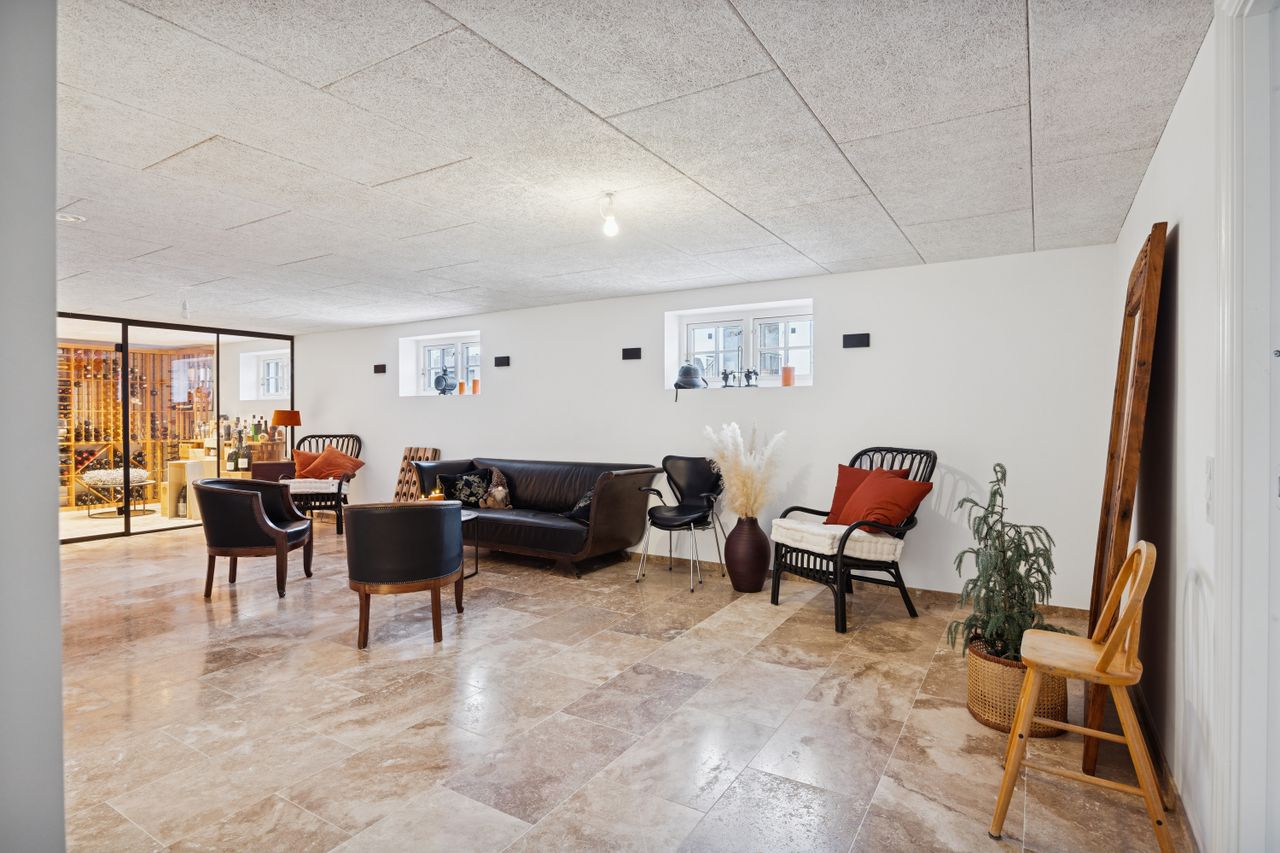 På første sal finder du master bedroom med eget walk-in closet samt to yderligere værelser, der alle har adgang til et stort badeværelse udstyret med kvalitetsmaterialer. Kælderen tilbyder et stort hobbyrum perfekt til kreative udfoldelser eller hjemmekontor, en vinkælder for vinentusiasten samt yderliger disponibelt rum og badeværelse.