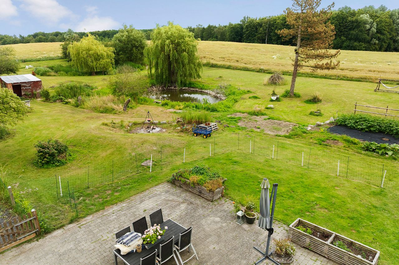 Med et grundareal på hele 7358 kvadratmeter er der rig mulighed for at realisere drømme om mindre dyrehold eller andre udendørsprojekter. Den naturskønne beliggenhed gør det let at glemme hverdagens stress og jag, mens man stadig kun er fem minutters kørsel fra Herfølge. Her finder du både skole, indkøbsmuligheder samt stationen med direkte togforbindelser til København og Køge.