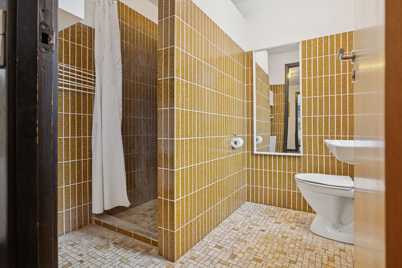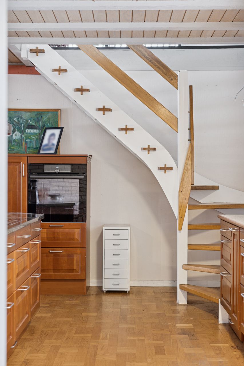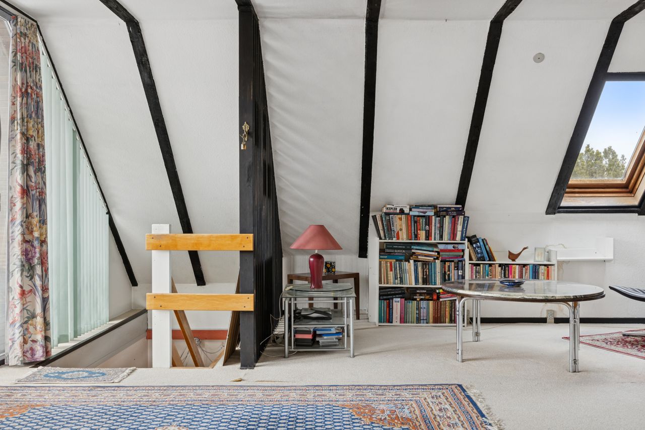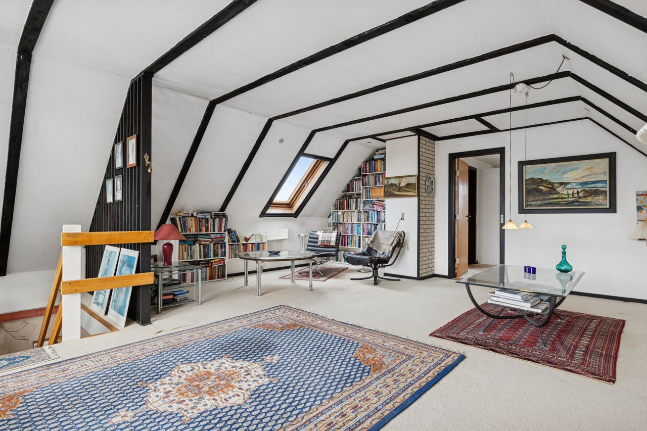Fra alrummet fører en mellemgang dig videre til et stort værelse, som nemt kan opdeles i to mindre rum alt efter behov. Et badeværelse fuldender stueetagen. På første sal finder du endnu en stor stue med potentiale for at skabe flere værelser efter ønske samt adgang til en imponerende altan med åben udsigt over området.