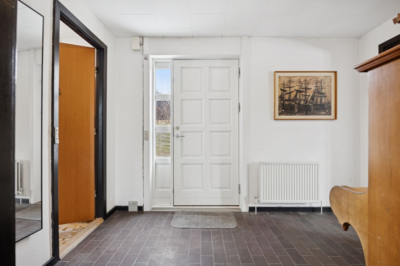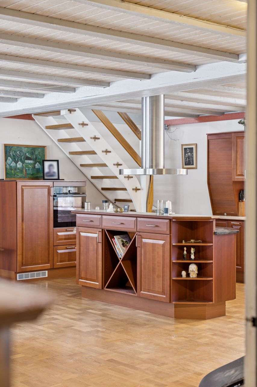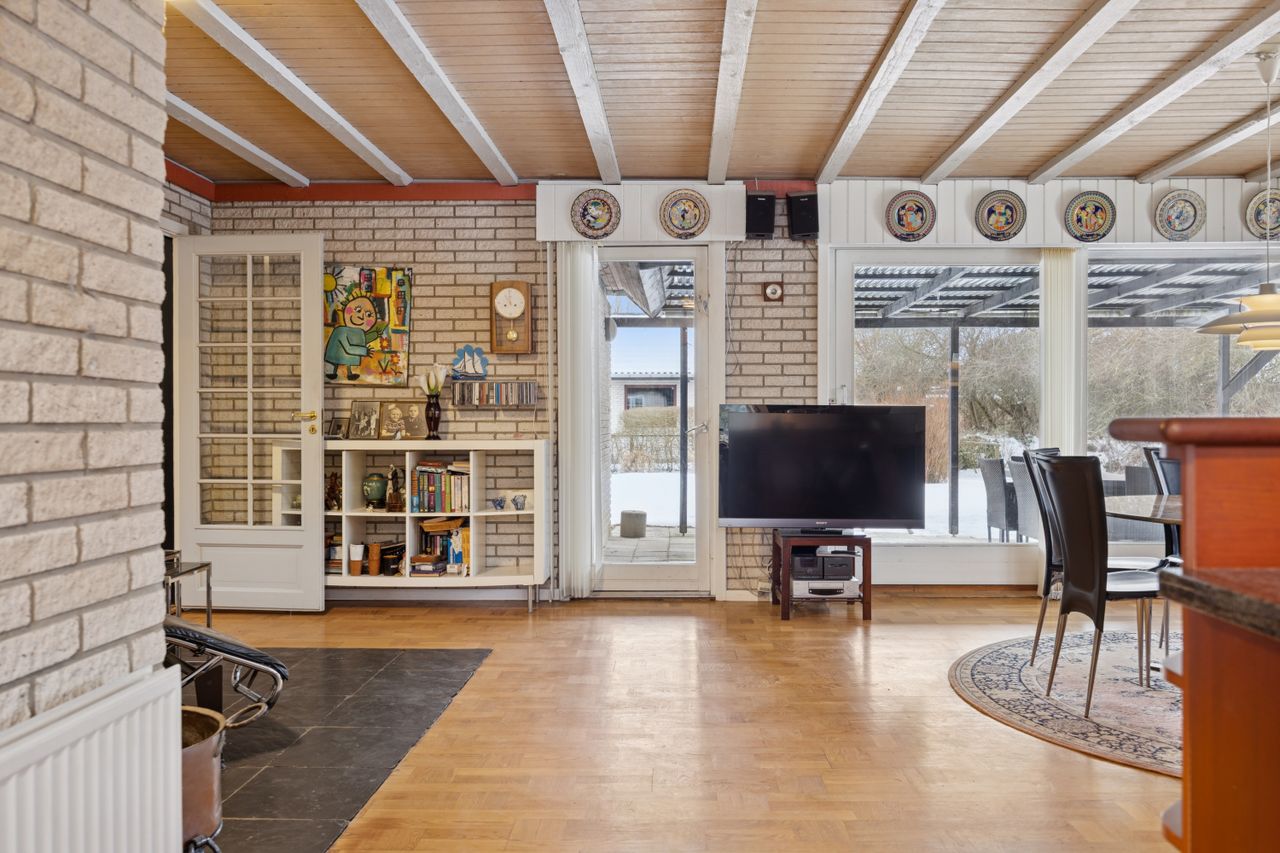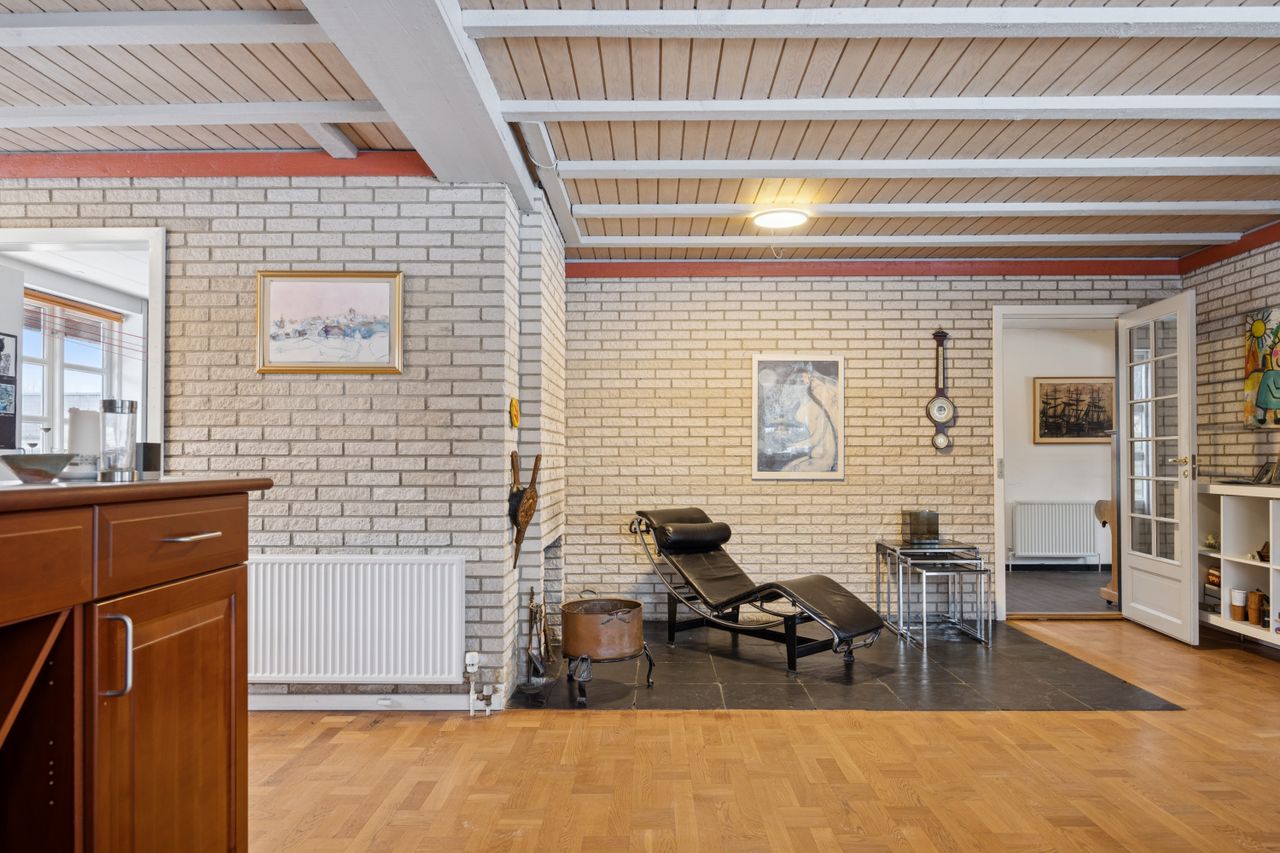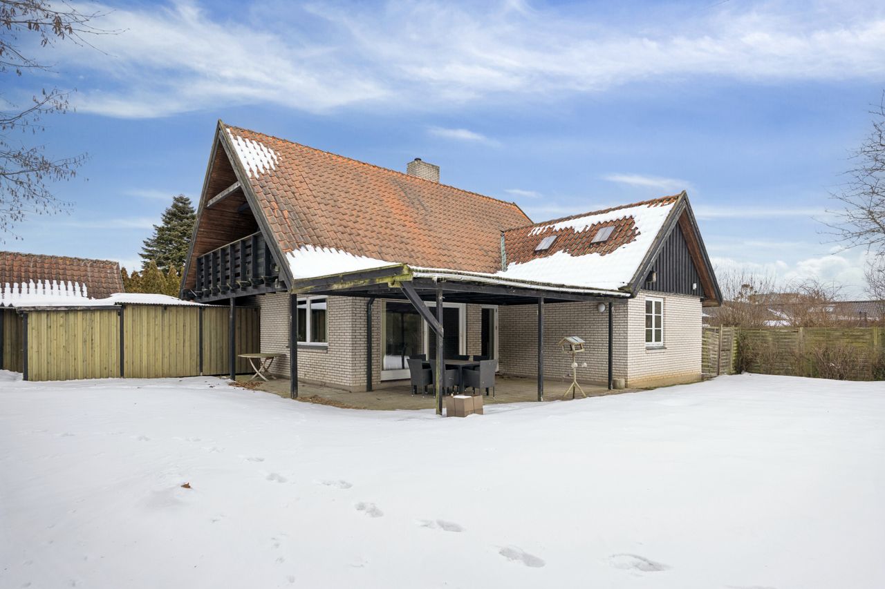 Boligen byder på et rummeligt boligareal på hele 165 kvadratmeter, hvor der er tænkt over hver eneste detalje for at skabe en funktionel og indbydende atmosfære. Du træder ind i et stort bryggers, der gør hverdagen lettere med god plads til opbevaring. Herfra ledes du videre til det åbne køkken-alrum, som uden tvivl vil blive hjemmets samlingspunkt. Det stilfulde køkken er udstyret med en praktisk køkkenø og giver direkte adgang til haven samt den overdækkede terrasse – perfekt til hyggelige stunder uanset vejret.