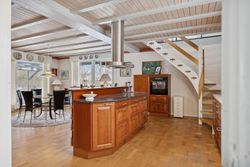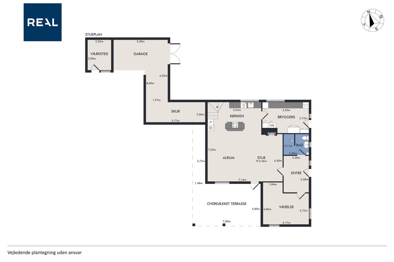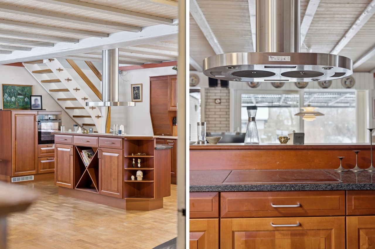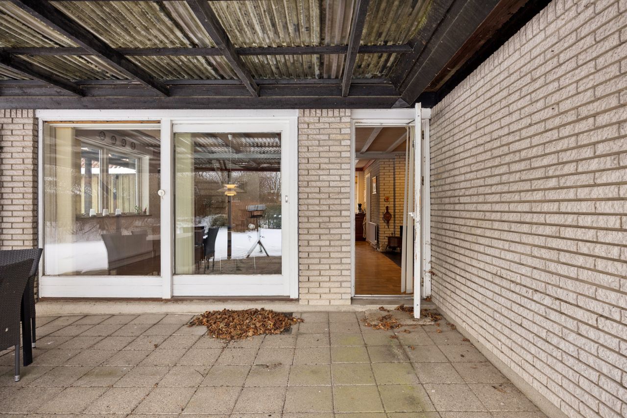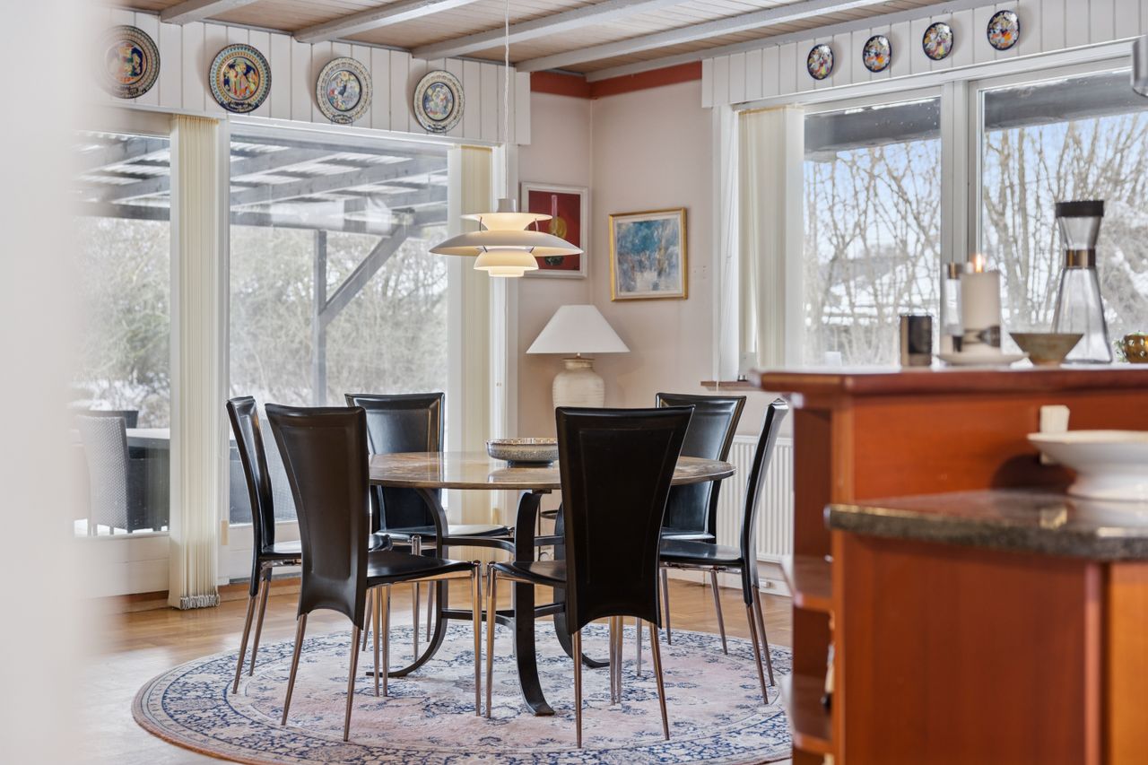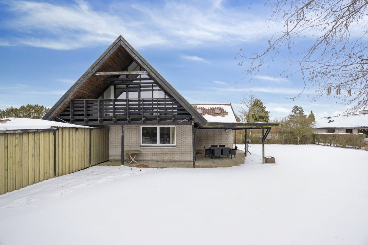 Boligen byder på et rummeligt boligareal på hele 165 kvadratmeter, hvor der er tænkt over hver eneste detalje for at skabe en funktionel og indbydende atmosfære. Du træder ind i et stort bryggers, der gør hverdagen lettere med god plads til opbevaring. Herfra ledes du videre til det åbne køkken-alrum, som uden tvivl vil blive hjemmets samlingspunkt. Det stilfulde køkken er udstyret med en praktisk køkkenø og giver direkte adgang til haven samt den overdækkede terrasse – perfekt til hyggelige stunder uanset vejret.