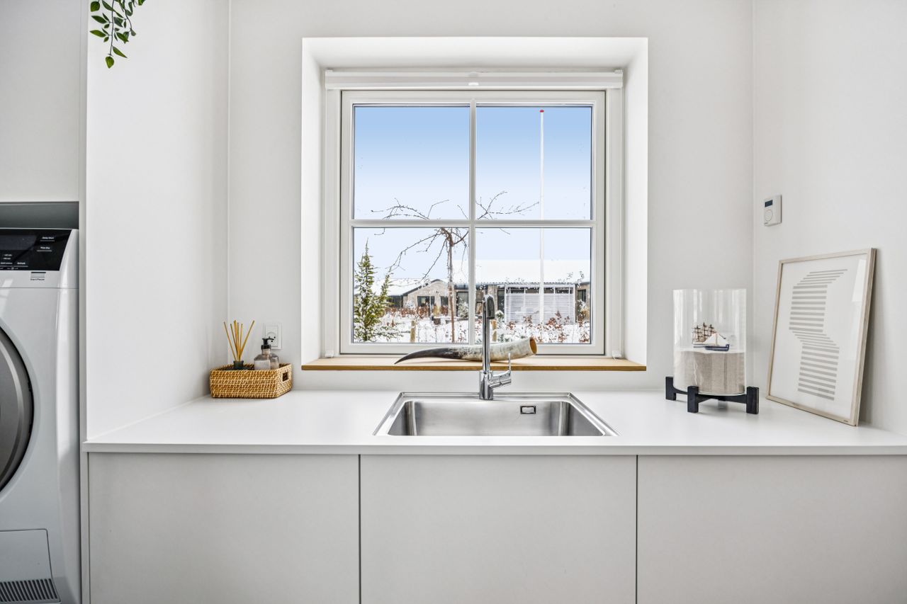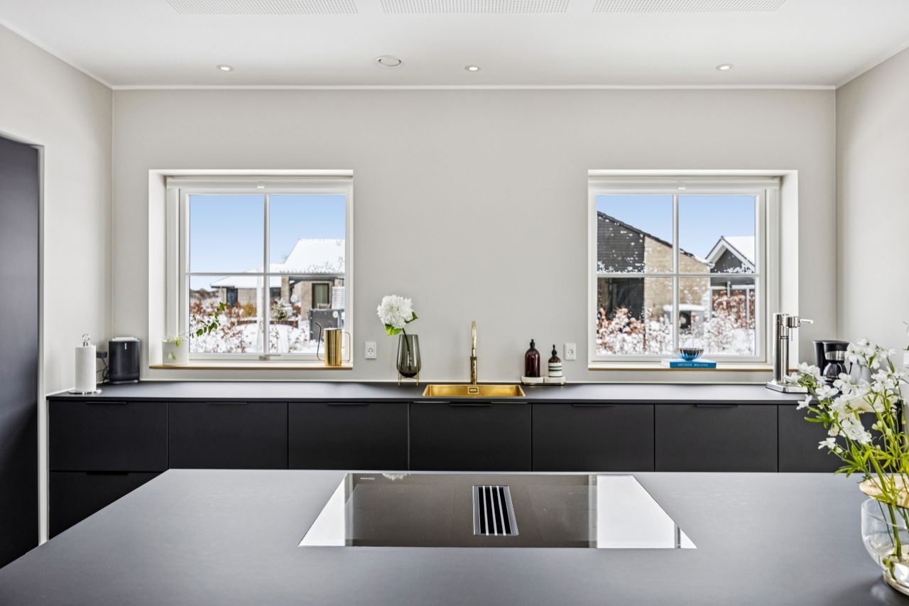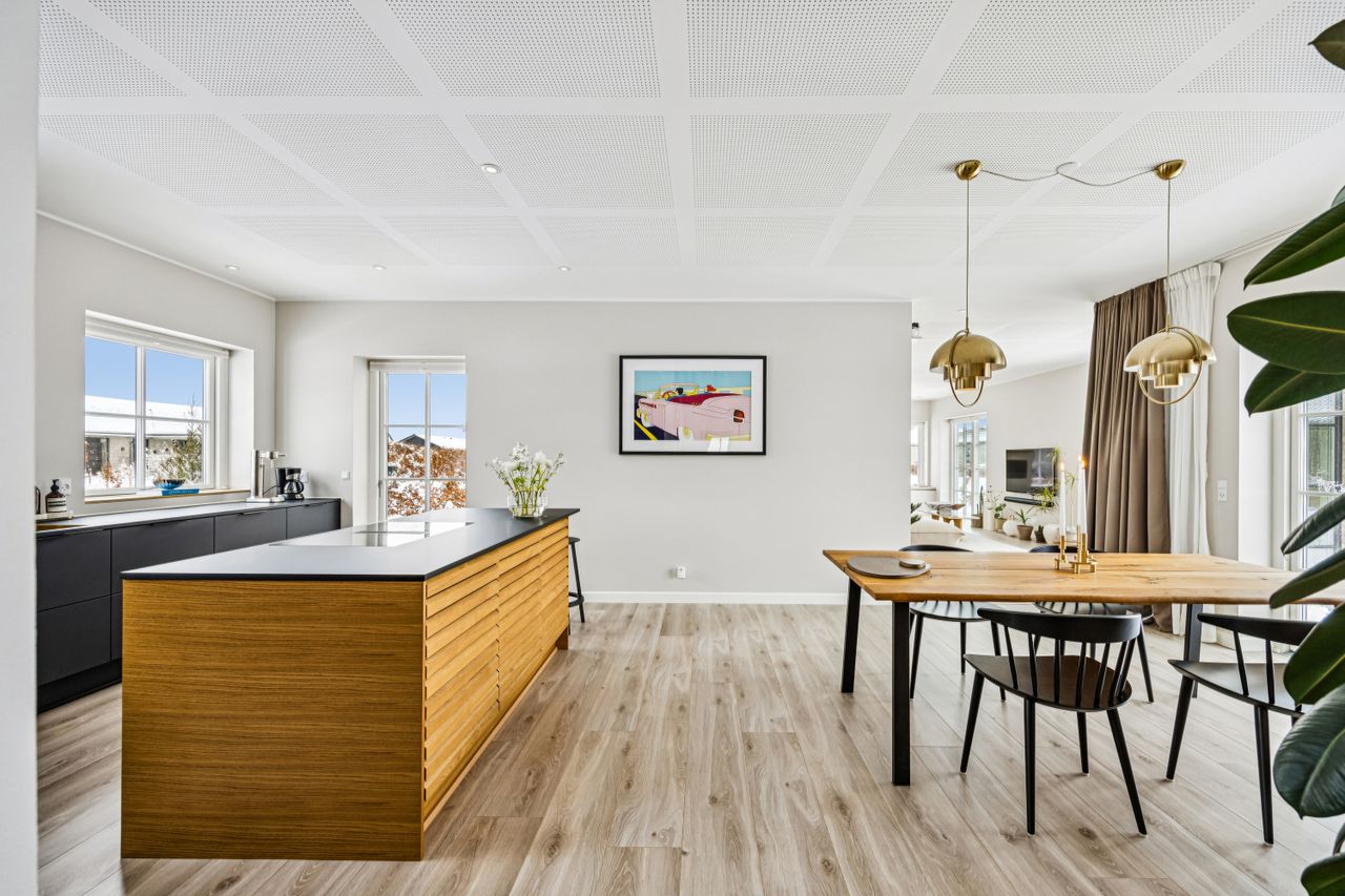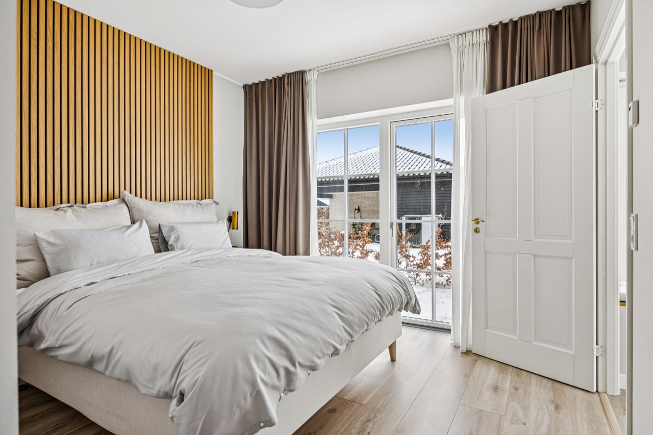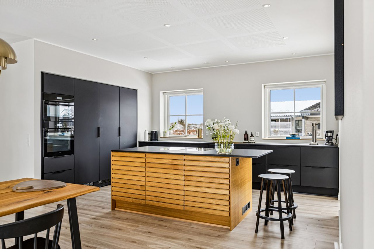 Indretningen er gennemtænkt med separate børne- og forældreafdelinger, hvilket giver optimal privatliv for alle familiemedlemmer. Der er to luksuriøse badeværelser, hvor det ene inkluderer et lækkert badekar. Køkkenet fra HTH imponerer med Miele kogeplader og emfang, hvilket gør madlavning til en sand fornøjelse.