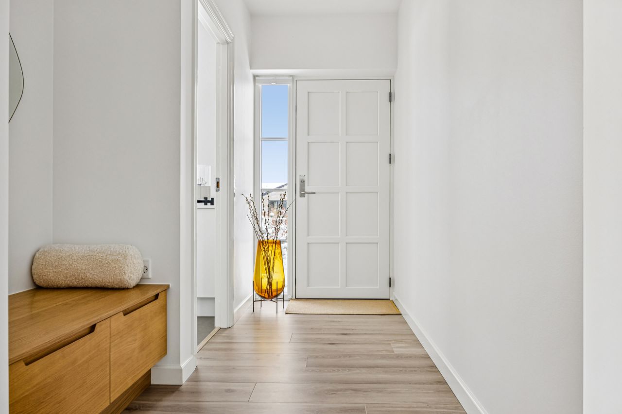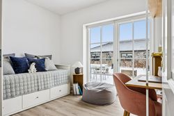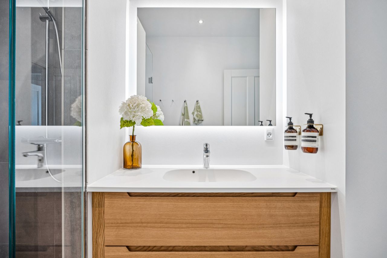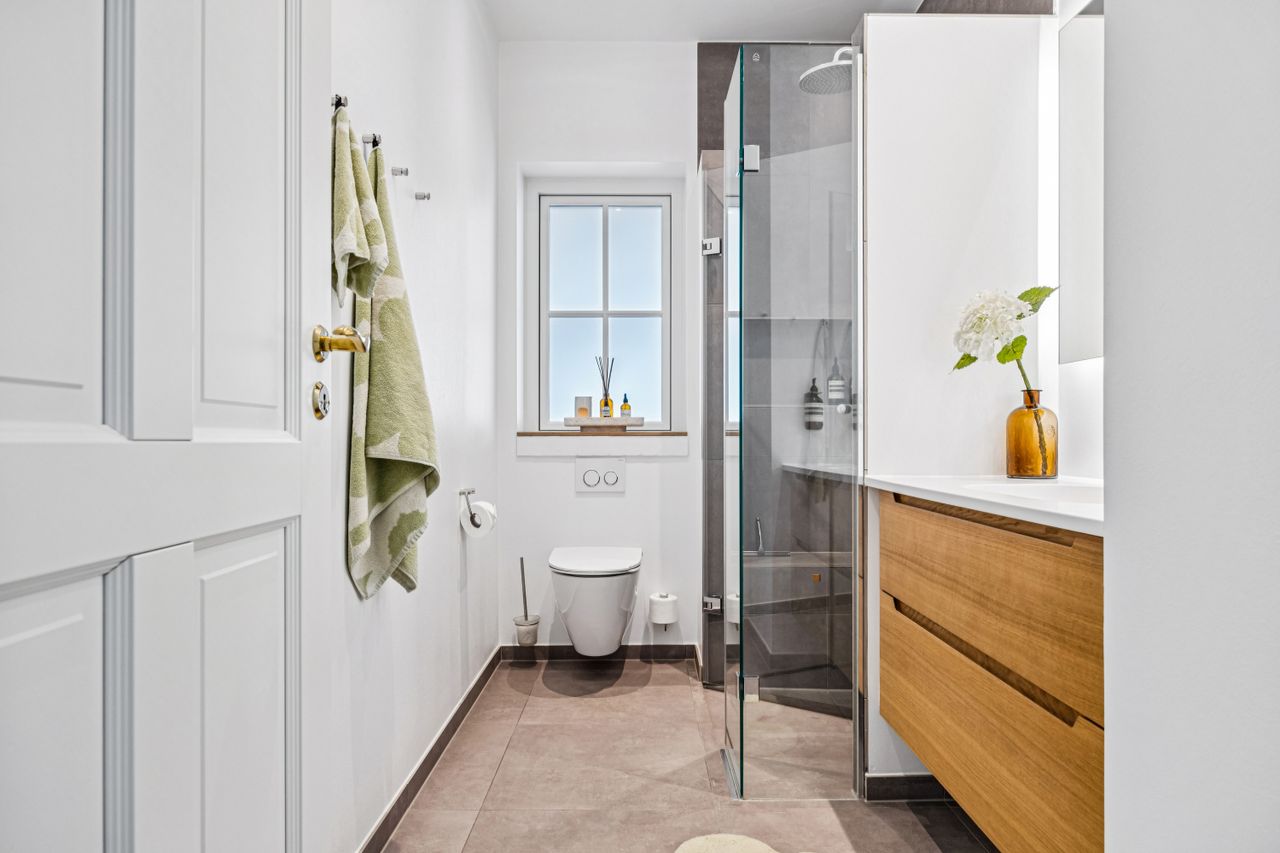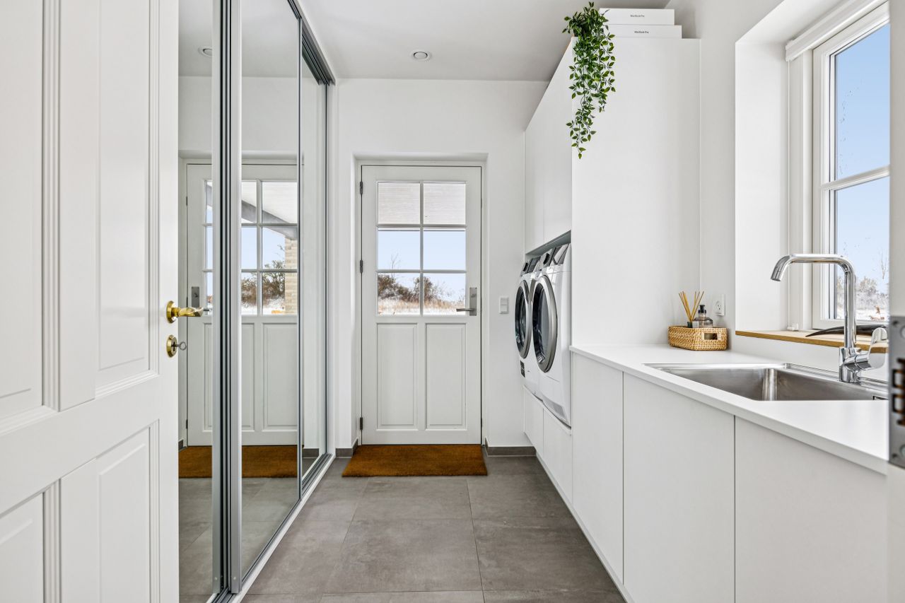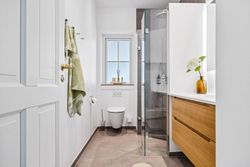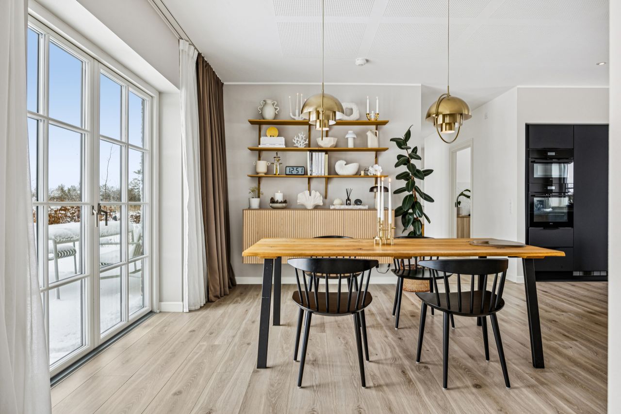 Indretningen er gennemtænkt med separate børne- og forældreafdelinger, hvilket giver optimal privatliv for alle familiemedlemmer. Der er to luksuriøse badeværelser, hvor det ene inkluderer et lækkert badekar. Køkkenet fra HTH imponerer med Miele kogeplader og emfang, hvilket gør madlavning til en sand fornøjelse.