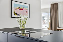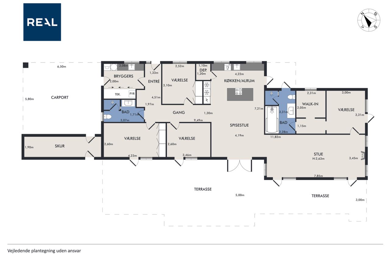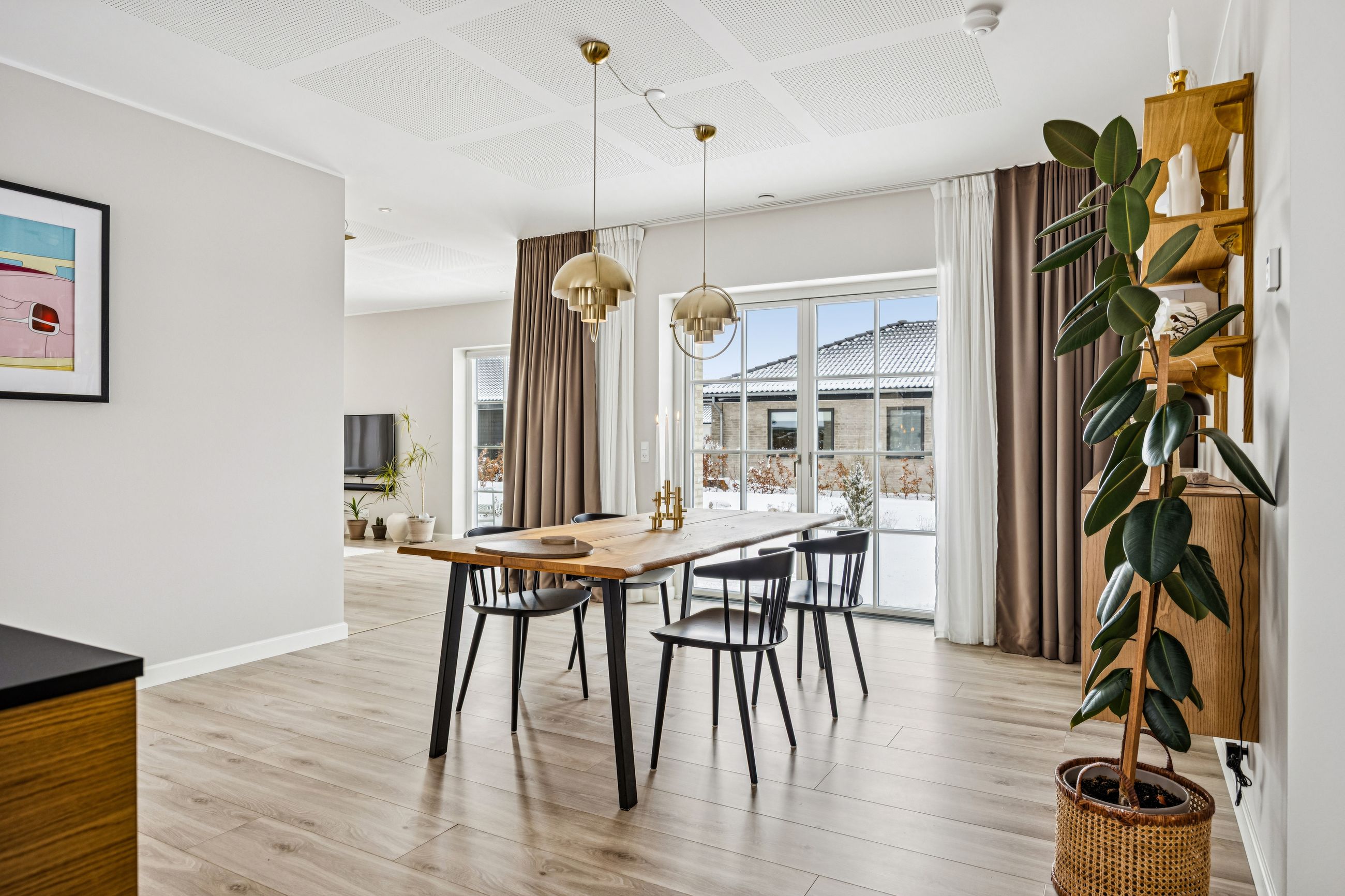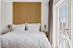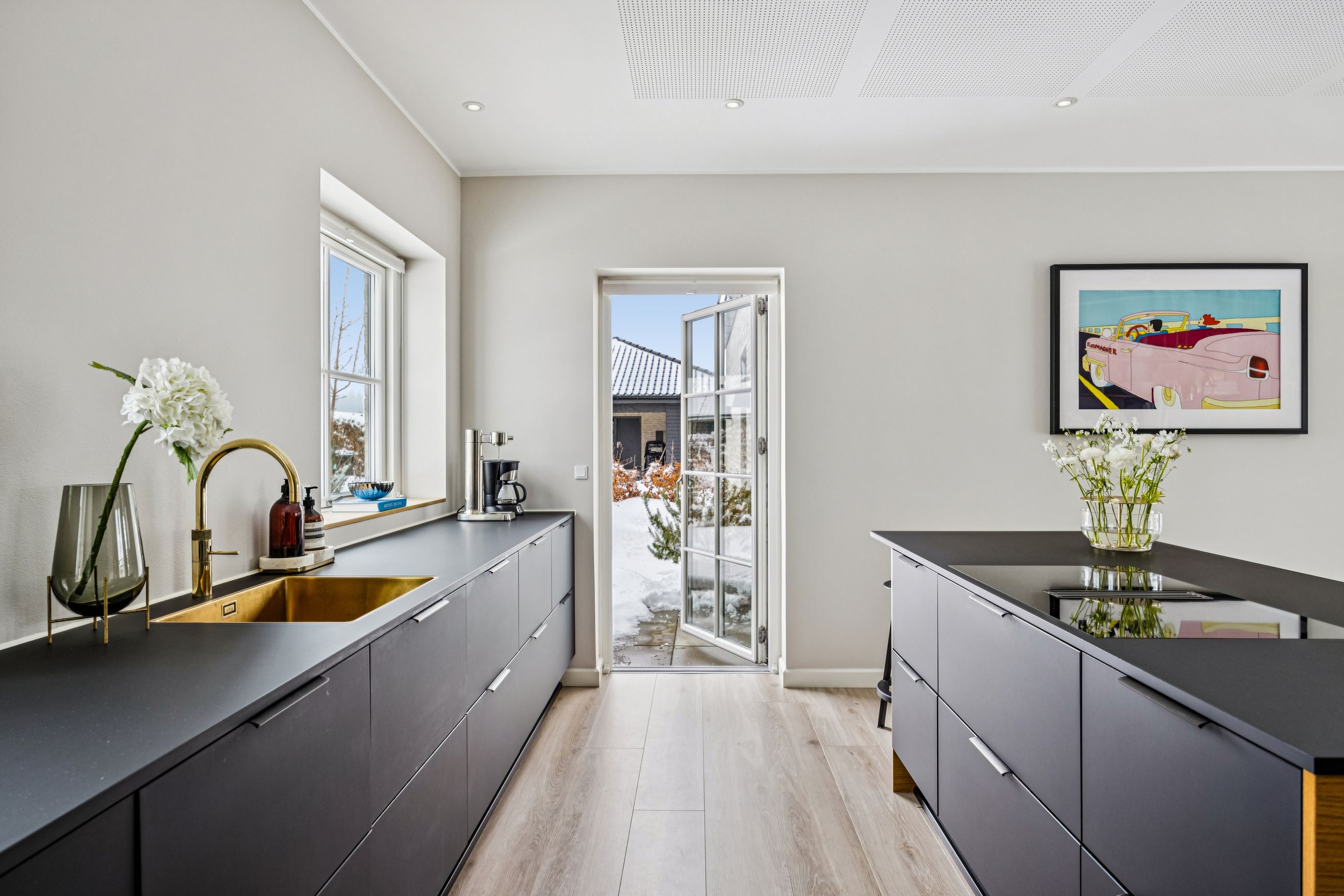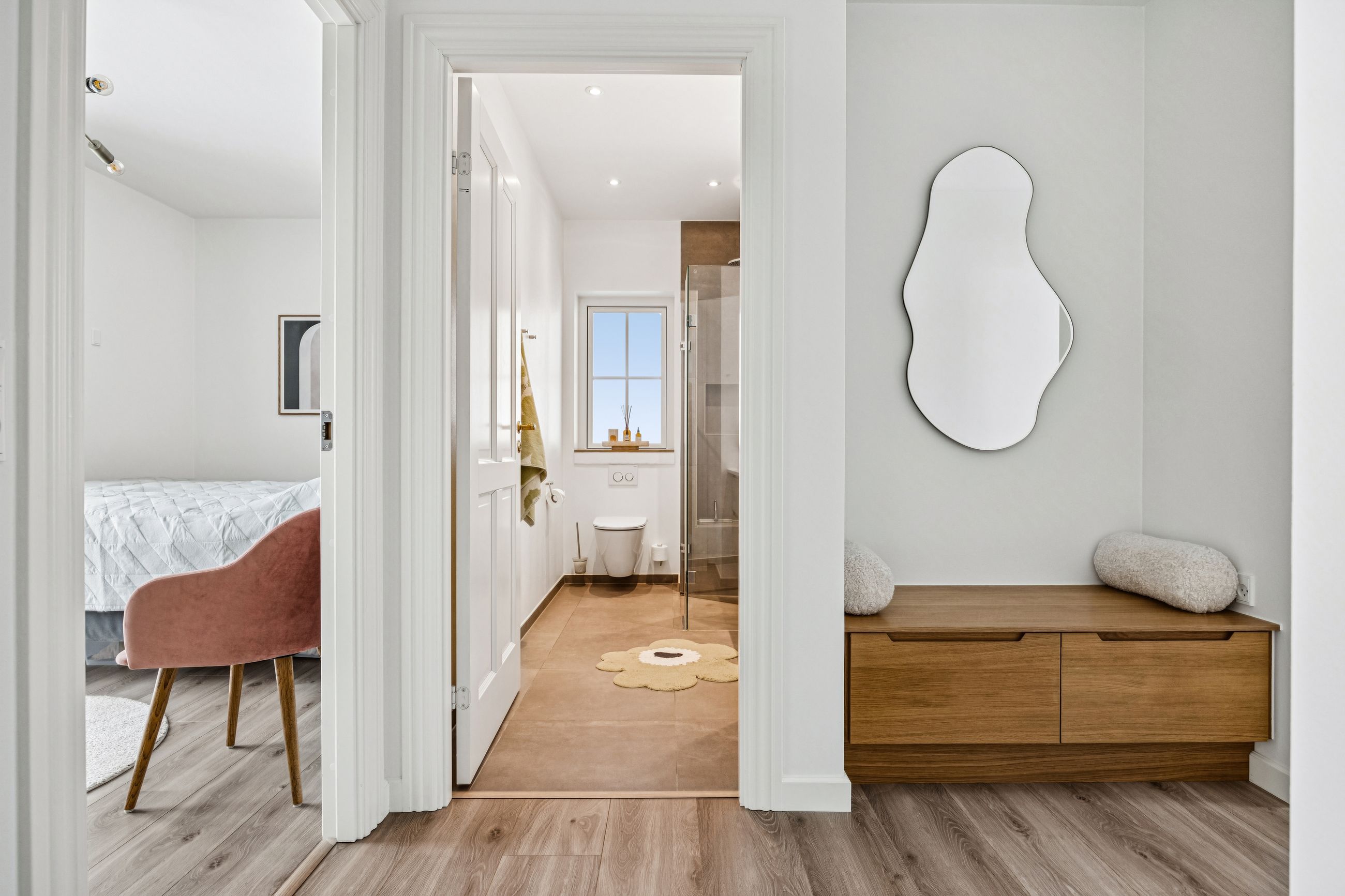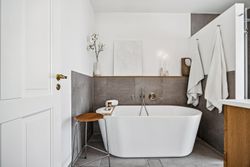 Indretningen er gennemtænkt med separate børne- og forældreafdelinger, hvilket giver optimal privatliv for alle familiemedlemmer. Der er to luksuriøse badeværelser, hvor det ene inkluderer et lækkert badekar. Køkkenet fra HTH imponerer med Miele kogeplader og emfang, hvilket gør madlavning til en sand fornøjelse.