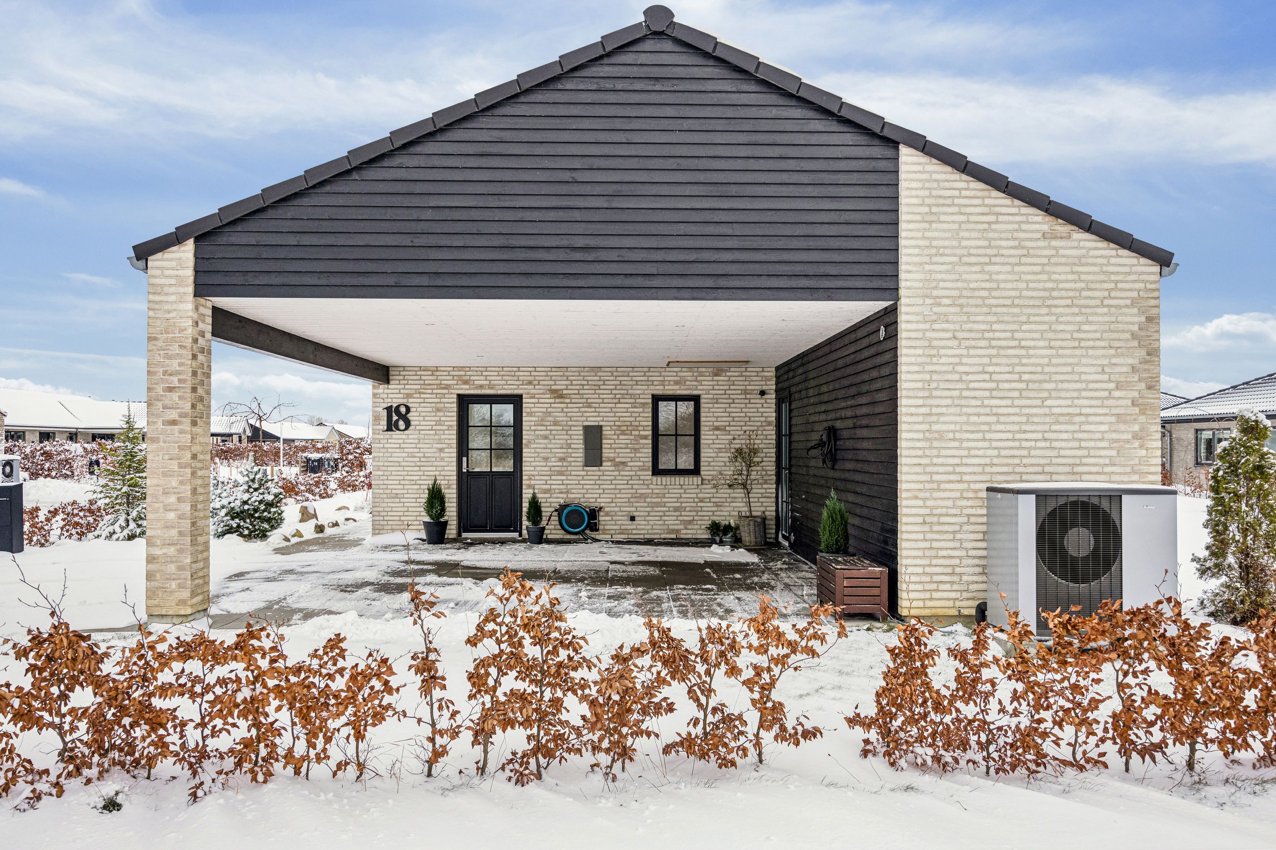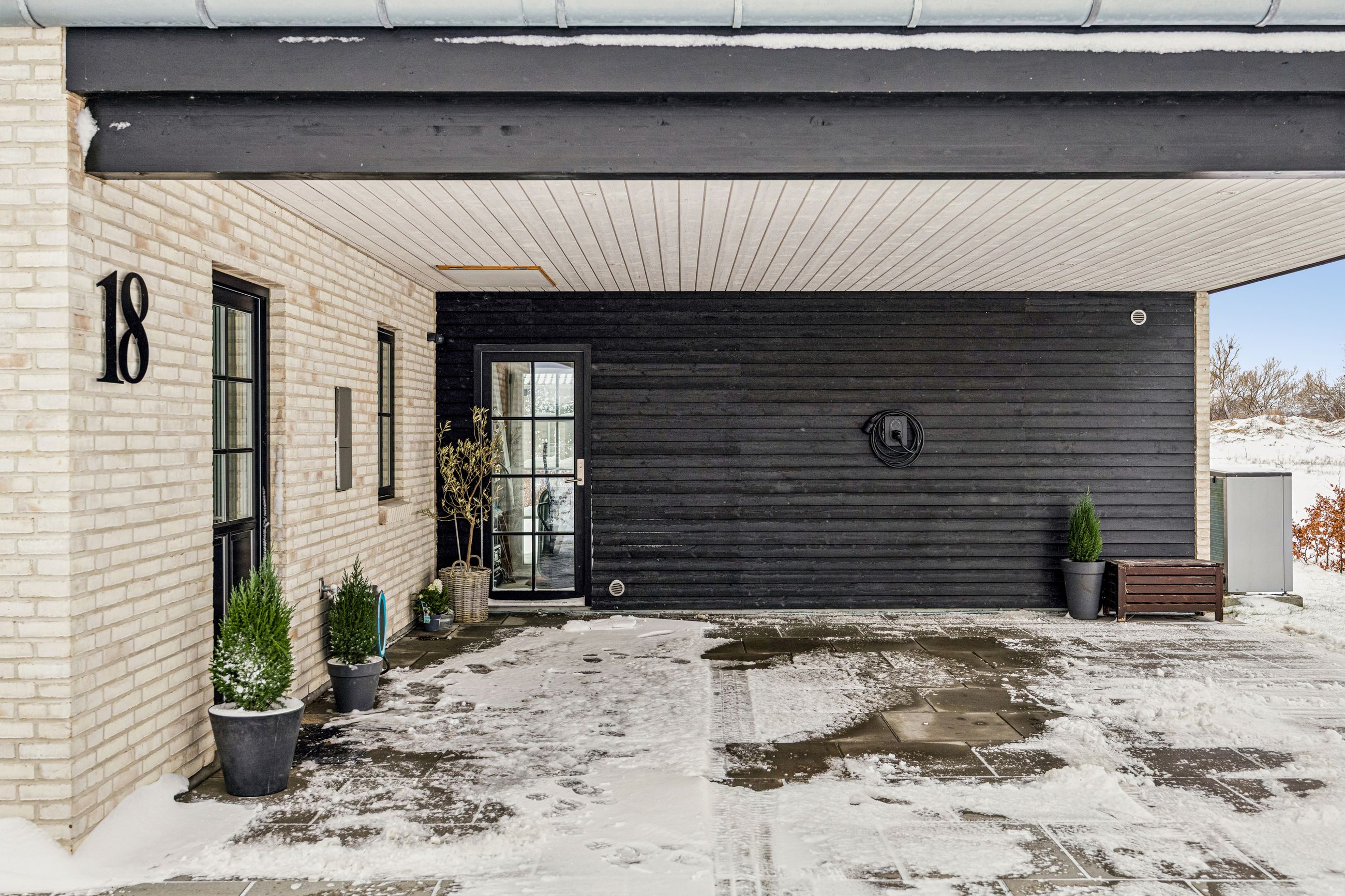 Udendørs finder du en overdækket carport med plads til to biler samt et isoleret skur til opbevaring. Den smukke træterrasse i bangkirai-hårdttræ inviterer til afslapning under åben himmel.