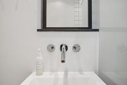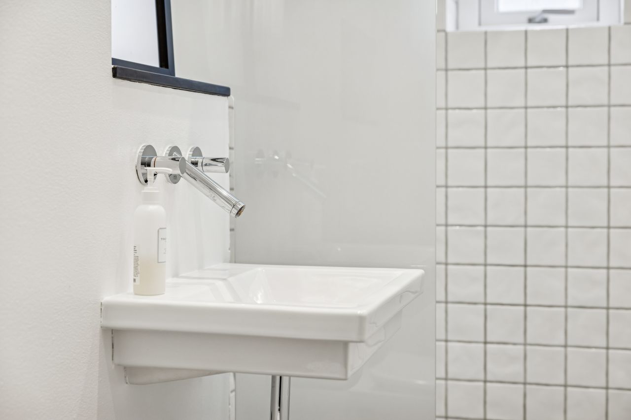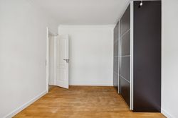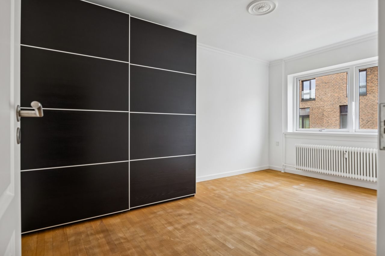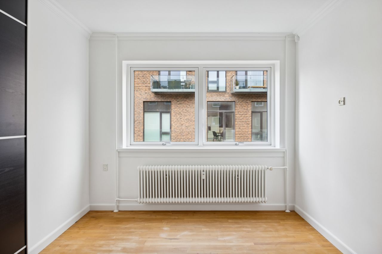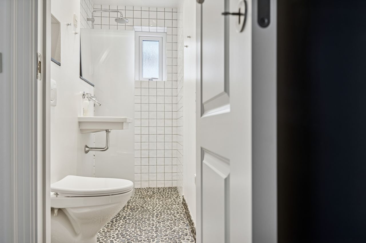 Soveværelset er lyst og indbydende med plads til både seng og garderobeopbevaring. Badeværelset er moderne indrettet med gulvvarme, hvilket sikrer komfort året rundt. Til lejligheden hører også et kælderrum, som giver ekstra opbevaringsplads.