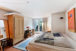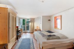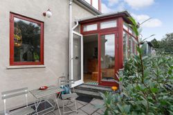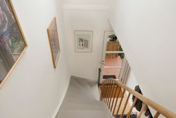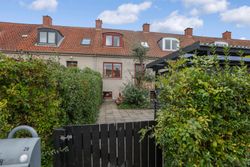 Rækkehuset ligger behageligt tilbagetrukket fra den i forvejen stille og lukkede vej, og ud over fin plads til parkering er det rummelige cykelskur en velkommen tilføjelse på forsiden af boligen. Vandskuret facade, orangerødt tegltag og kviste er dertil ydre karakteristika, som hele den ensartede række nyder godt af.