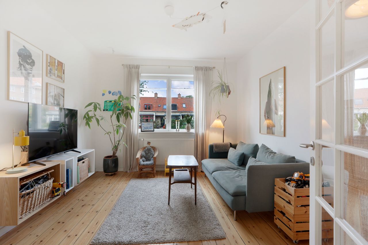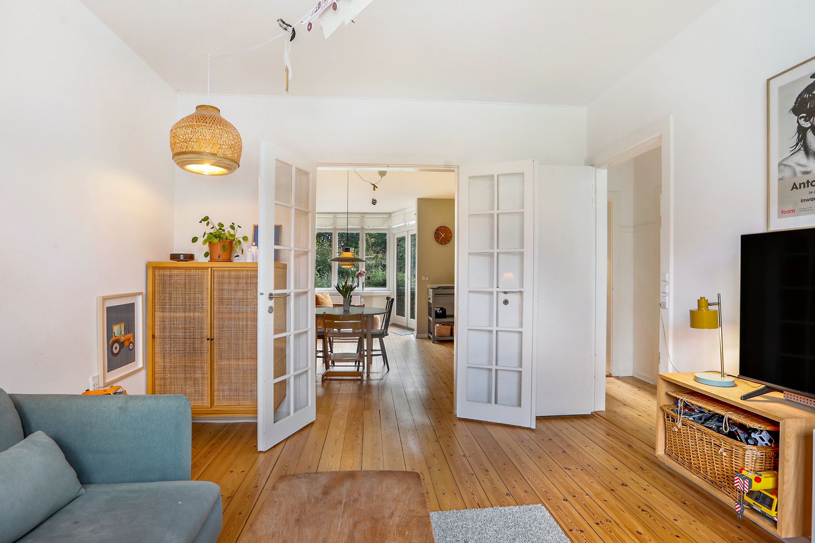 De 95 boligkvadratmeter suppleres af 57 m2 i den anvendelige kælder. Alle etager er opdateret i en lys og tidssvarende stil, der samtidig formår at understøtte den charme, som en bolig fra 1947 har svært ved at løbe fra. I vil især bemærke det skønne lysindfald, som sørger for, at både opholdsrum og værelser fremstår særdeles indbydende. Opholdsrummene består af 2 stuer en stuie - der idag fungerer som dagligstue og spisestue. Via den fine vindueskarnap i spisestuen~ har I direkte adgang til den hævede træterrasse i den lukkede baghave, og udsigten til Utterslev Mose hører med.