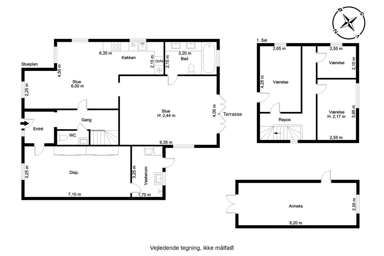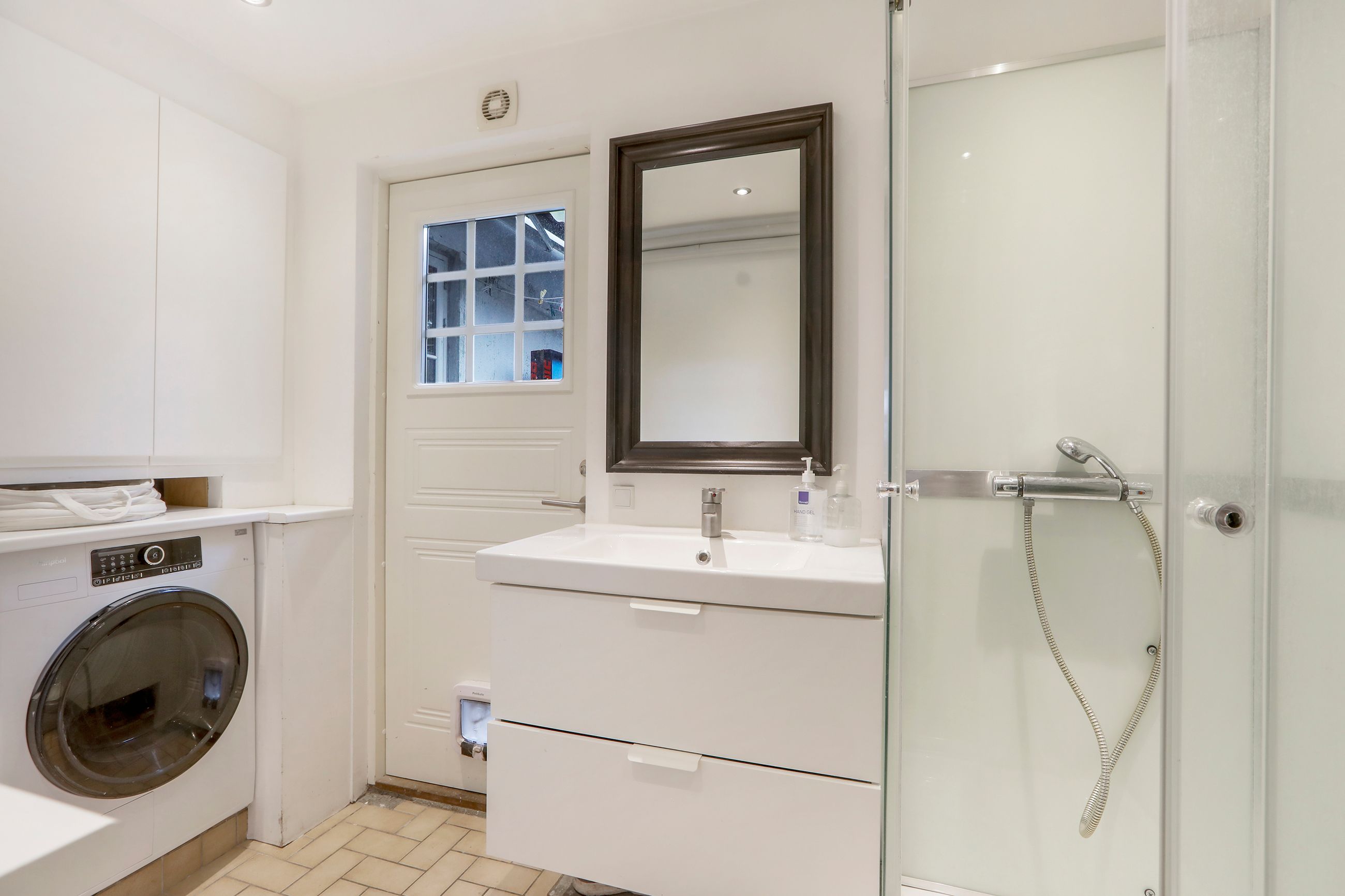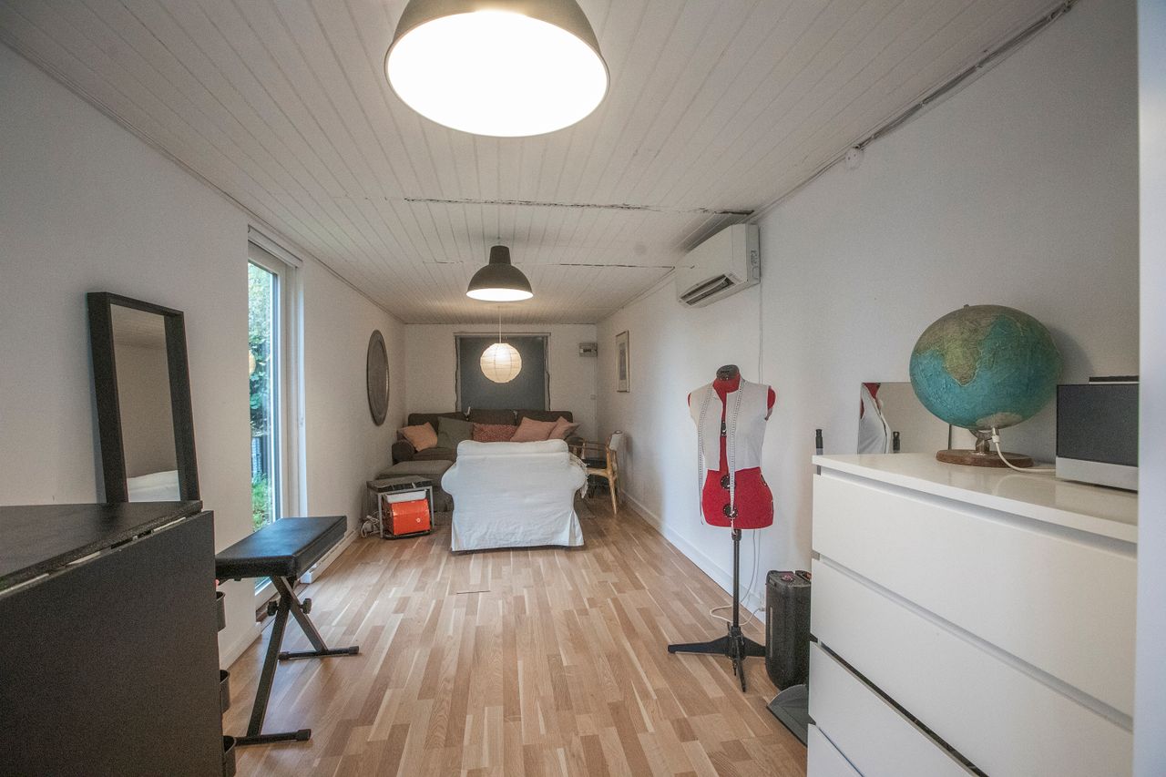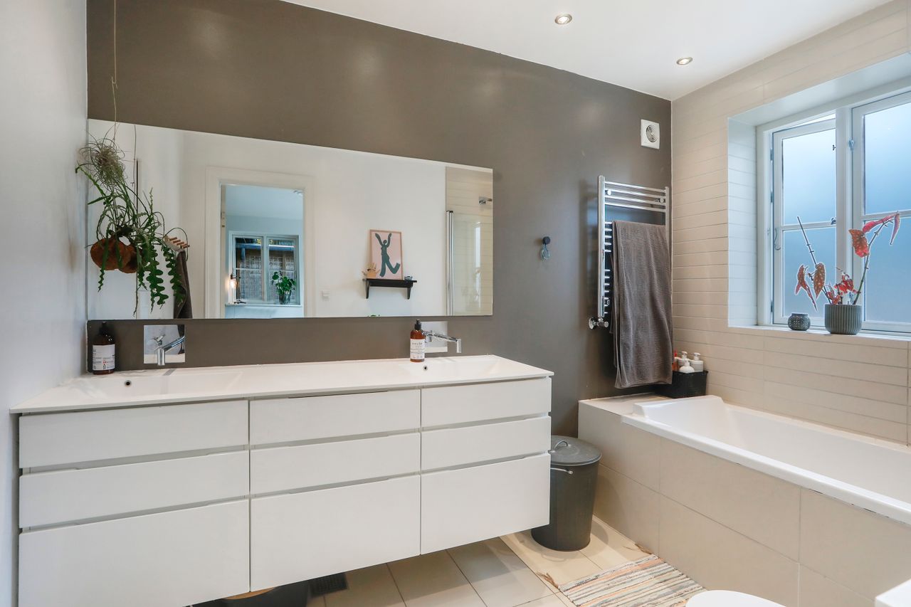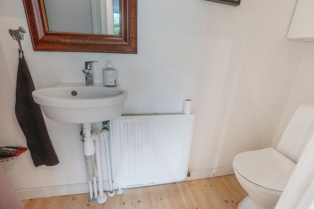 Stueplan rummer også 2 badeværelser samt toilet, hvilket gør det nemt for både gæster og beboere at benytte faciliteterne uden besvær. Derudover er der adgang til et stort disponibelt rum samt et praktisk vaskerum, hvor det andet lidt ældre badeværelse finder sted, og som sikrer, at alle hverdagens gøremål klares let og effektivt.