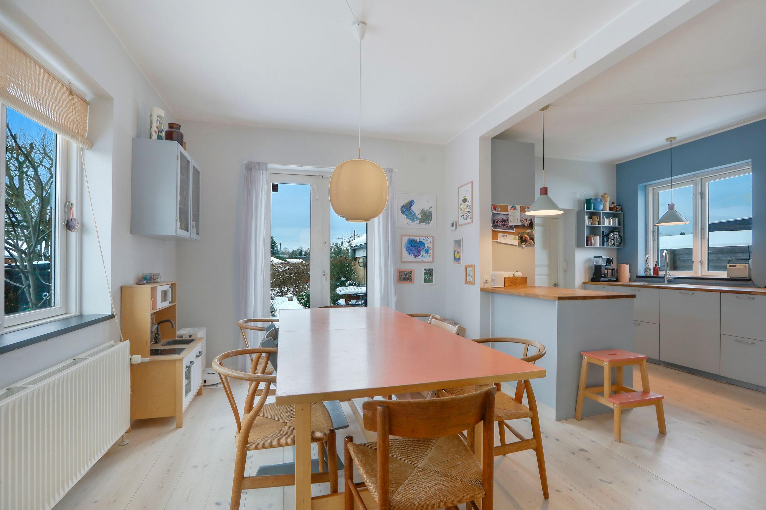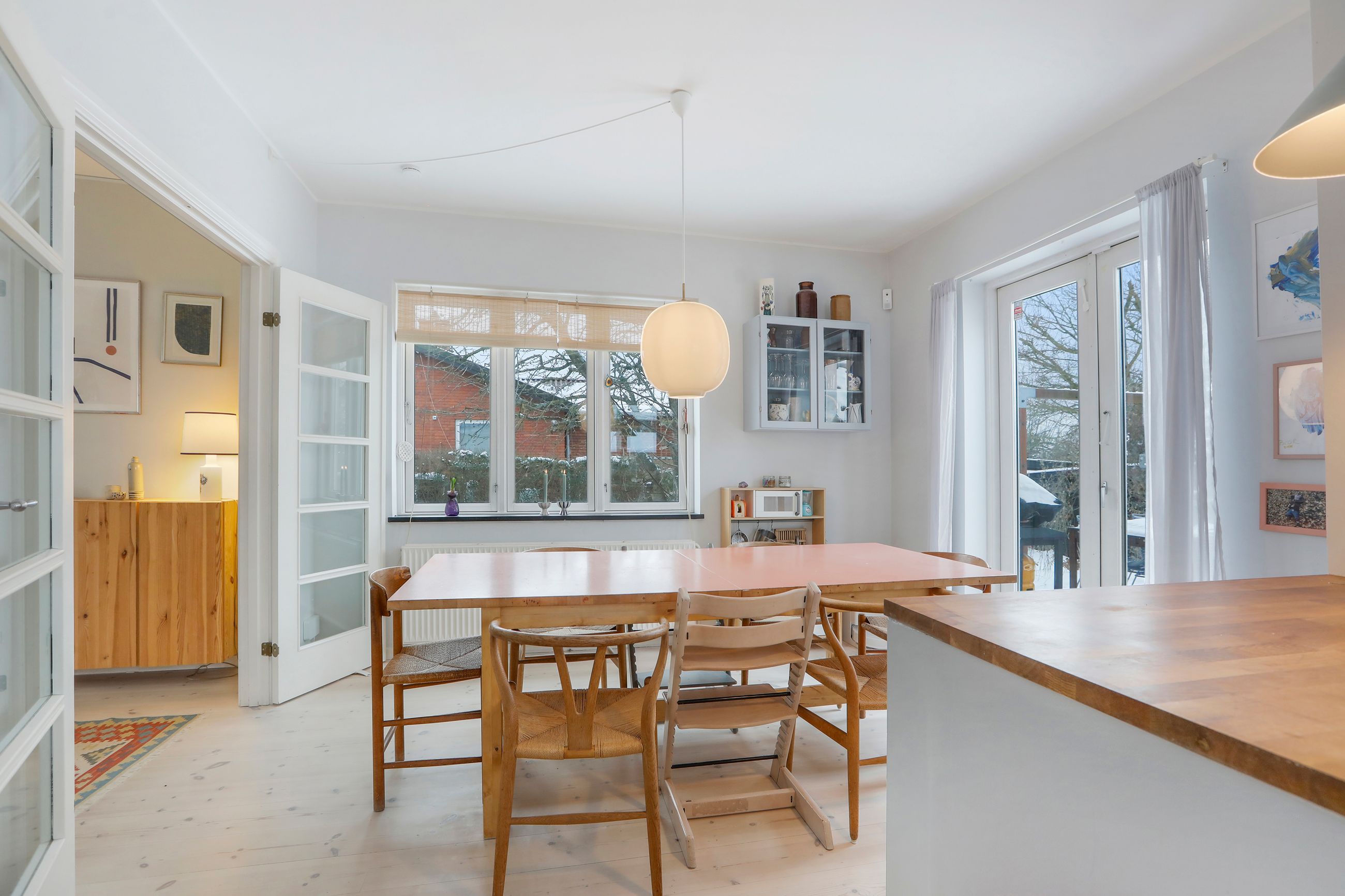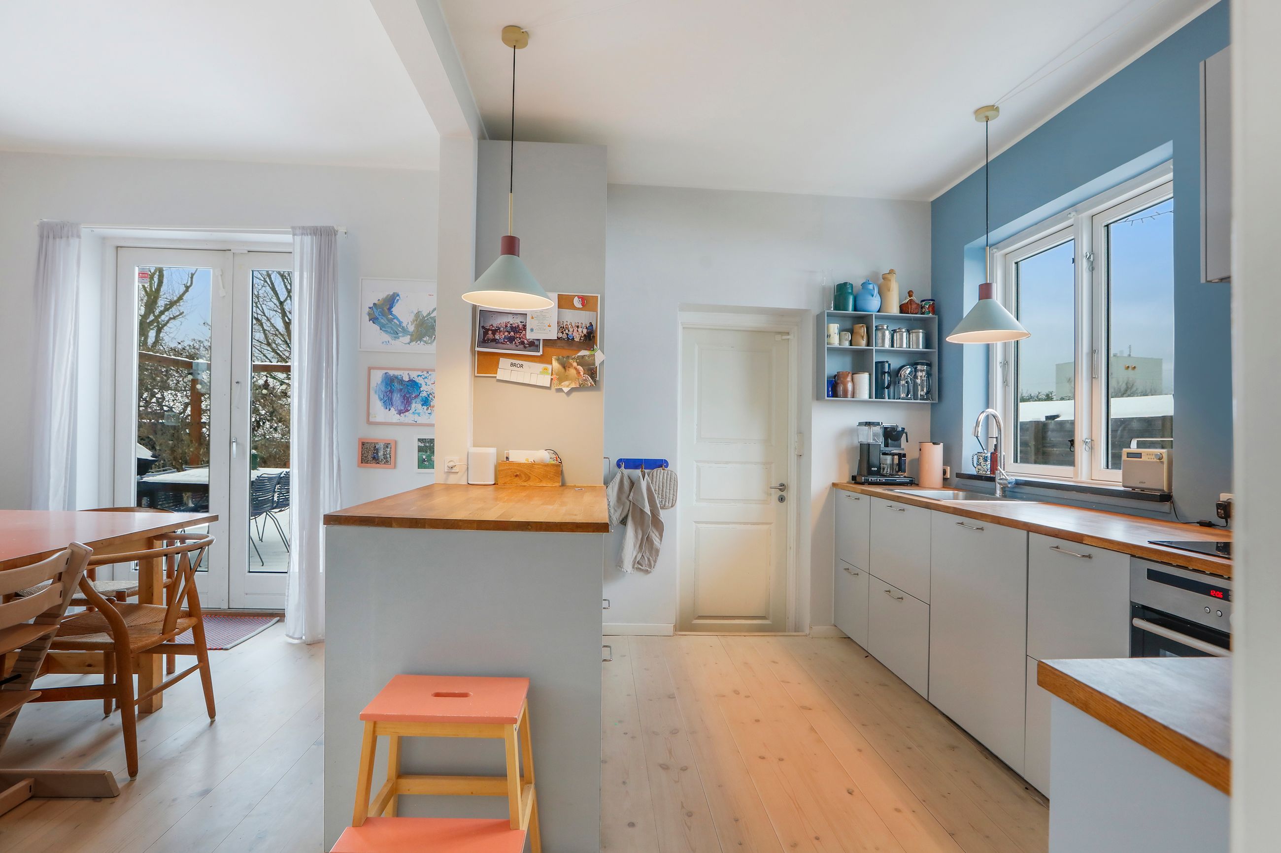 Køkkenet er elegant designet med grå elementer, der smukt bryder det klassiske lyse look og skaber en stilfuld atmosfære. Det åbne køkken ligger i forbindelse med spisestuen, hvilket gør det nemt at underholde gæster eller nyde familiemiddage. Fra spisestuen kan du træde direkte ud på den store solrige terrasse – et perfekt sted at nyde morgenkaffen eller grille om aftenen.