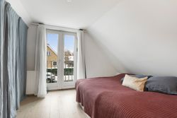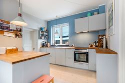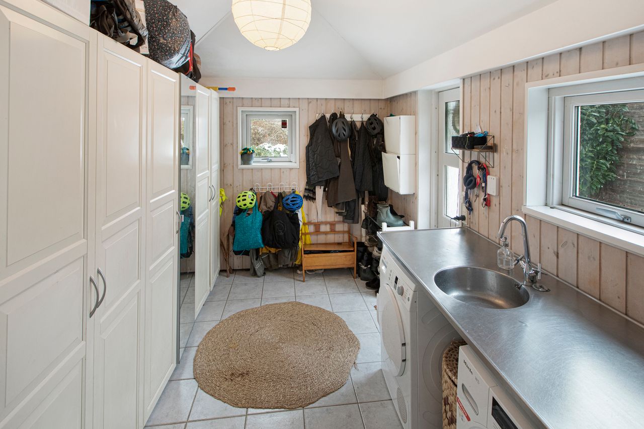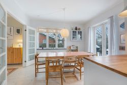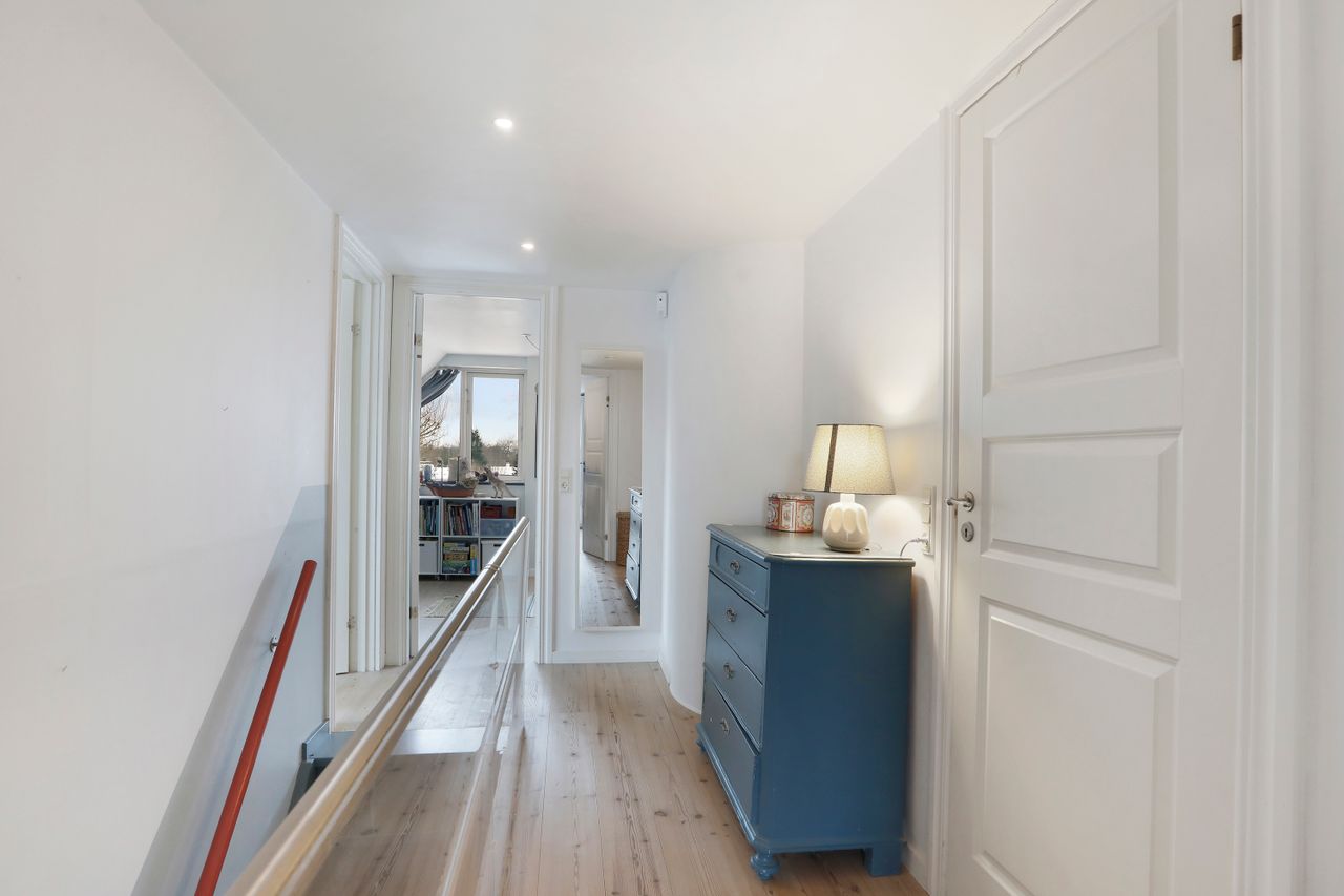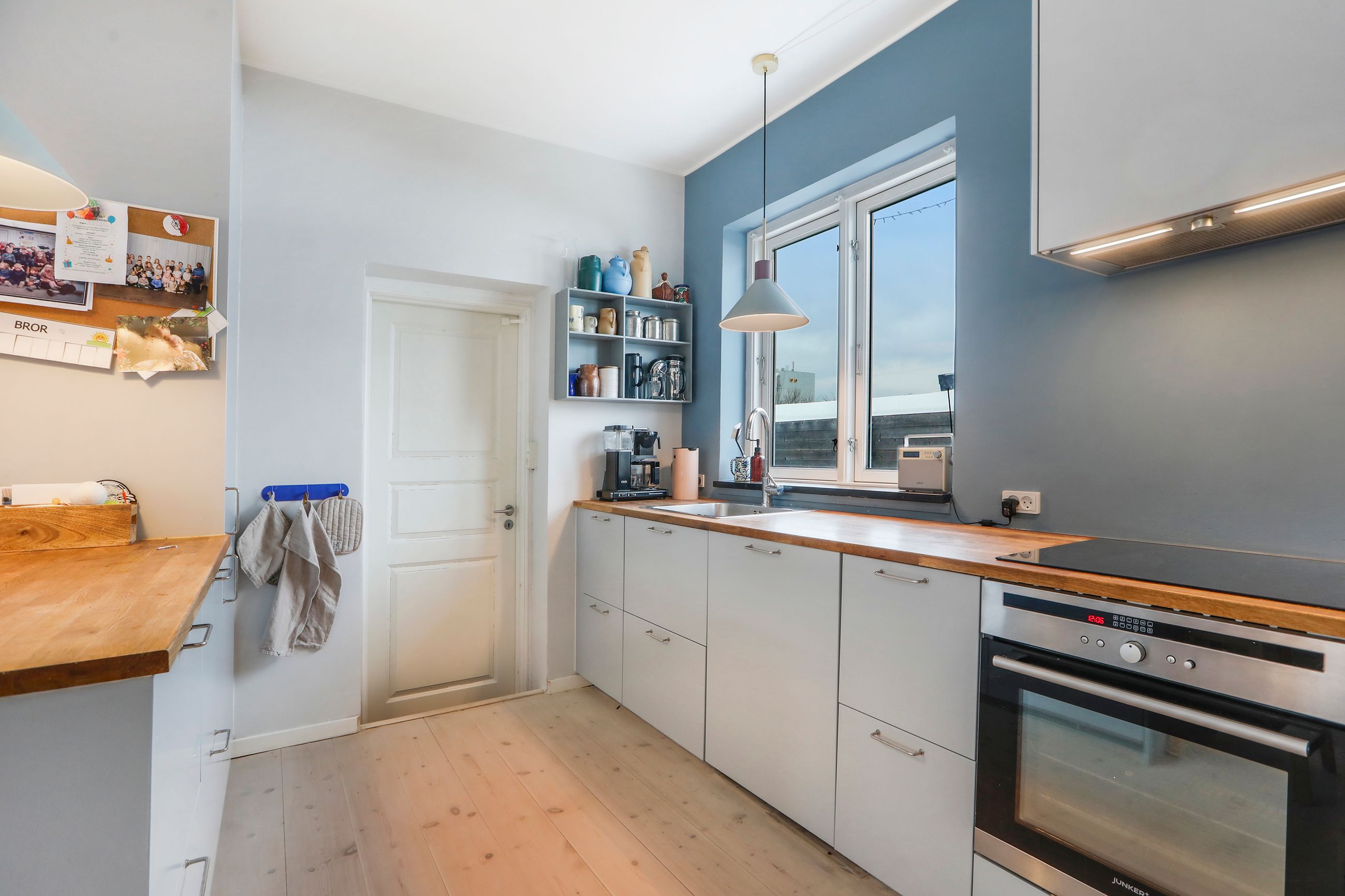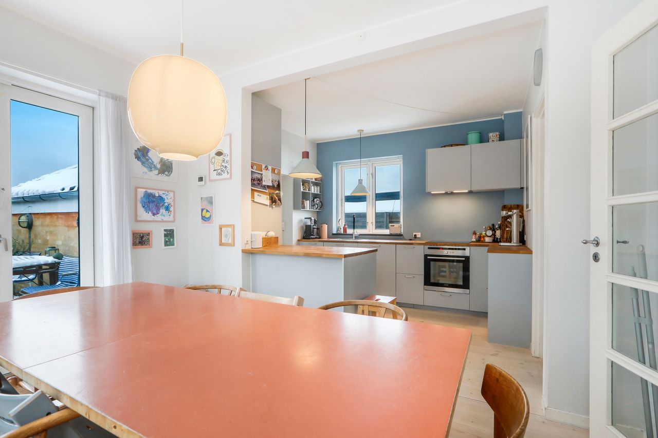 Køkkenet er elegant designet med grå elementer, der smukt bryder det klassiske lyse look og skaber en stilfuld atmosfære. Det åbne køkken ligger i forbindelse med spisestuen, hvilket gør det nemt at underholde gæster eller nyde familiemiddage. Fra spisestuen kan du træde direkte ud på den store solrige terrasse – et perfekt sted at nyde morgenkaffen eller grille om aftenen.