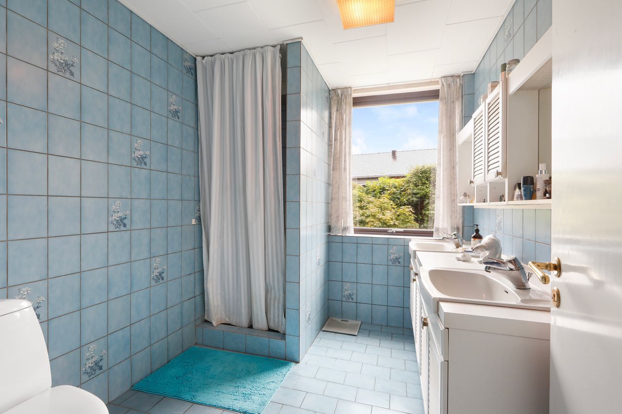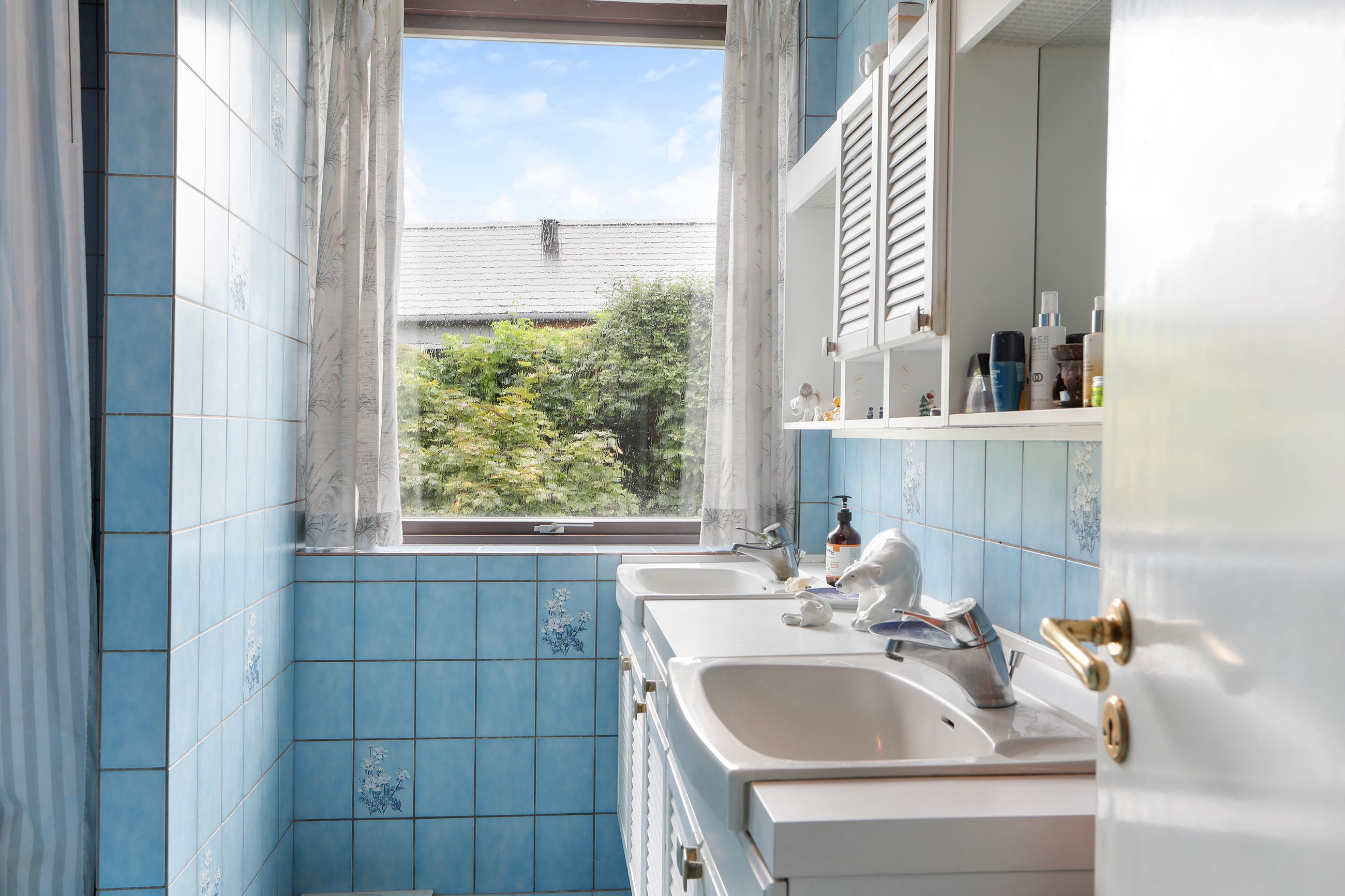 Husets badeværelset er lyst og stort nok til både badekar og brusekabine samt rigelig opbevaringsplads.