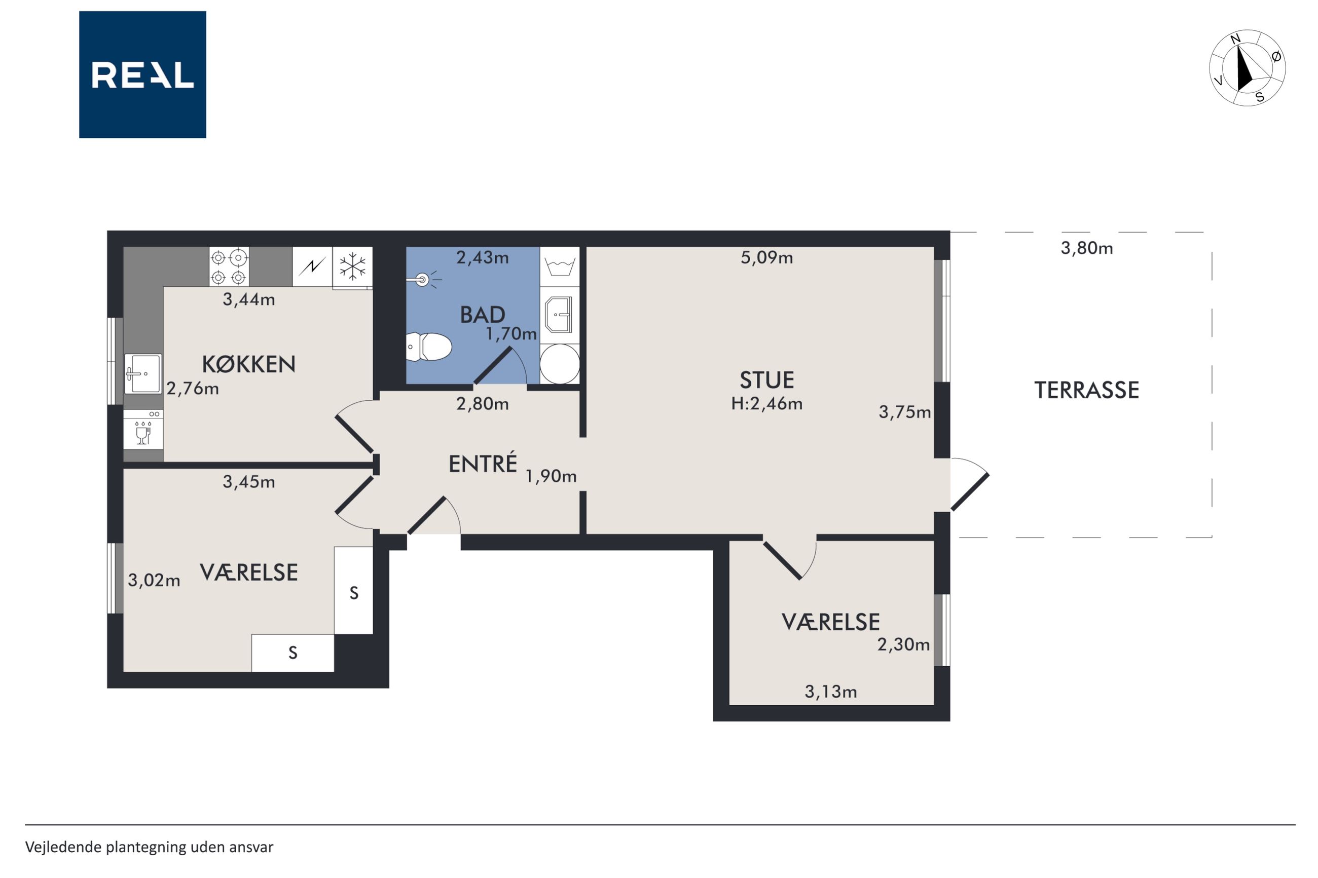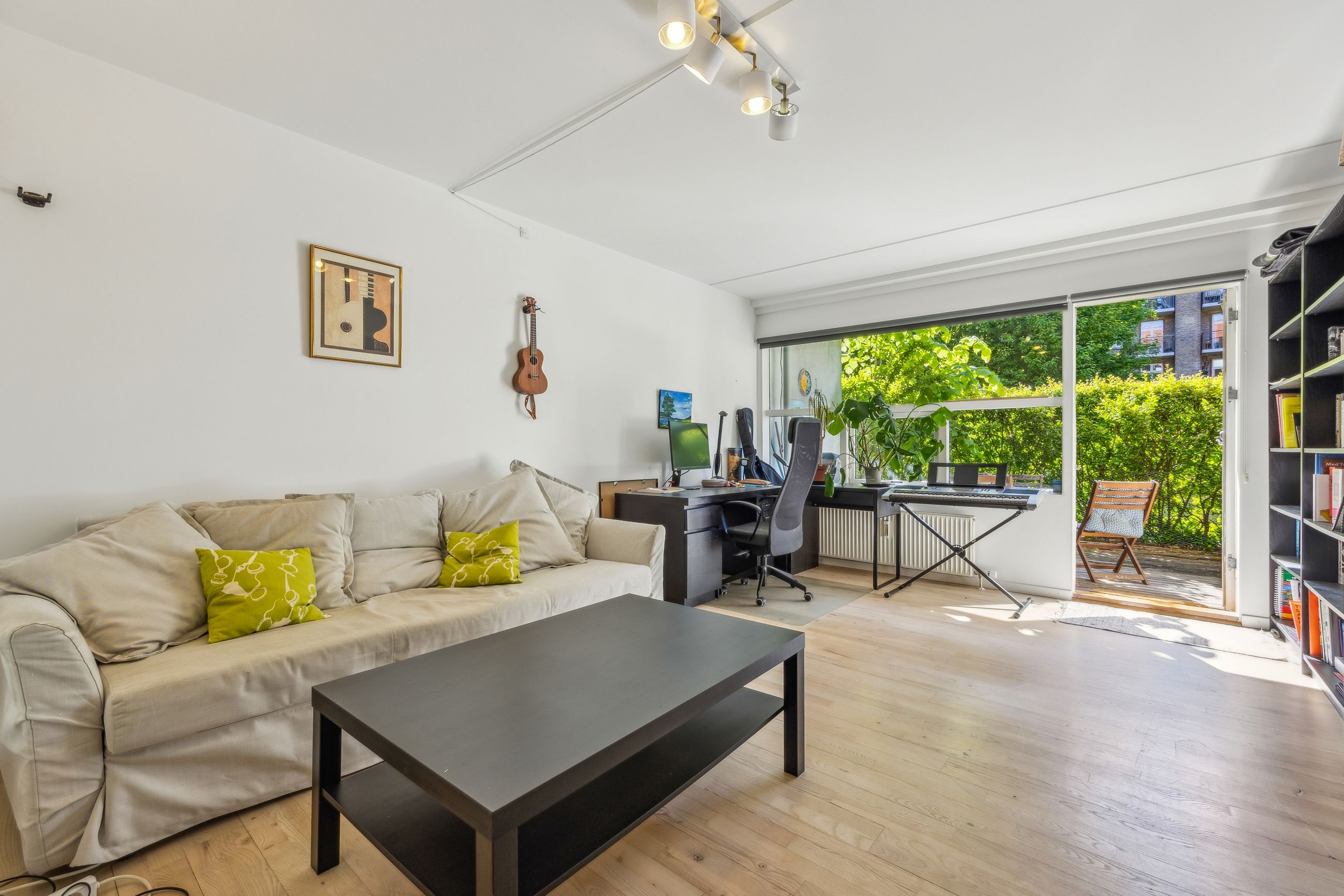Lejligheden byder på 77 veludnyttede og moderne kvadratmeter i stueplan. Du bliver budt velkommen af en lys og rummelig entré, der giver adgang til alle lejlighedens muligheder. På højre hånd fra entréen træder du ind i hjemmets hjerte og samlingspunkt, den rummelige stue, der både har plads til spisebord og opholdsstue med sofaarrangement. Stuen fuldendes med sin direkte udgang til lejlighedens private have, hvor du kan nyde sommeraftenerne.
